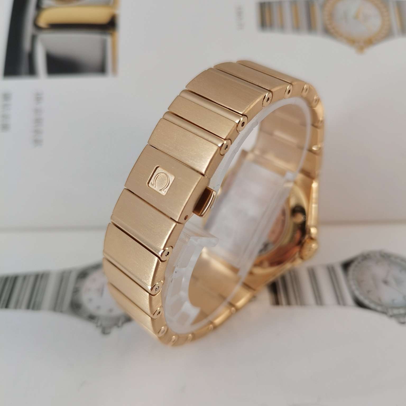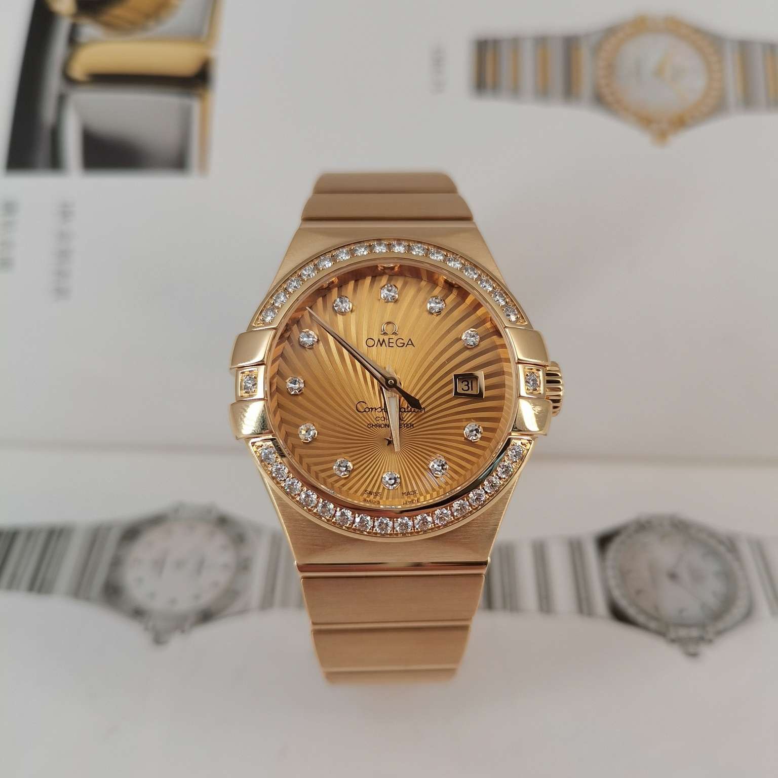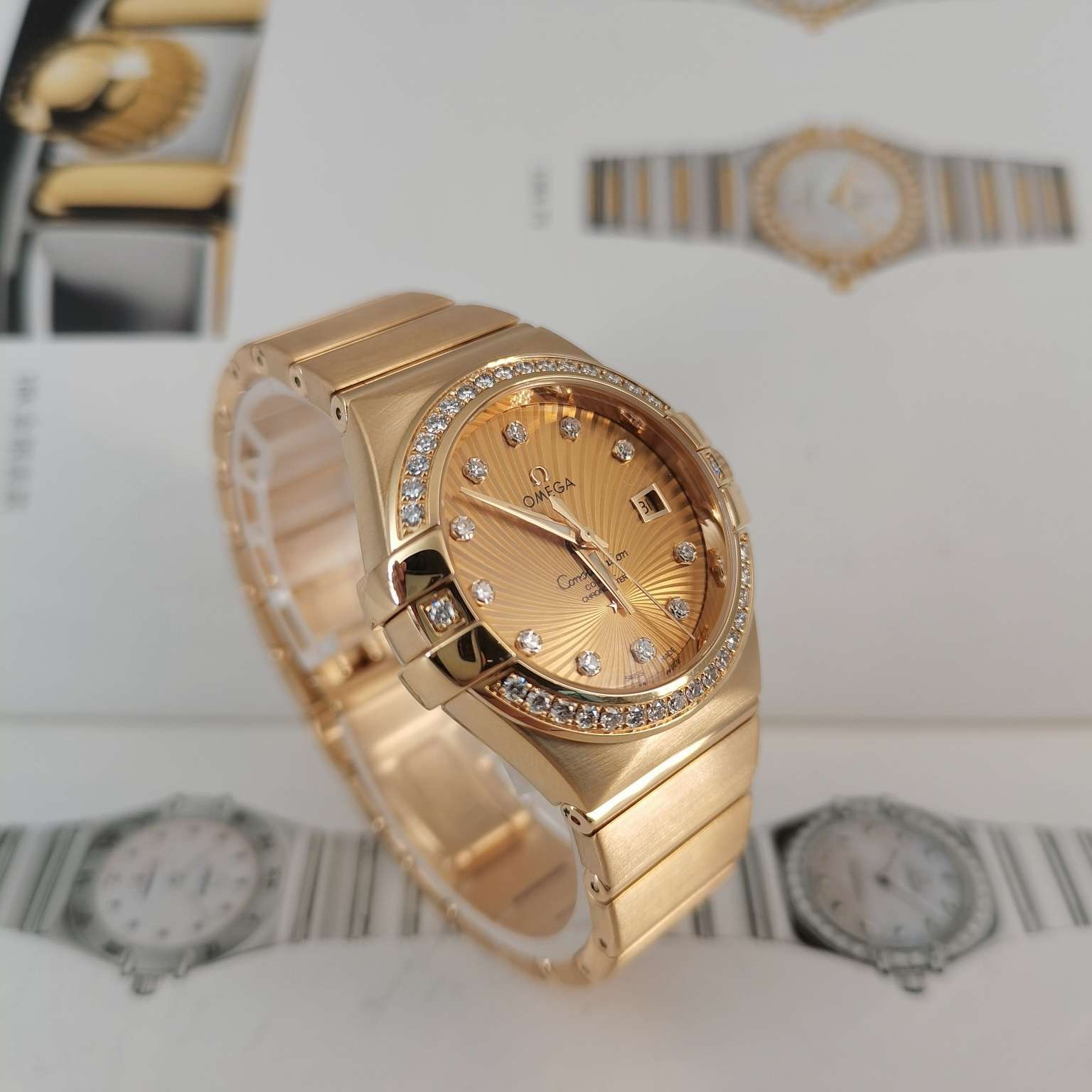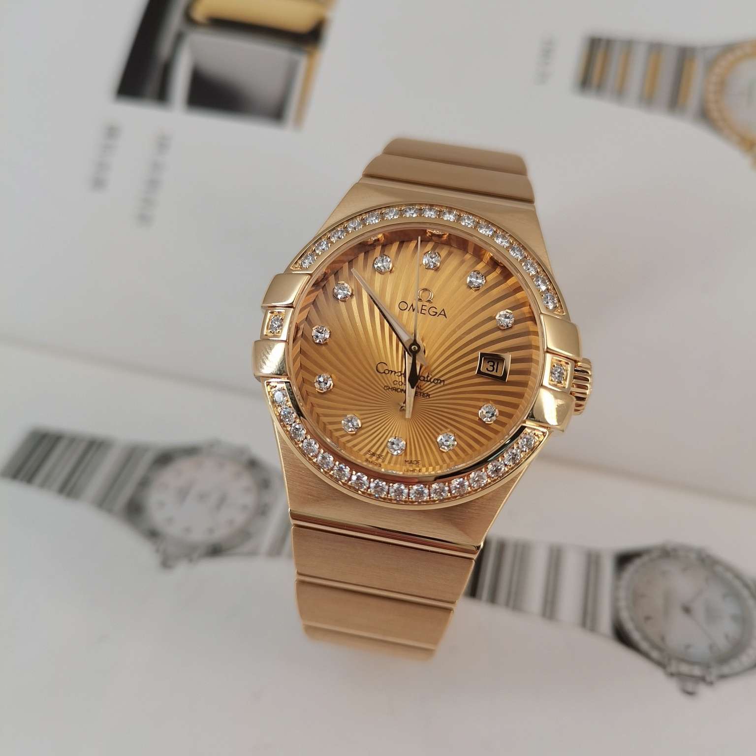全套欧米茄星座系列女士腕表 型号:123.55.31.20.58.001 整表18k黄金材质 自动机械透底机芯 表圈镶钻 31mm太阳放射图案圆形表盘 钻石时标搭配夜光指针 3 点位日历显示窗 折叠表扣方便佩戴。公价197400 现货好价得~