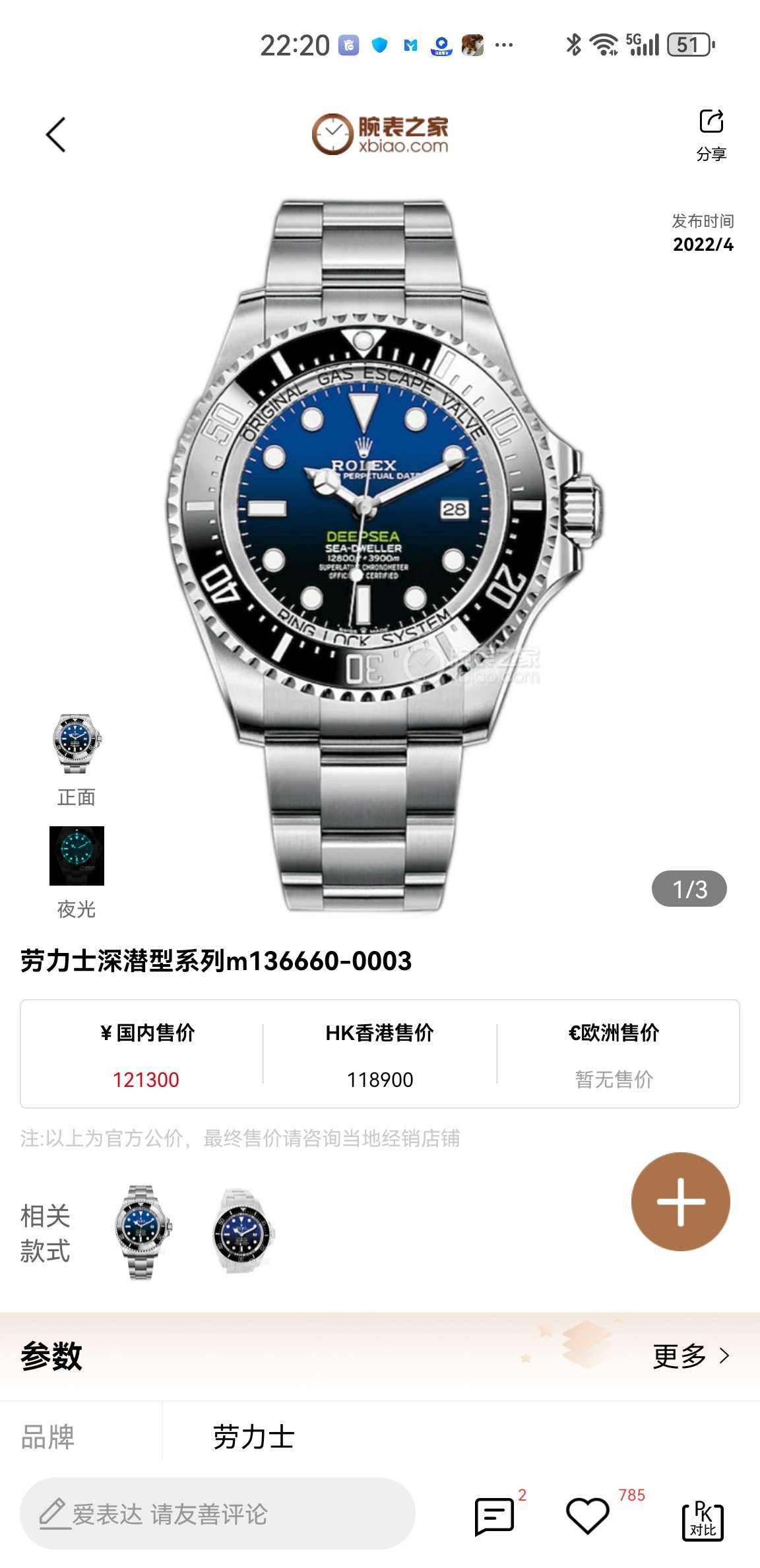 品牌:劳力士 系列:深潜型系列 型号:136660-0003 “渐变鬼王”,材质:精钢 镜面:蓝宝石玻璃 表盖:密底 表扣:折叠扣 表径:44mm 机芯类型:自动机械机芯