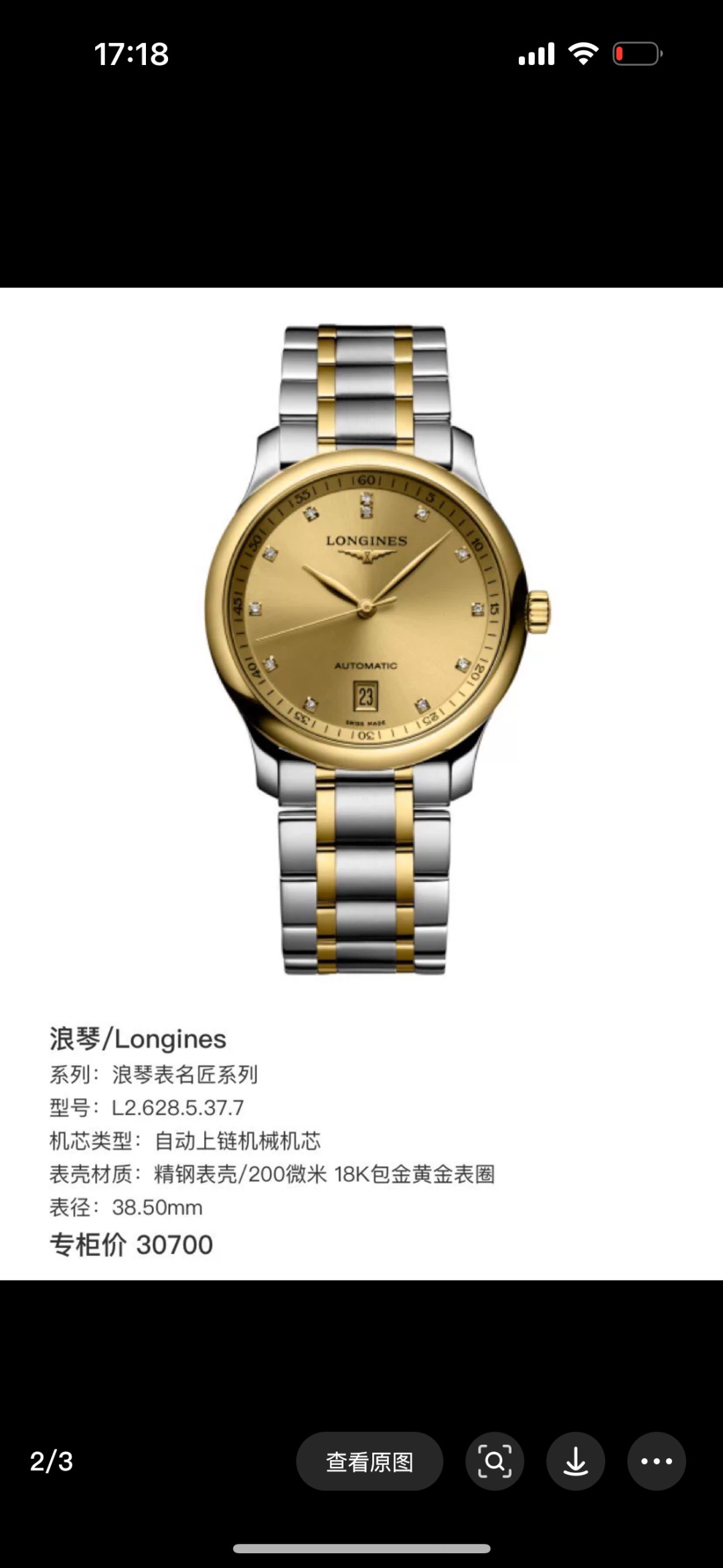 浪琴/Longines 浪琴表名匠系列 L2.628.5.37.7 自动上链机械机芯 18K包金黄金表圈 38.50mm