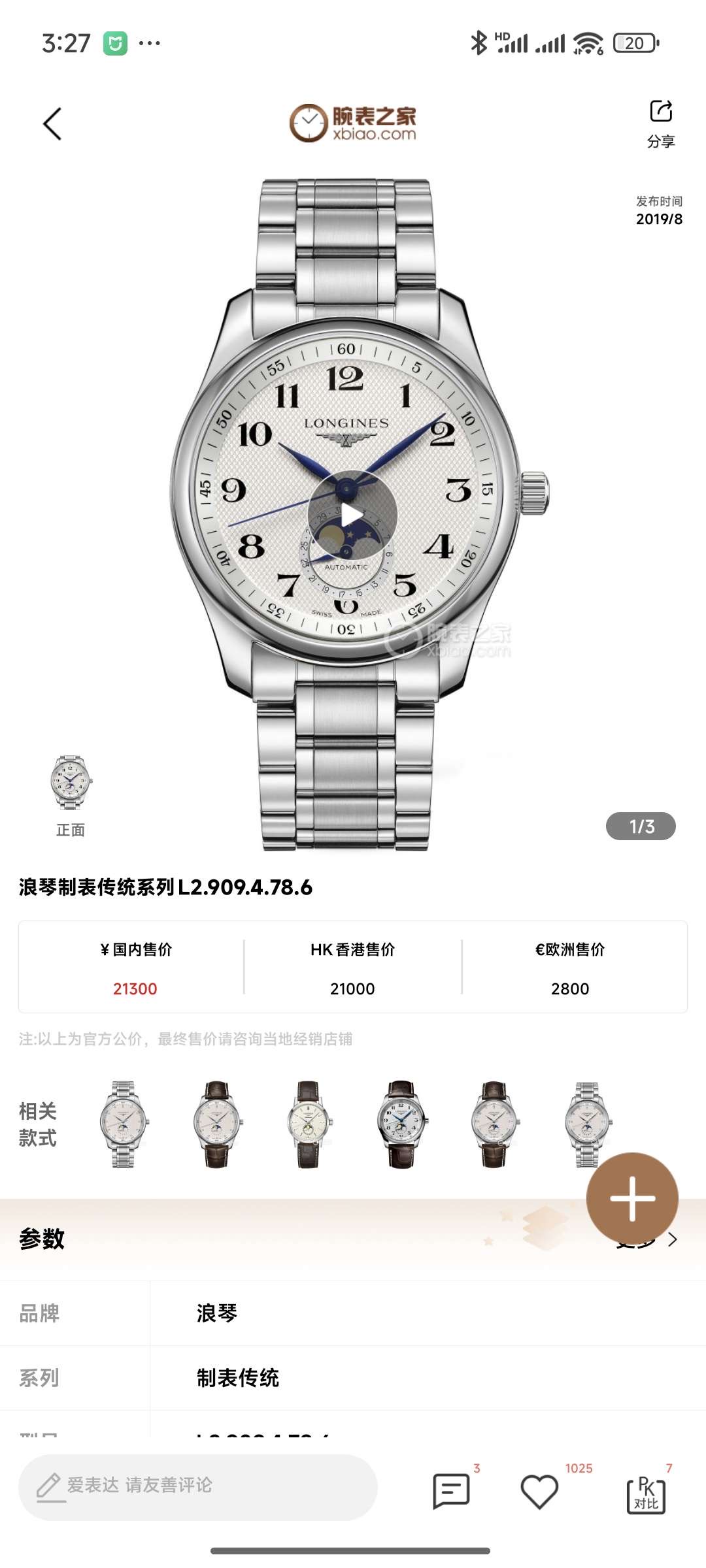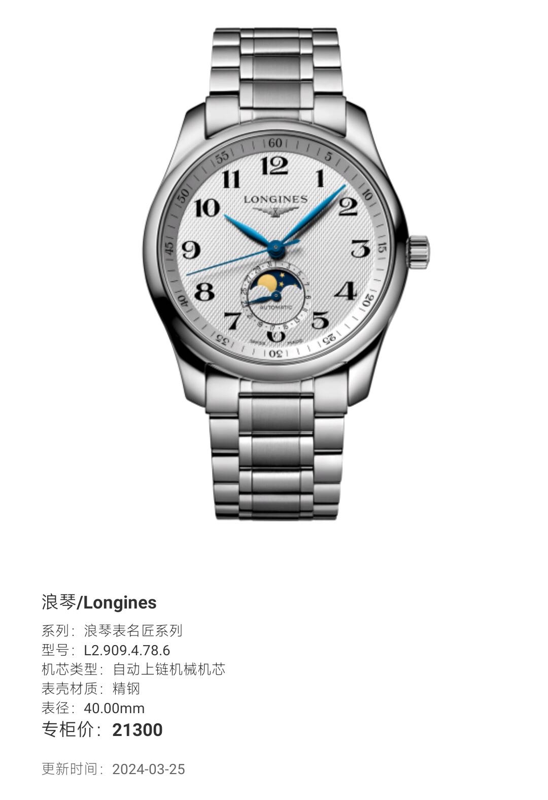浪琴/Longines 浪琴表名匠系列 L2.909.4.78.6 自动上链机械机芯 精钢 40.00mm 专柜价21300