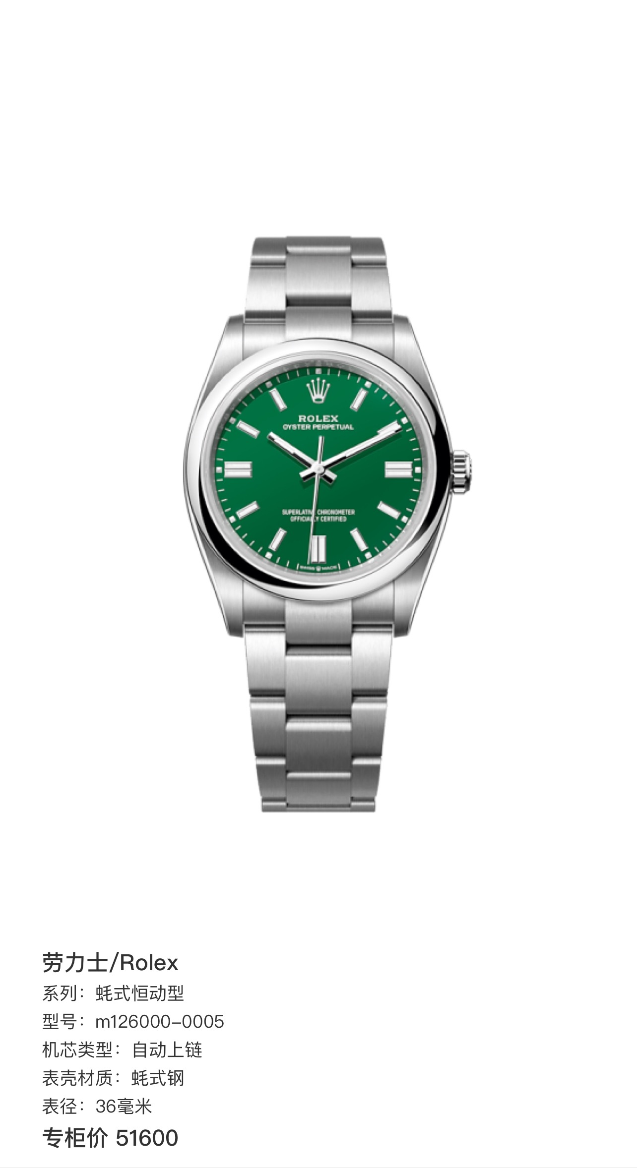 劳力士/Rolex 蚝式恒动型 m126000-0005 自动上链 蚝式钢 23年全套 36毫米 专柜价:51600元