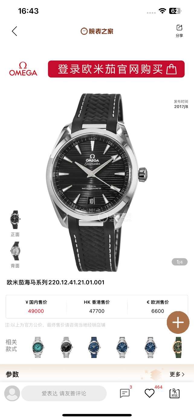 欧米茄海马系列220.12.41.21.01.001 海马150 自动机械 41mm 日期显示 透底8900机芯 防磁功能 24年全套 公价49000 现货好价~