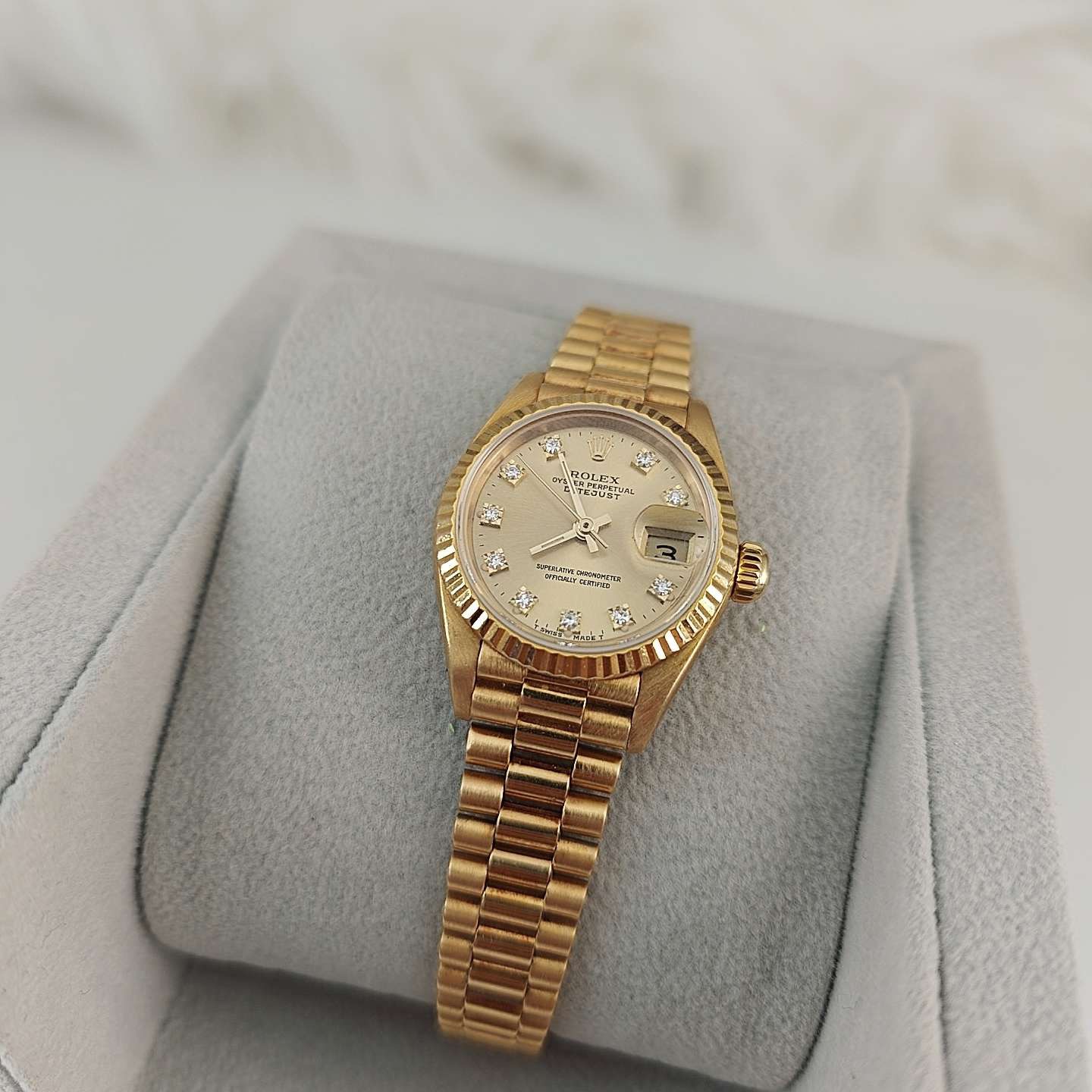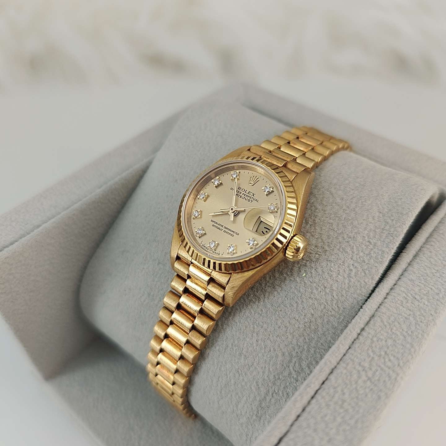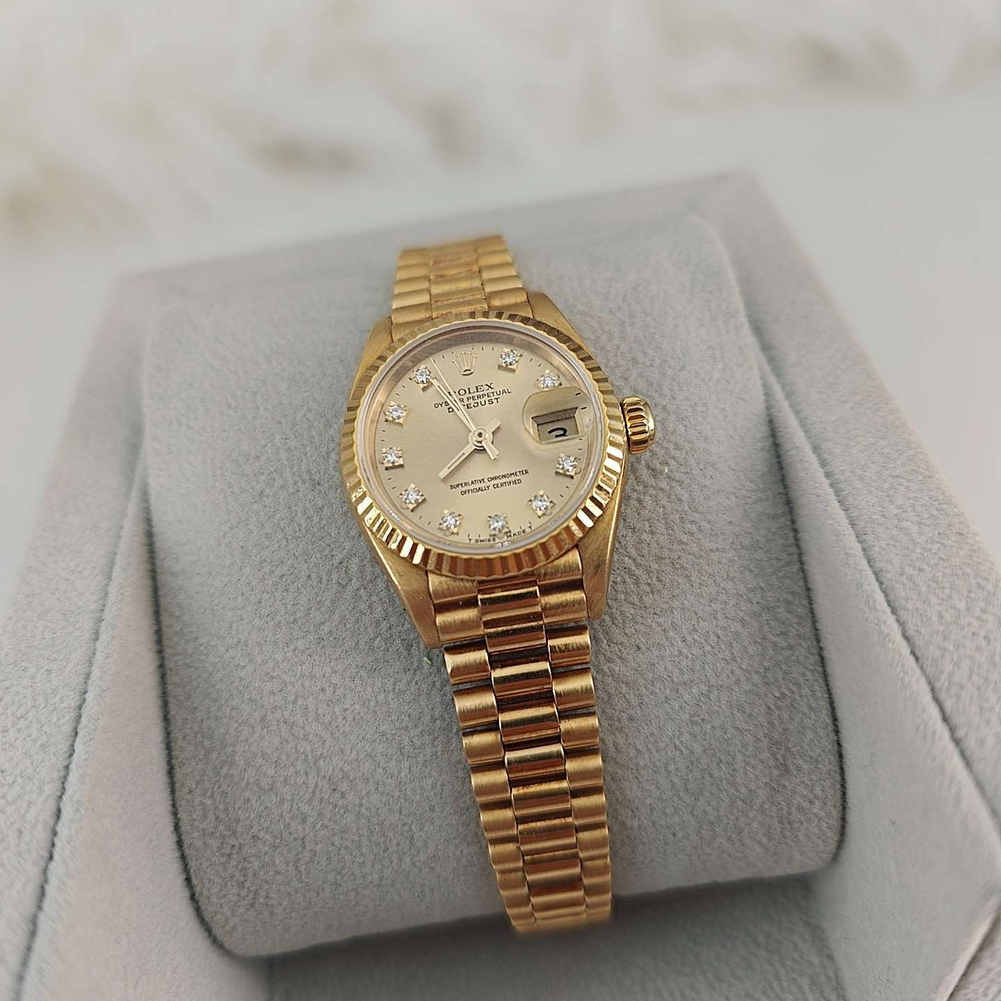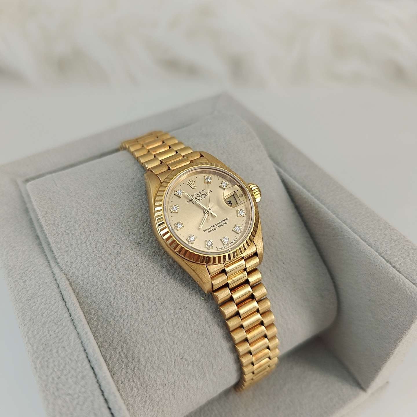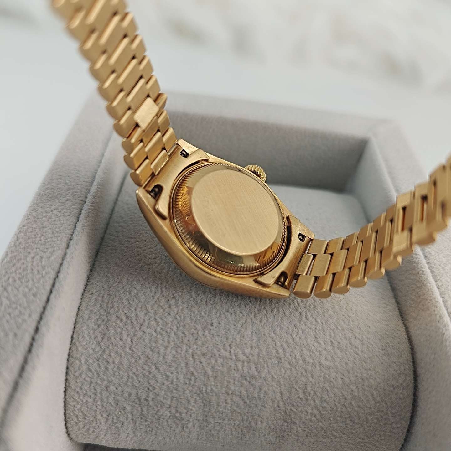 劳力士日志69178女士腕表 18k黄金材质外观,自动机械机芯 26mm金色圆形表盘饰有钻石时标和日历显示,折叠表扣,公价198000