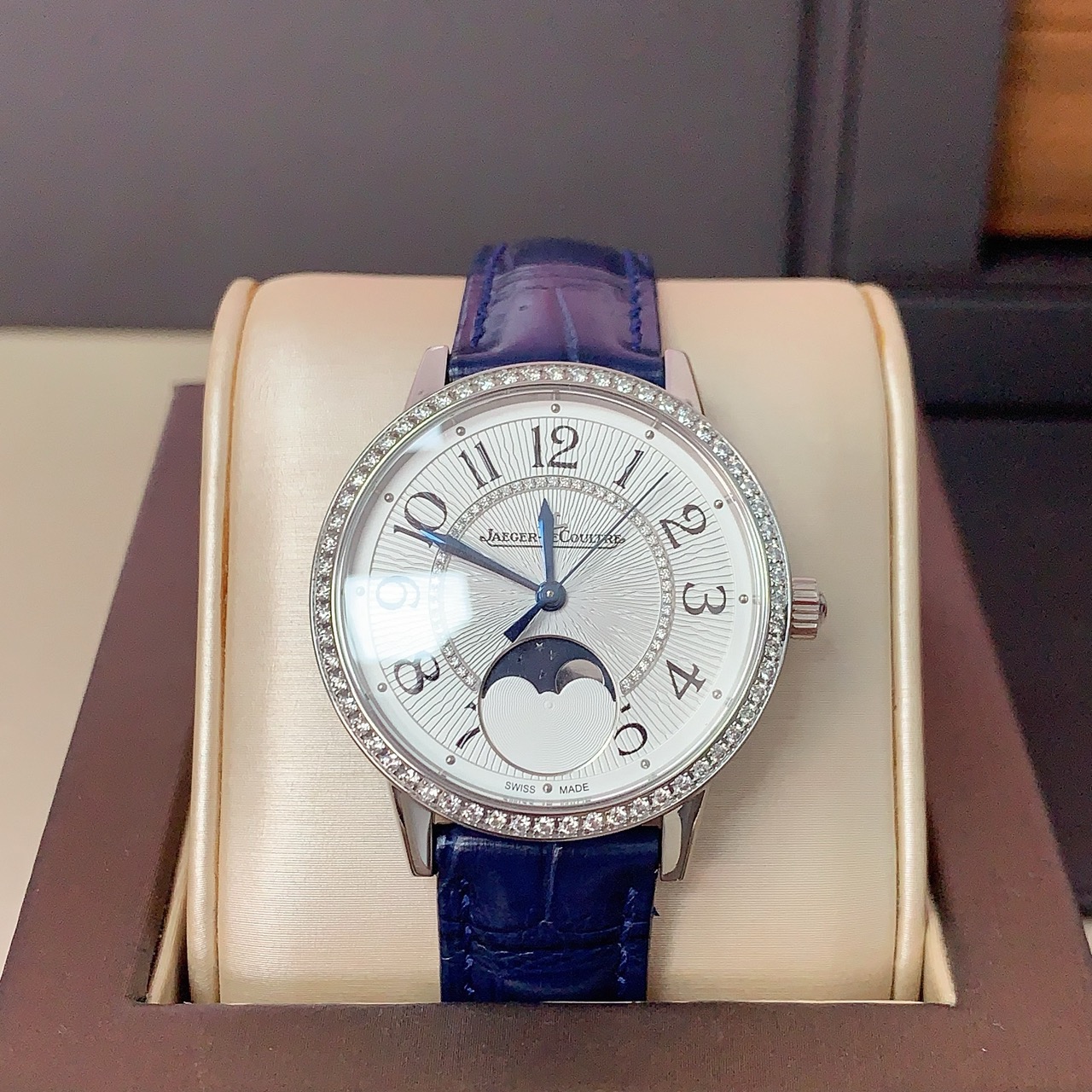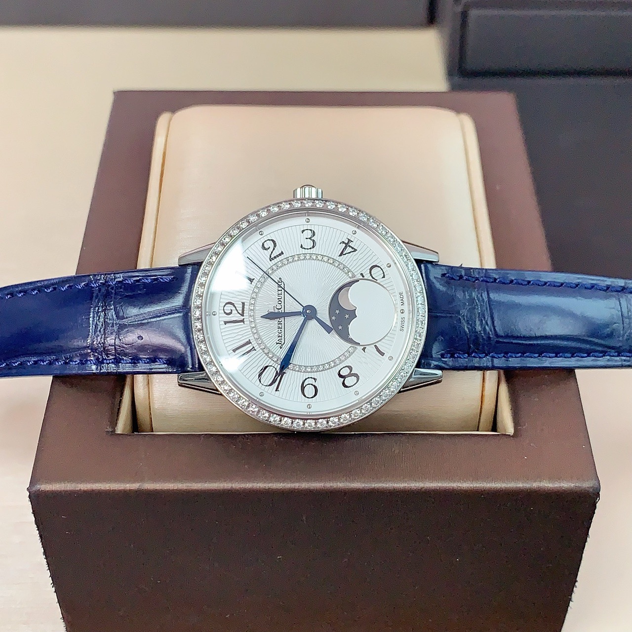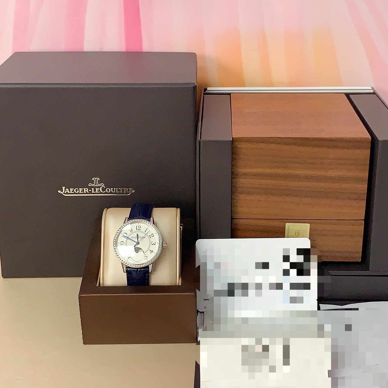 积家Q3578430,自动机械机芯 : 925A/1,表径:34mm,表壳厚度:9.56mm,精钢表壳,纽索饰纹表盘,内表盘和谐对称的点缀47颗美钻,表圈镶嵌60颗明亮式切割圆钻,六点位月相盘,鳄鱼皮表带,动力储存:38小时,专柜价142000