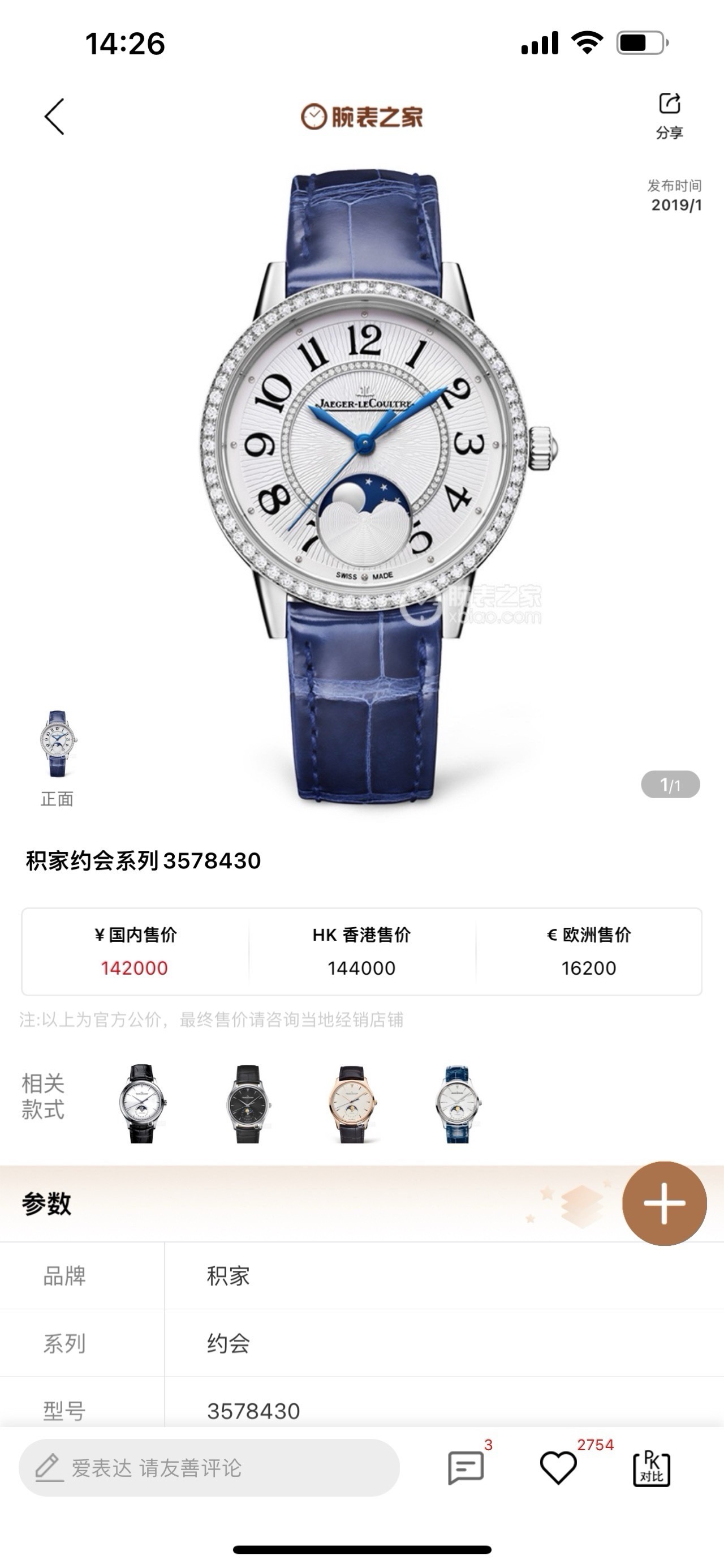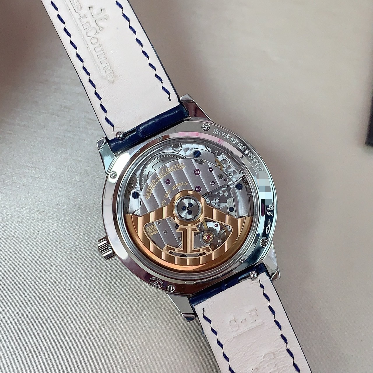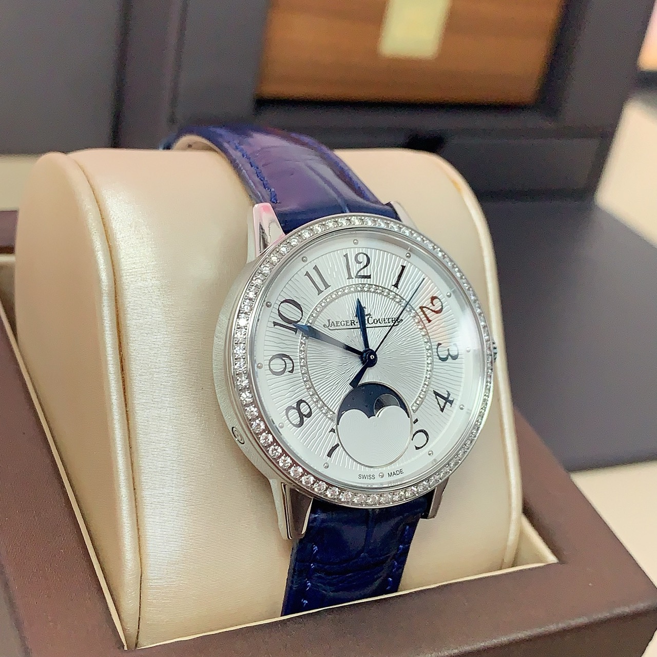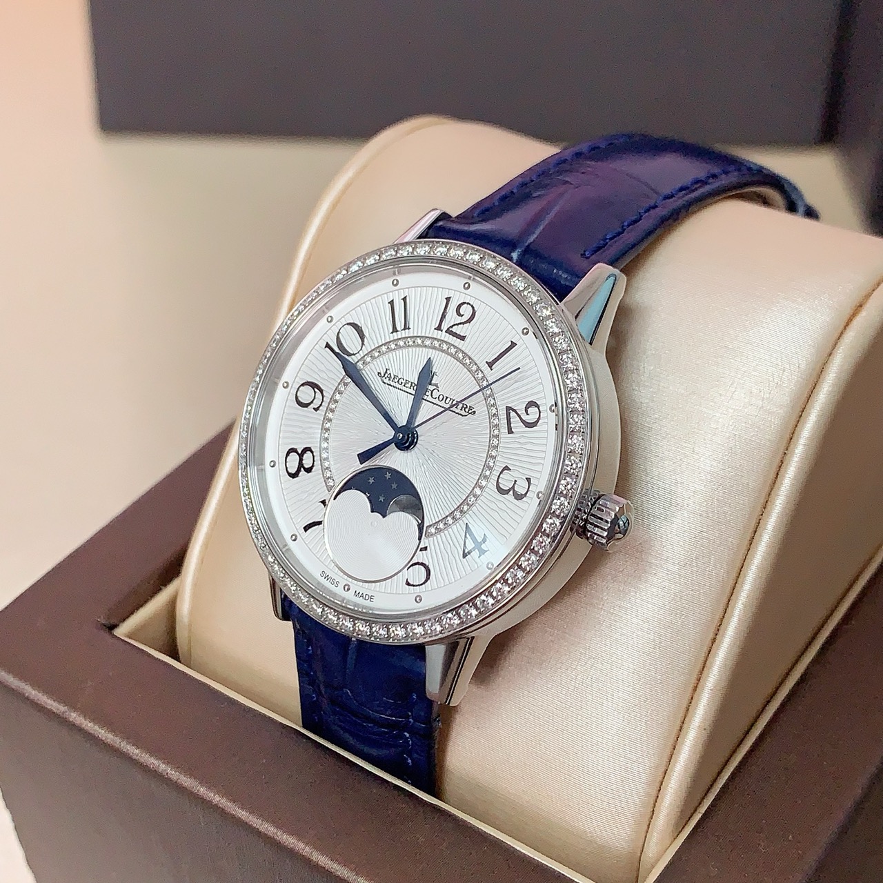 积家Q3578430,自动机械机芯 : 925A/1,表径:34mm,表壳厚度:9.56mm,精钢表壳,纽索饰纹表盘,内表盘和谐对称的点缀47颗美钻,表圈镶嵌60颗明亮式切割圆钻,六点位月相盘,鳄鱼皮表带,动力储存:38小时,专柜价142000