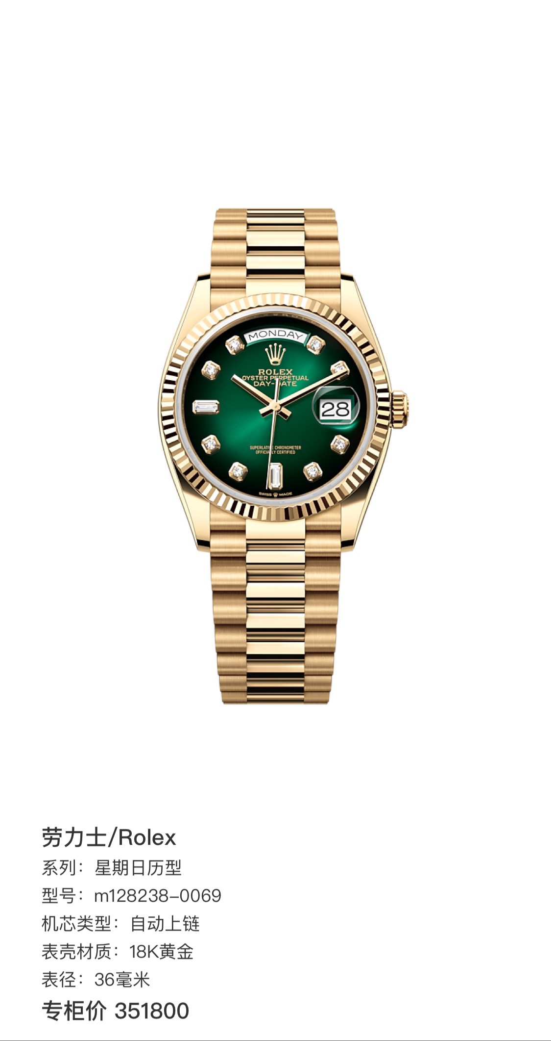 劳力士/Rolex 星期日历型 m128238-0069 自动上链 18K黄金 36毫米 附件,21年11月单表 专柜价351800