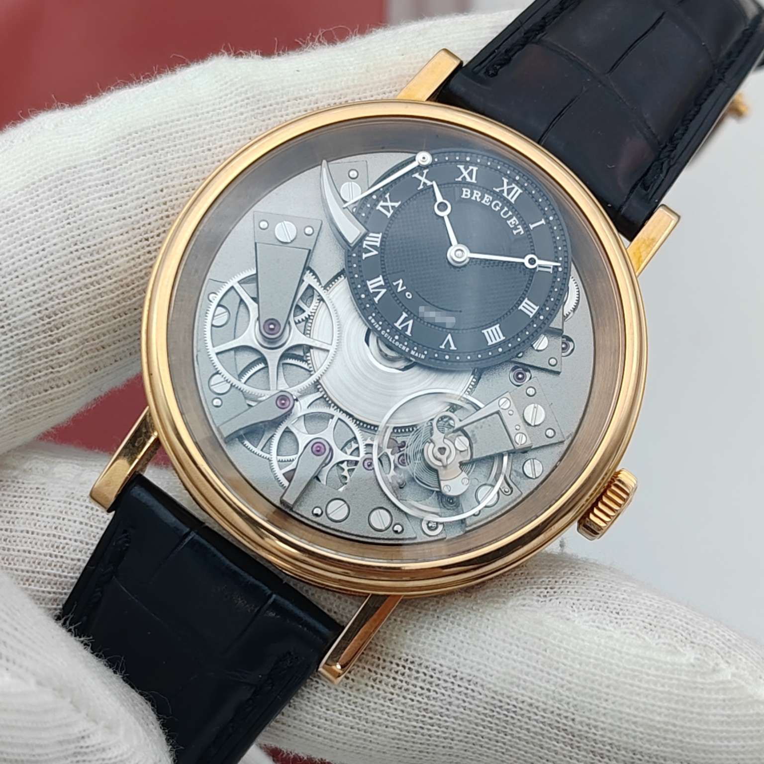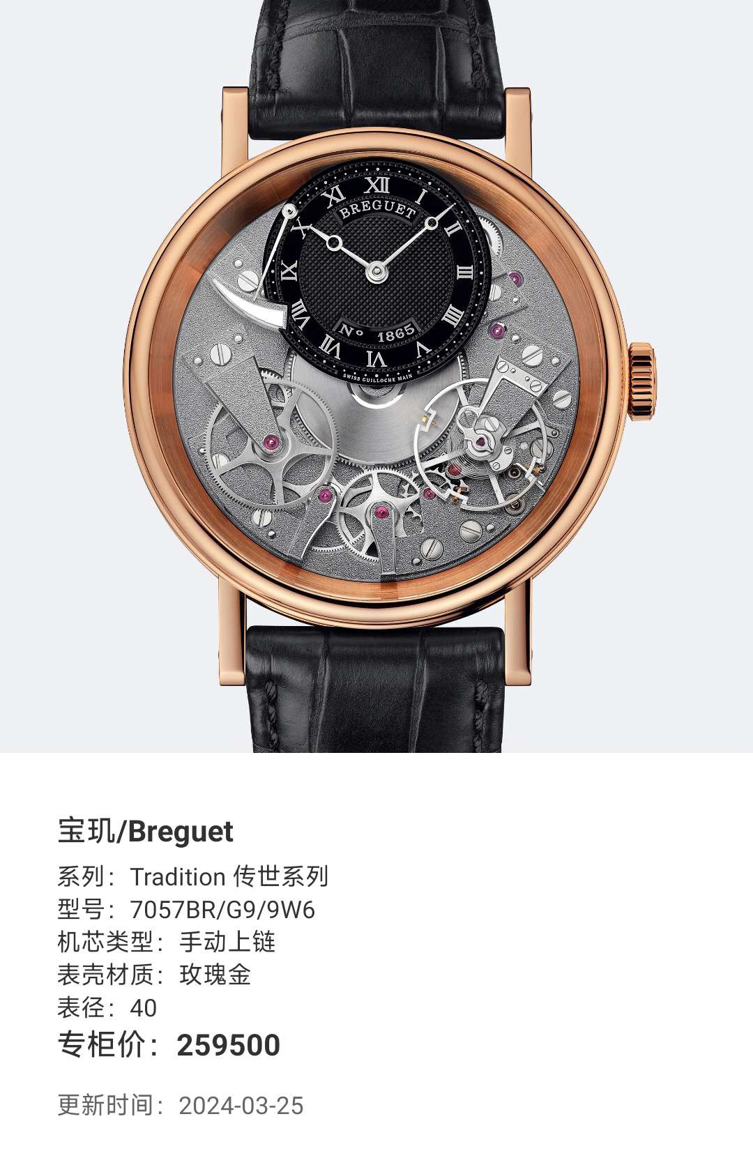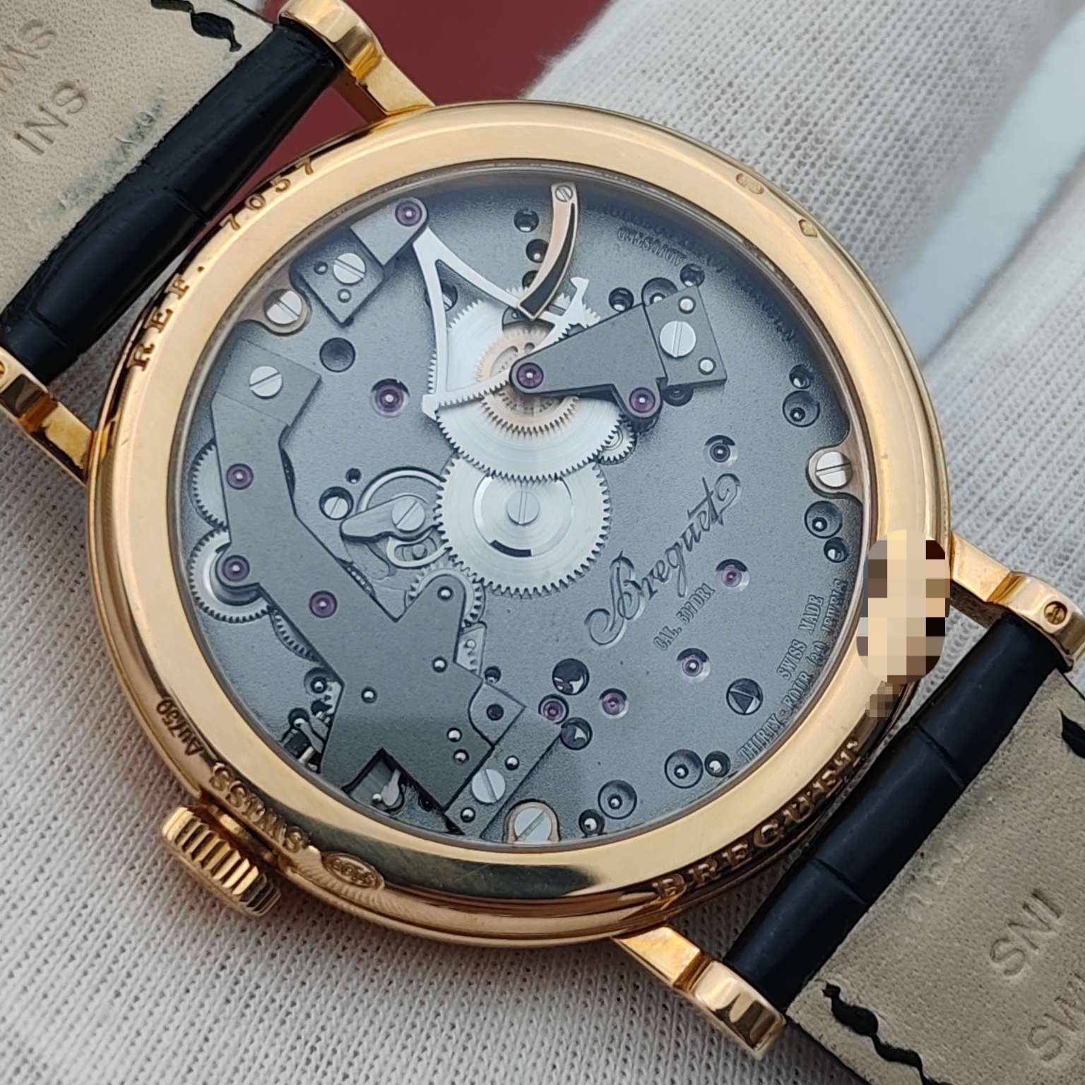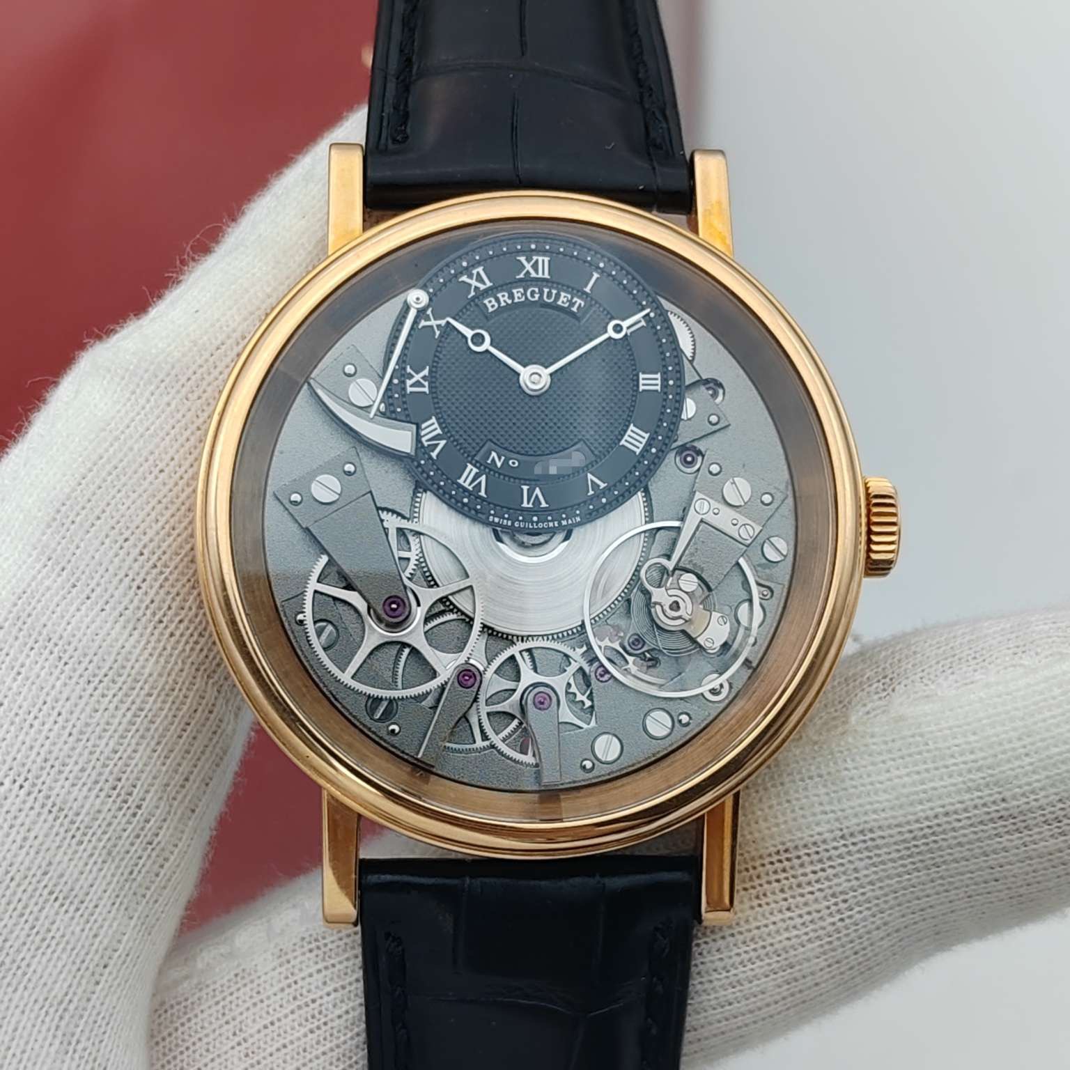 宝玑传世系列7057BR,18K玫瑰金材质打造,表径40mm,灰色黑色偏心设计表盘,反装机芯,带来不一样的机械美感,手动上链透底机芯,上手儒雅高贵,全透视机械结构盘面,经典钱币饰纹宝矶表壳设计,正面背面都有动力蓄能指示,原装金扣,专柜售价26万,极品成色单表,现货特价!~