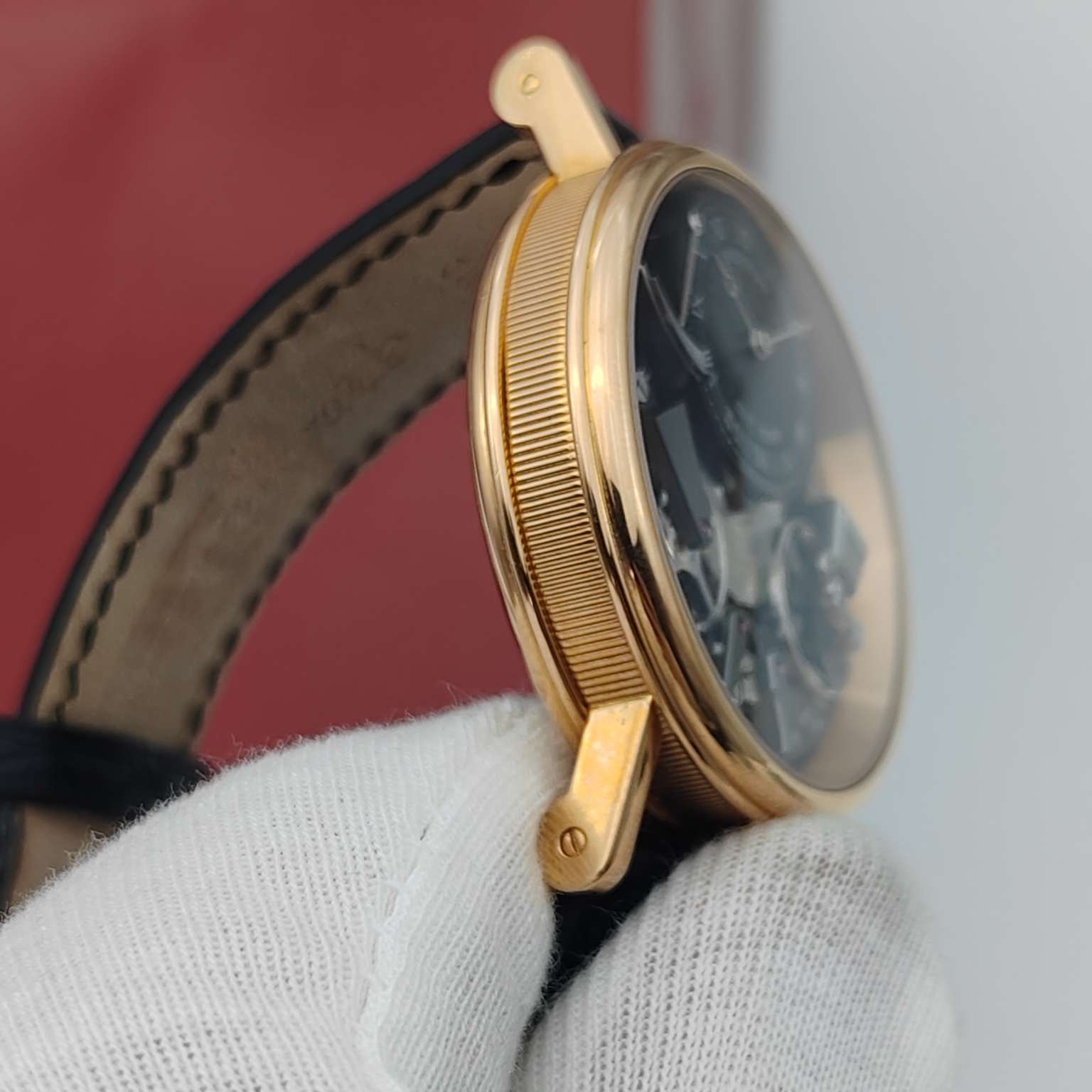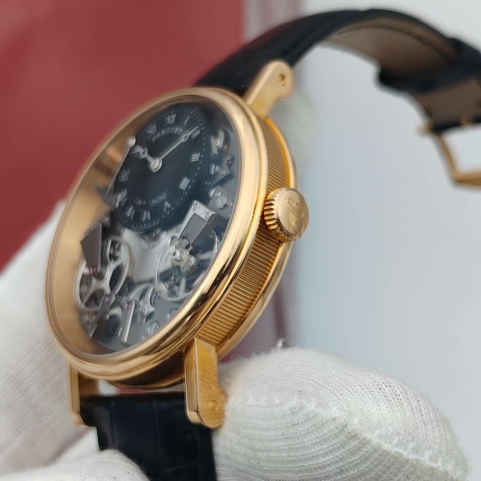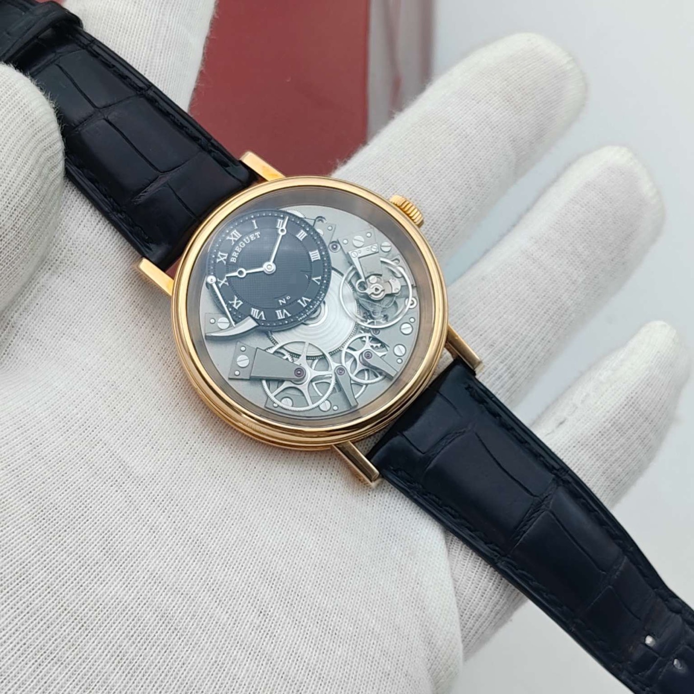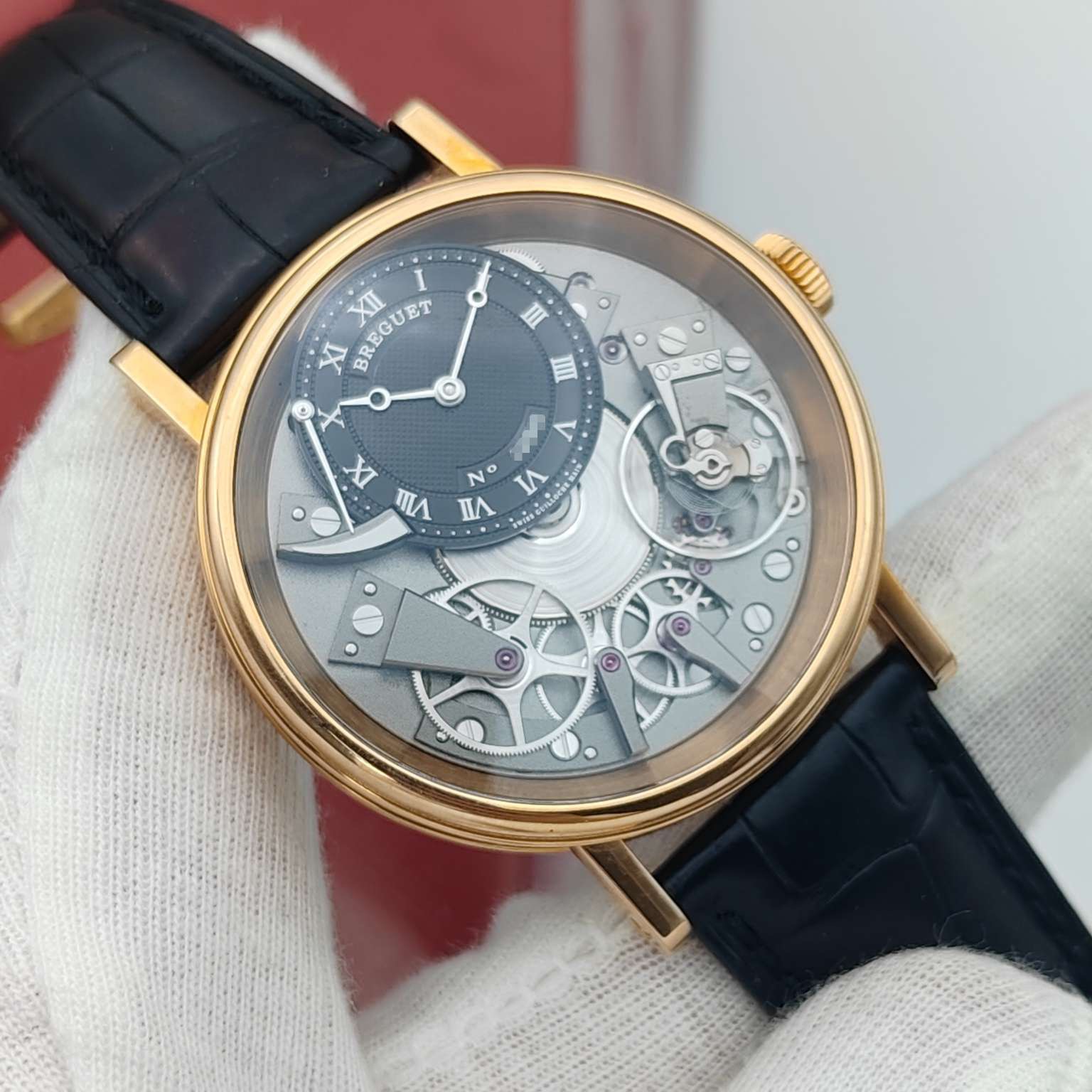 宝玑传世系列7057BR,18K玫瑰金材质打造,表径40mm,灰色黑色偏心设计表盘,反装机芯,带来不一样的机械美感,手动上链透底机芯,上手儒雅高贵,全透视机械结构盘面,经典钱币饰纹宝矶表壳设计,正面背面都有动力蓄能指示,原装金扣,专柜售价26万,极品成色单表,现货特价!~