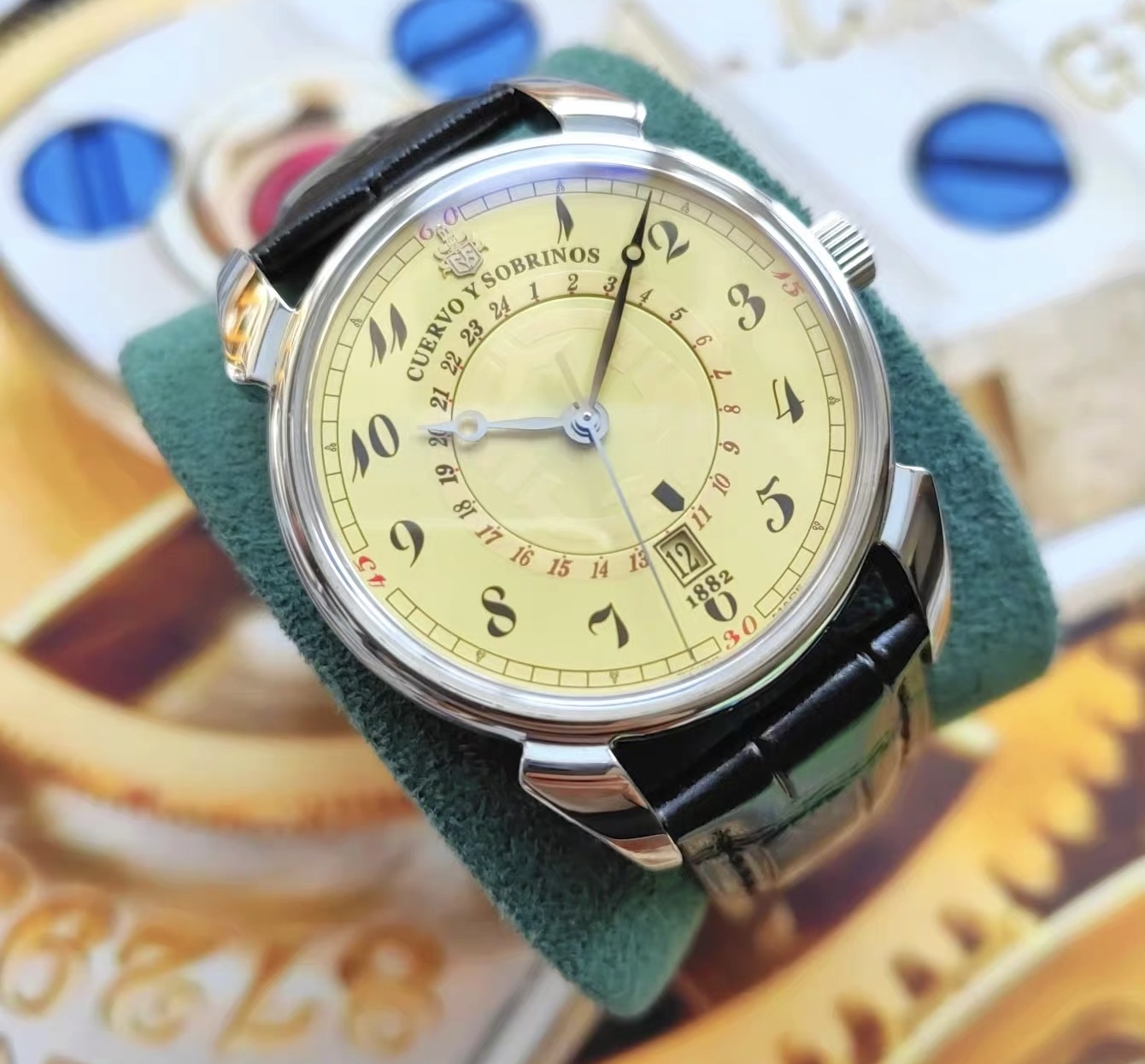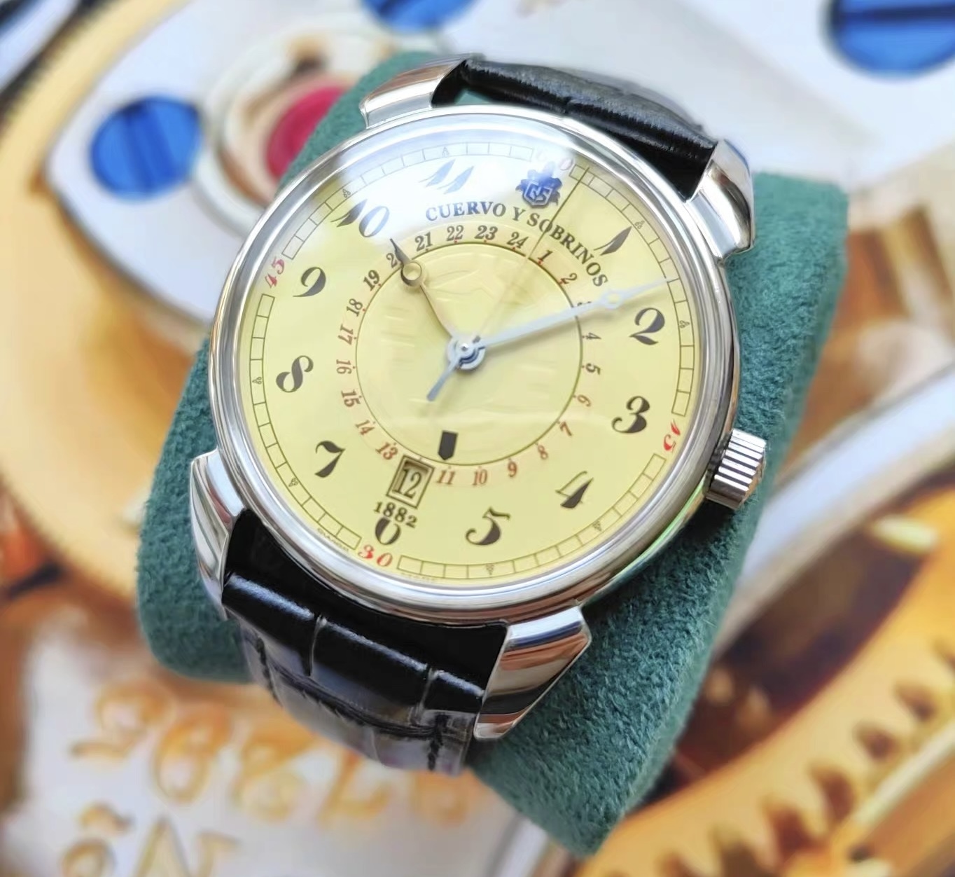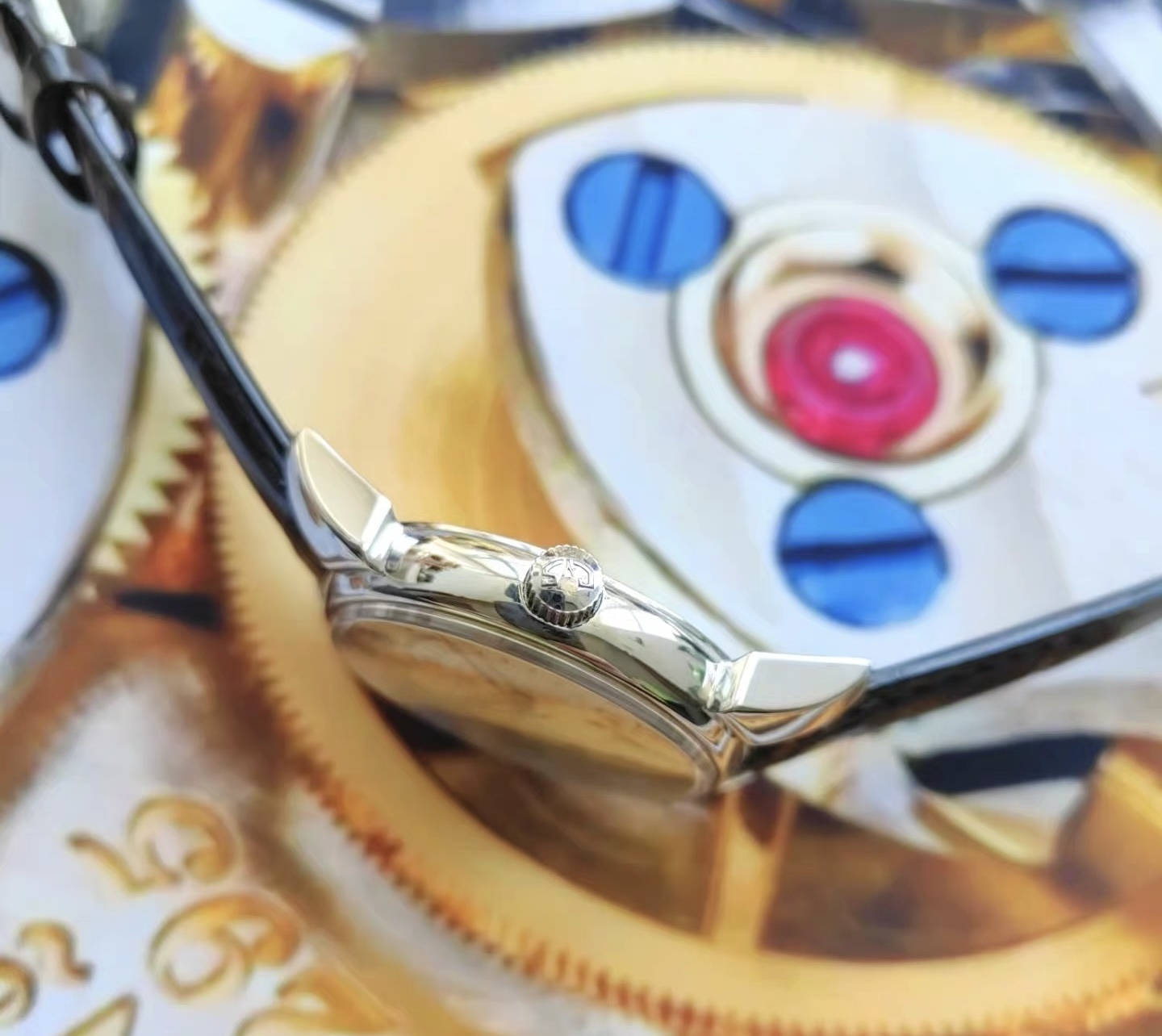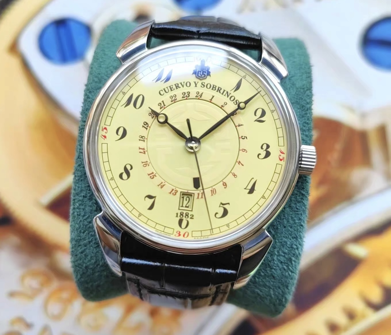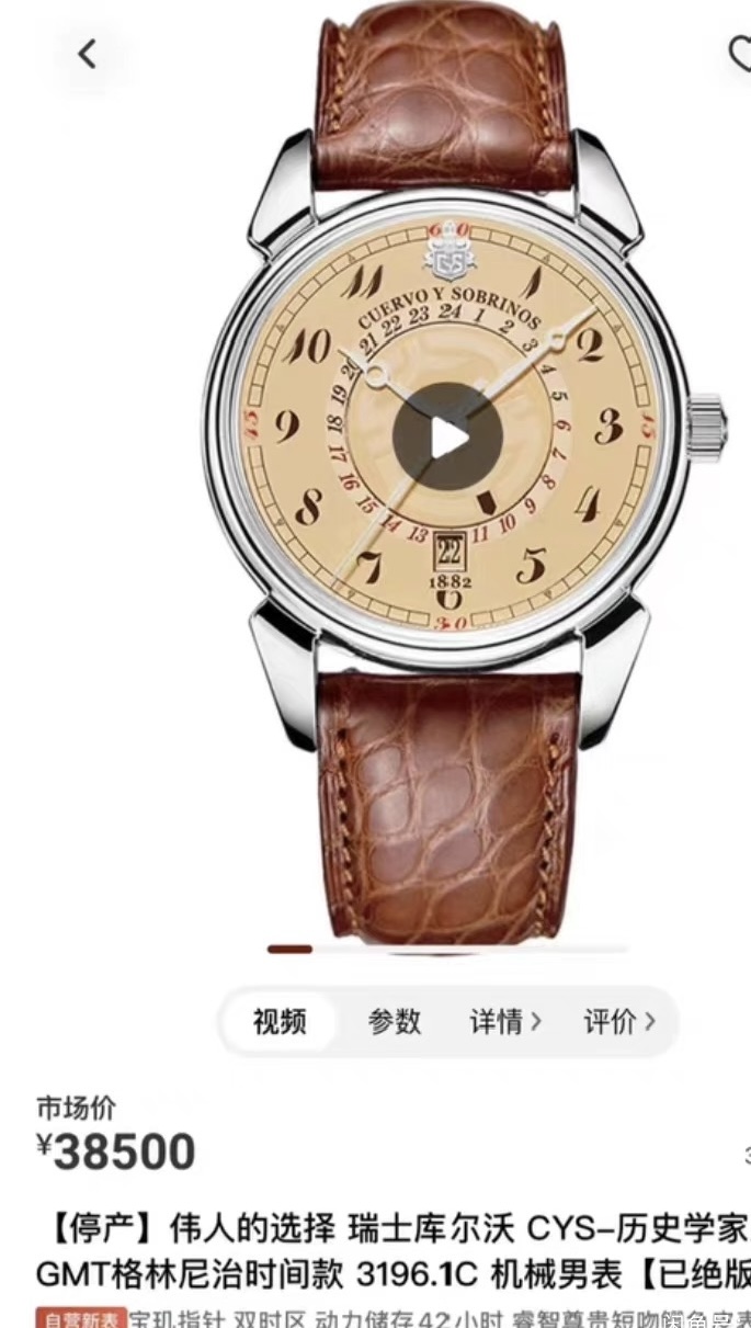 【介绍】:表径40毫米,穹顶式蓝宝石表镜,非常特别的复古盘色,盘芯可以转动用来指示两地时。背透2892精磨自动机芯新换的表带蝴蝶扣。公价3.85万,具体参数自己查,型号见最后一图。