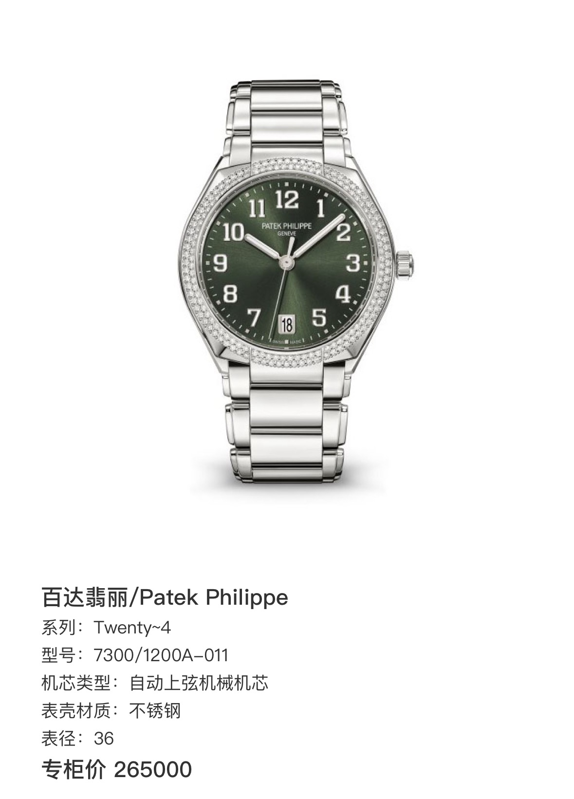百达翡丽/Patek Philippe Twenty~4 7300/1200A-011 自动上弦机械机芯 不锈钢 36 专柜价265000~24年全新全套,现货好价!