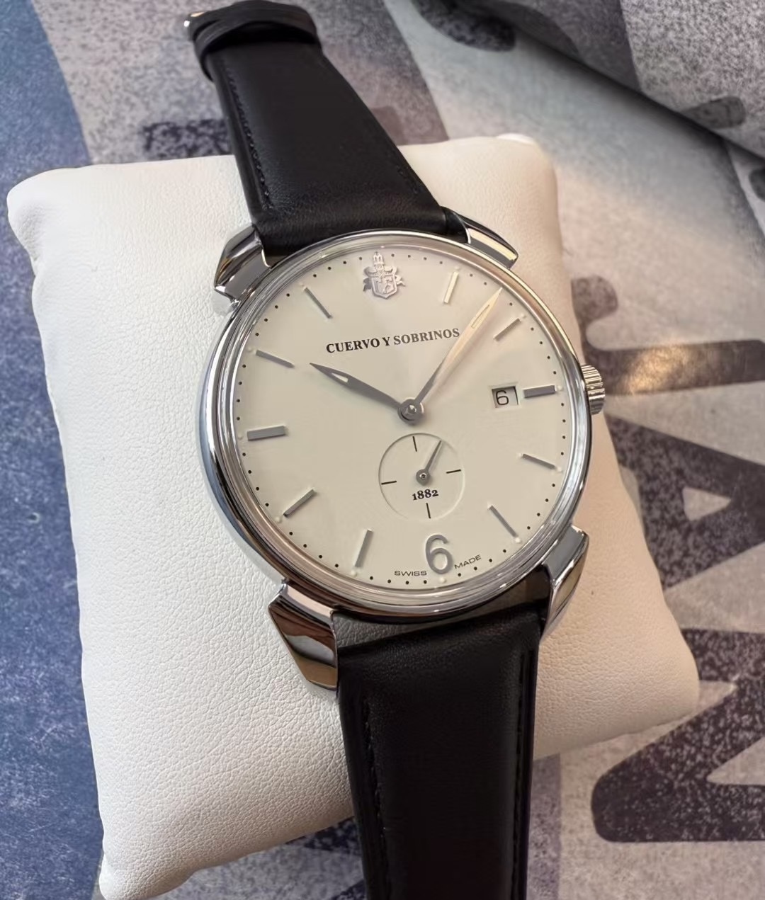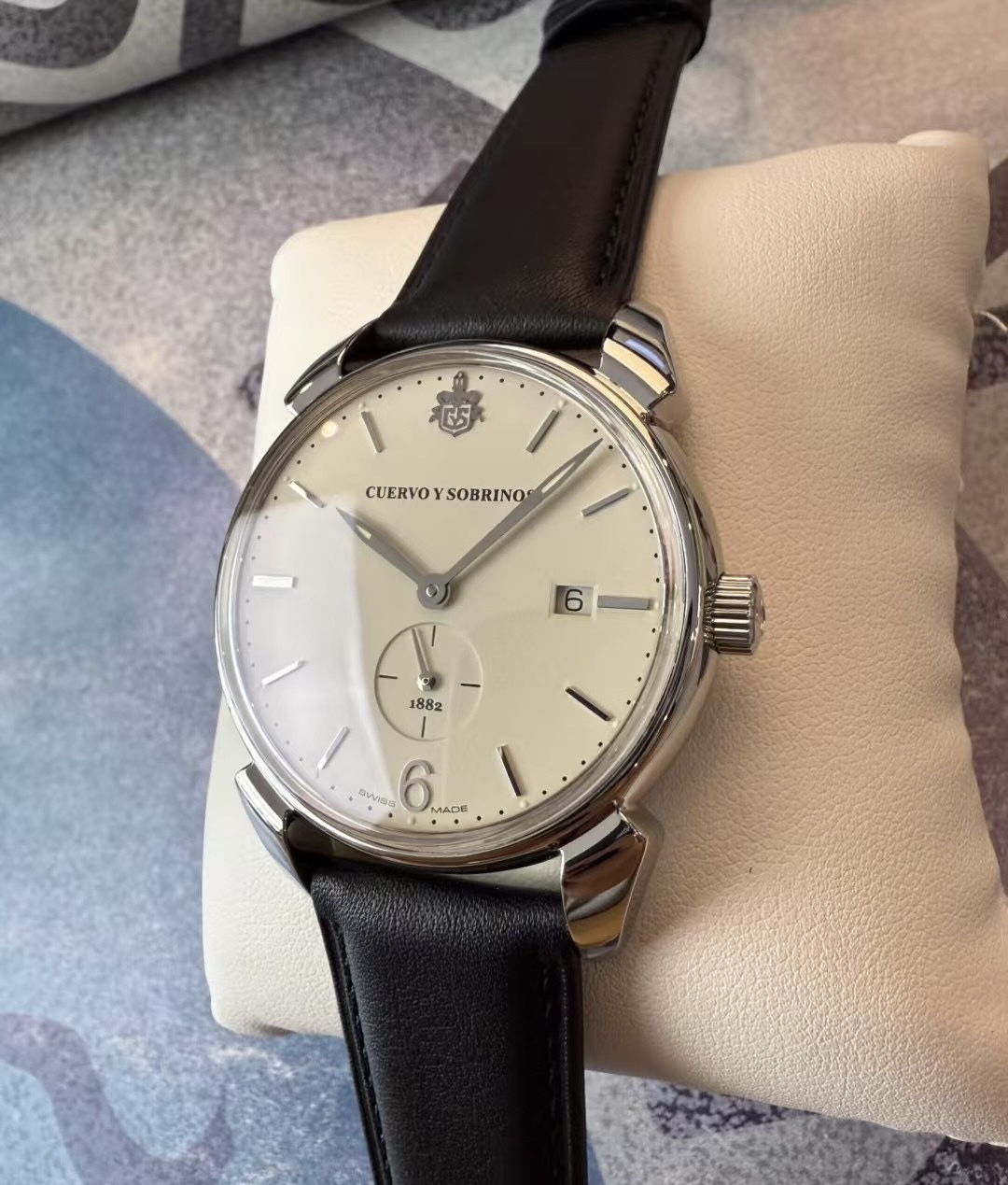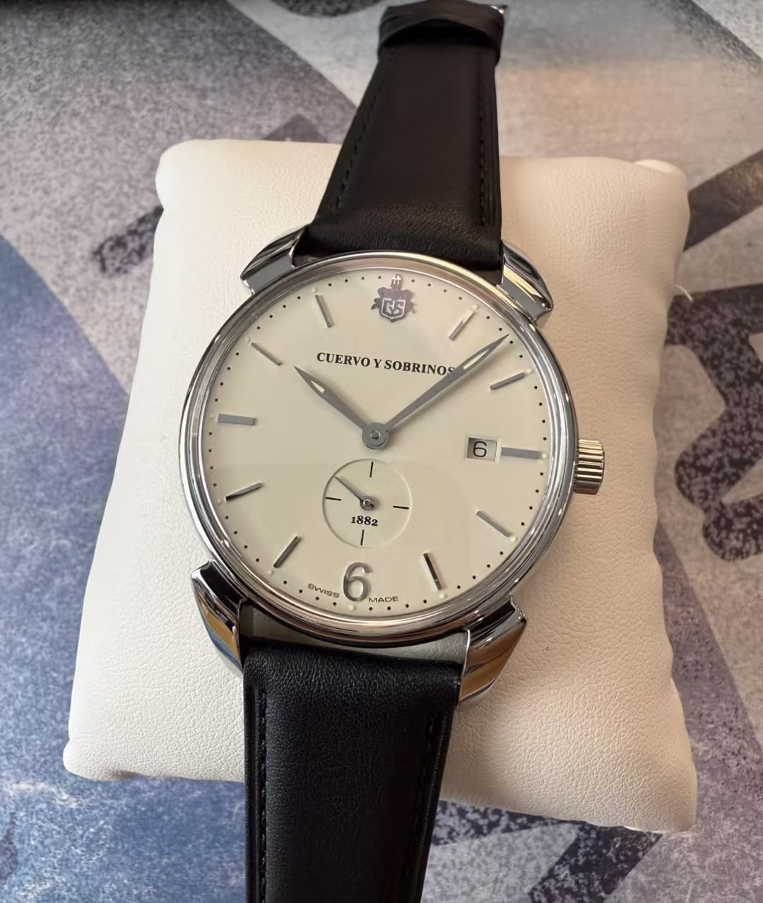 库尔沃历史学家系列小秒针机械腕表,表径40毫米,厚9.9毫米,盒型蓝宝石镜面,米白色盘面,柳叶形指针,条形刻度,3点日历,下方秒针盘,牛角表耳,推拉式表冠,搭载CYS 5156/sw260机芯,新换表带表扣,近新成色,单表