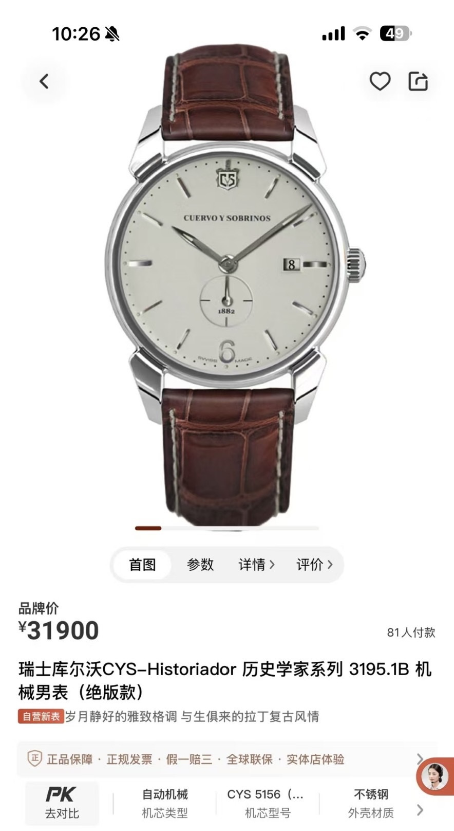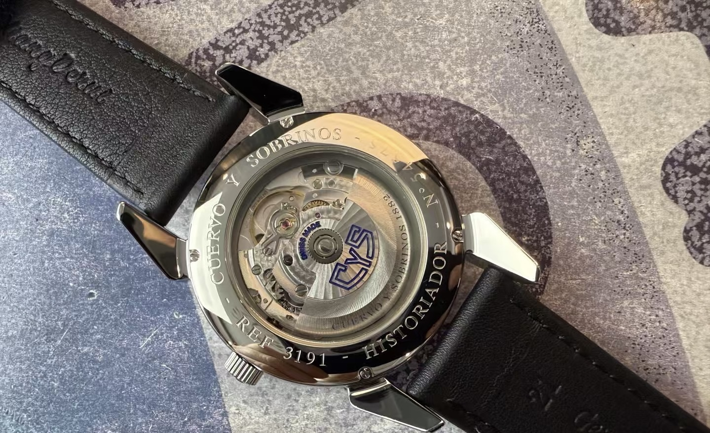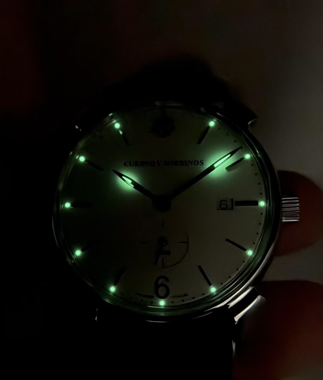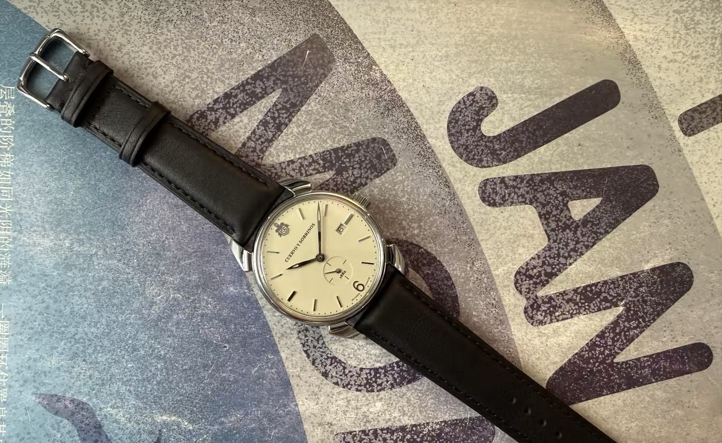库尔沃历史学家系列小秒针机械腕表,表径40毫米,厚9.9毫米,盒型蓝宝石镜面,米白色盘面,柳叶形指针,条形刻度,3点日历,下方秒针盘,牛角表耳,推拉式表冠,搭载CYS 5156/sw260机芯,新换表带表扣,近新成色,单表
