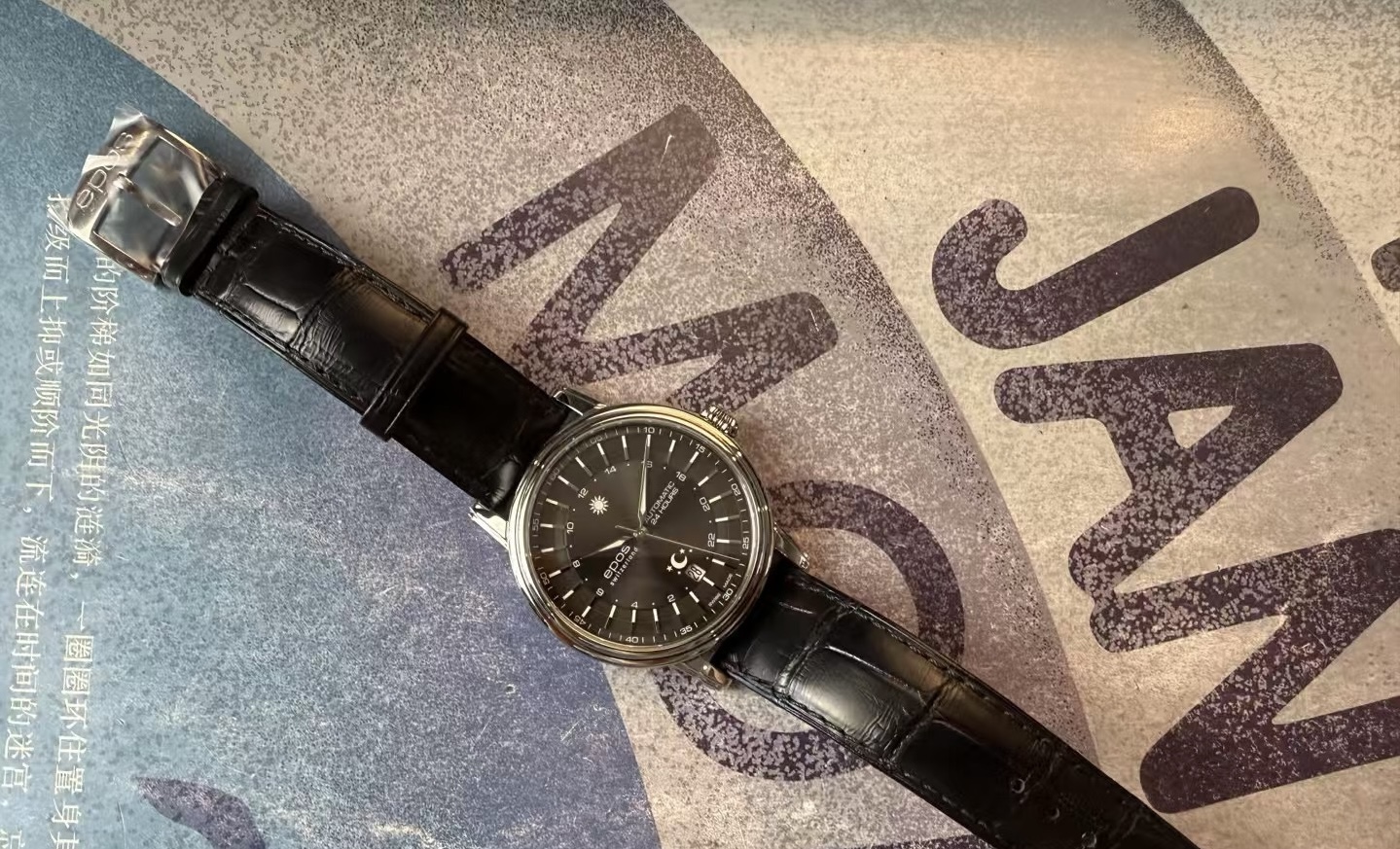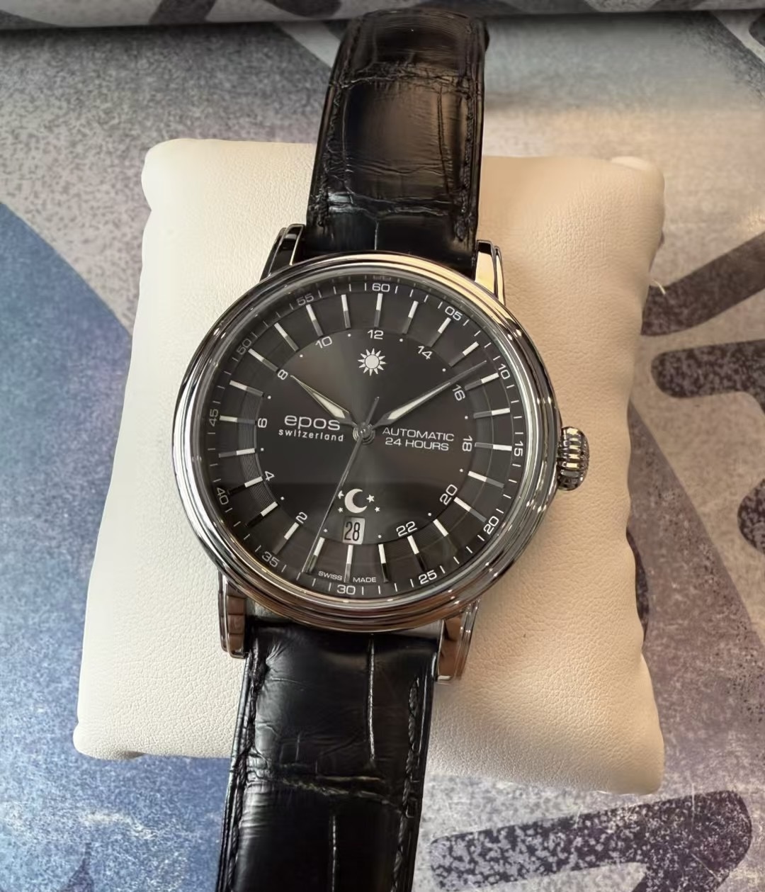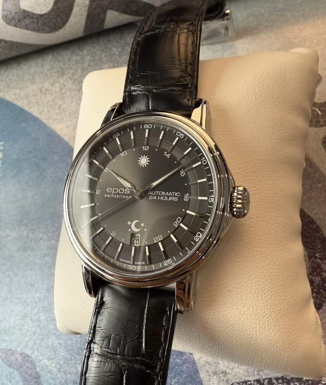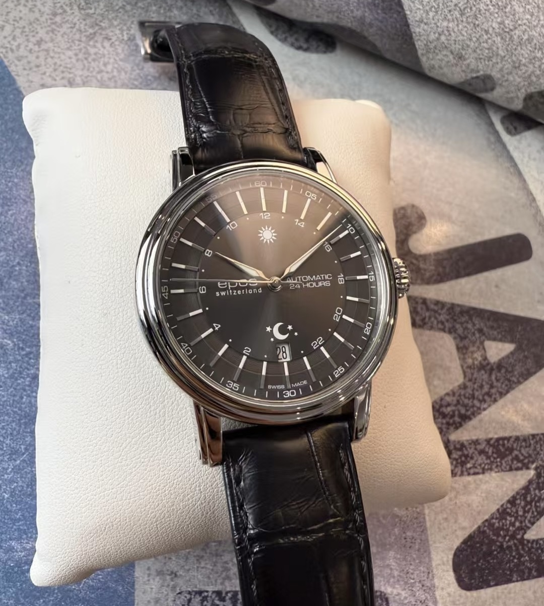 爱宝时日夜无间铁幕机械腕表,表径41毫米,厚9毫米,防眩光平面蓝宝石镜面,深灰色太阳纹盘面,24小时昼夜同显设计,条形刻度,宝剑式太妃指针,下方日历,推拉式洋葱表冠,搭载eta2892-a2机芯,走时天文台级别,近新成色,单表