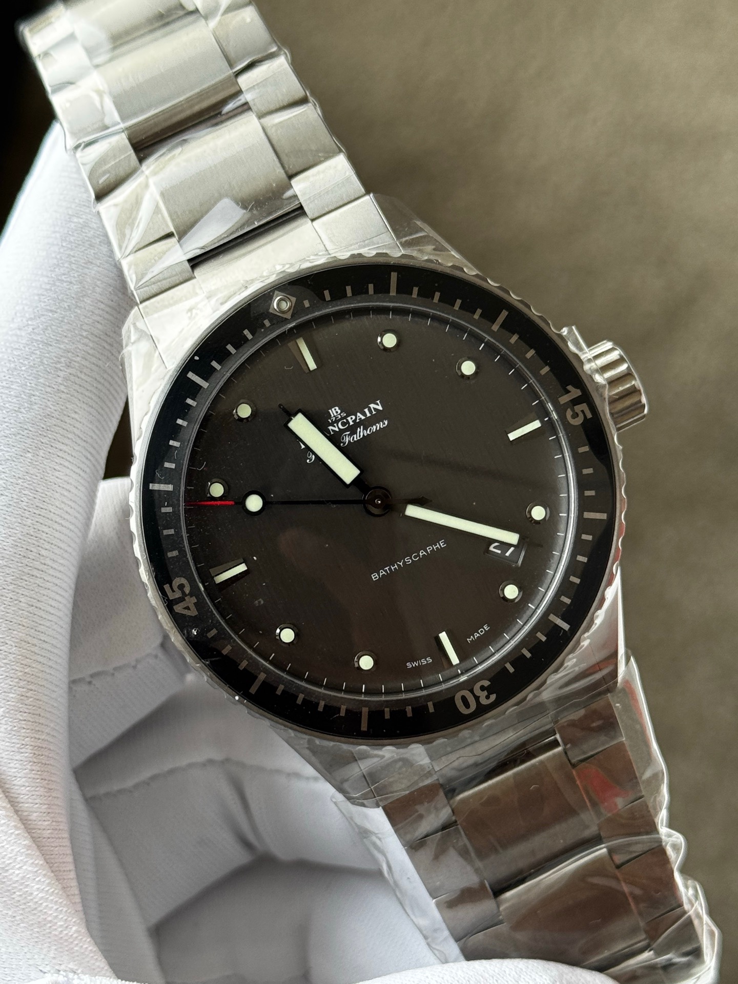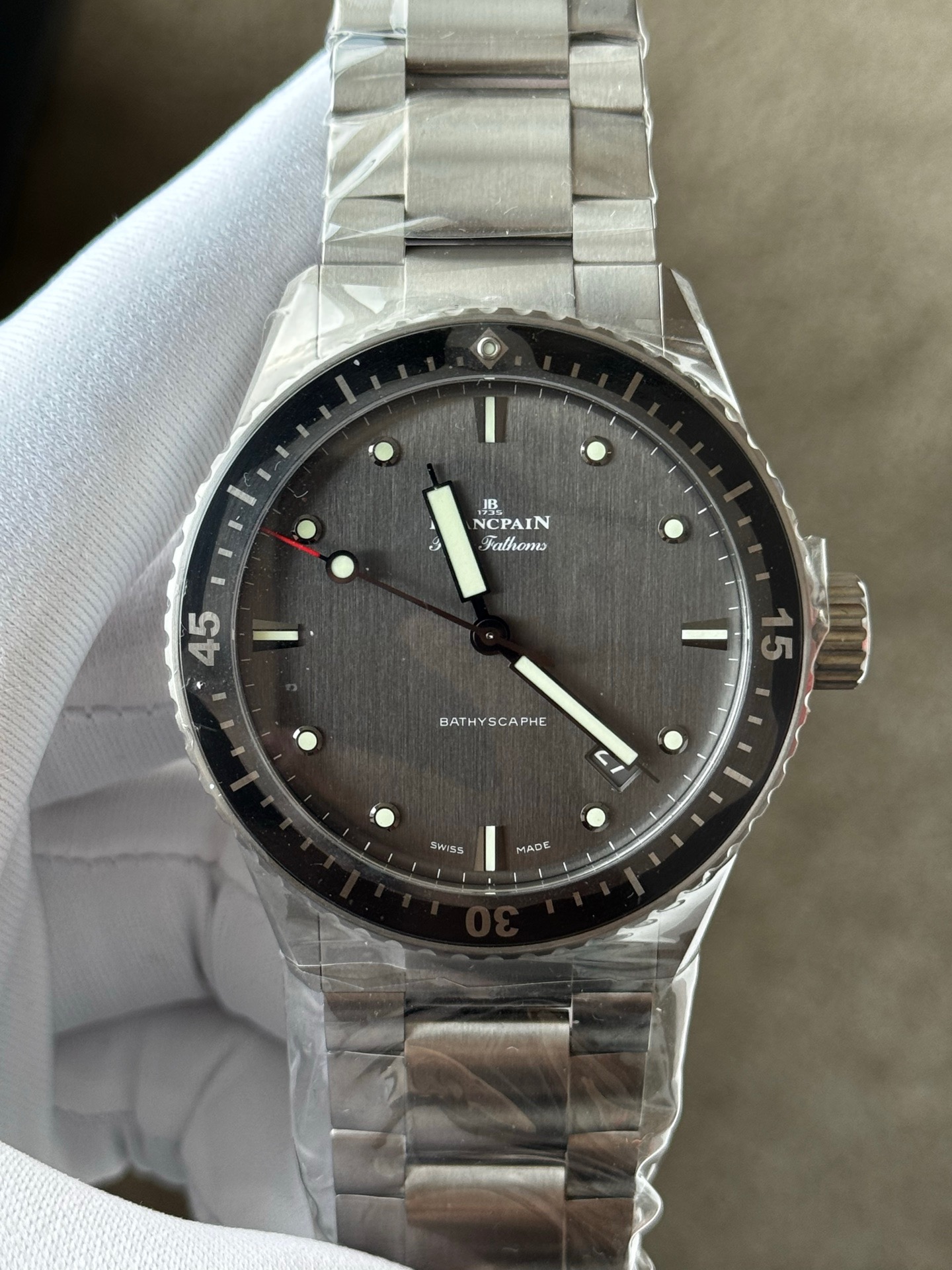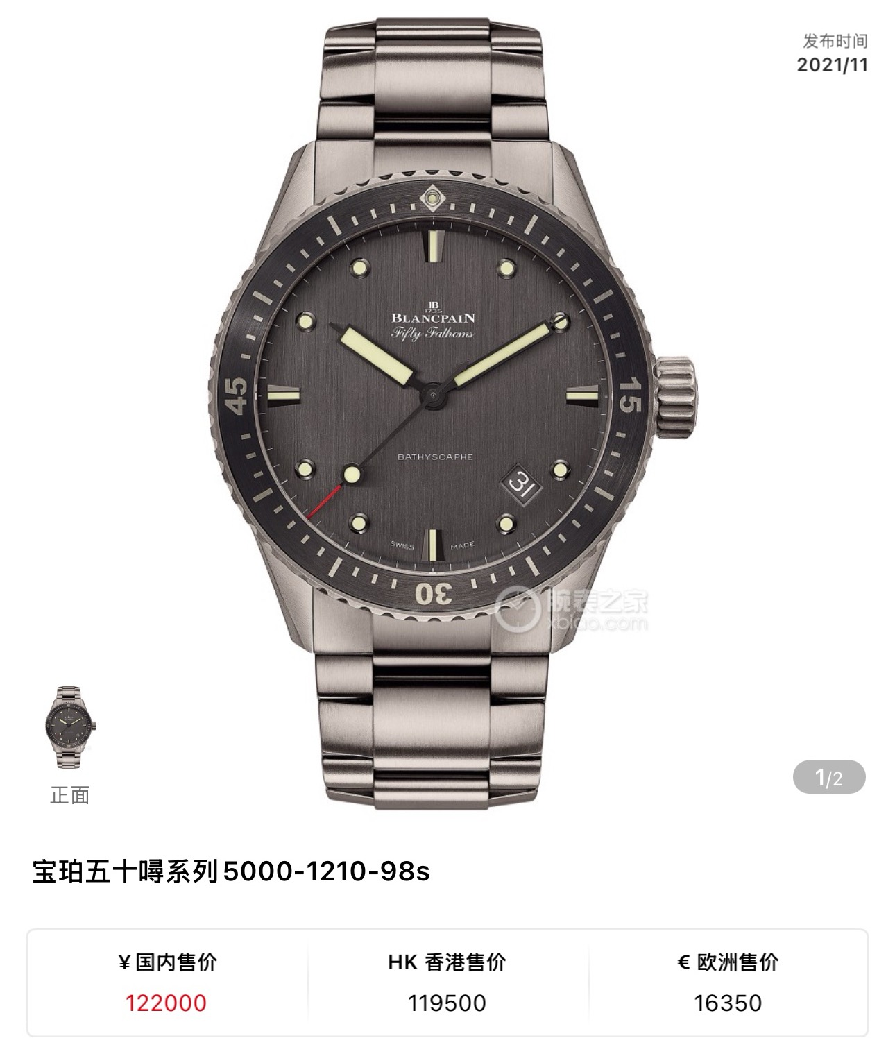 25年未使用宝珀五十噚系列5000-1210-98s男士自动机械腕表 热门款 表径43毫米 灰色表盘 背透机芯 搭配蝴蝶扣 采用钛金属材质打造 日期显示 专柜价122000 现货好价