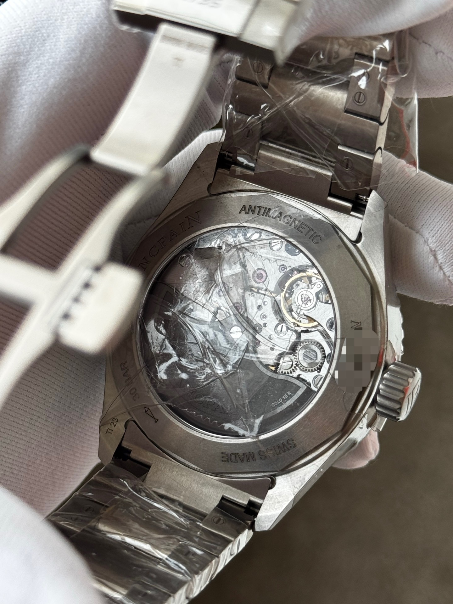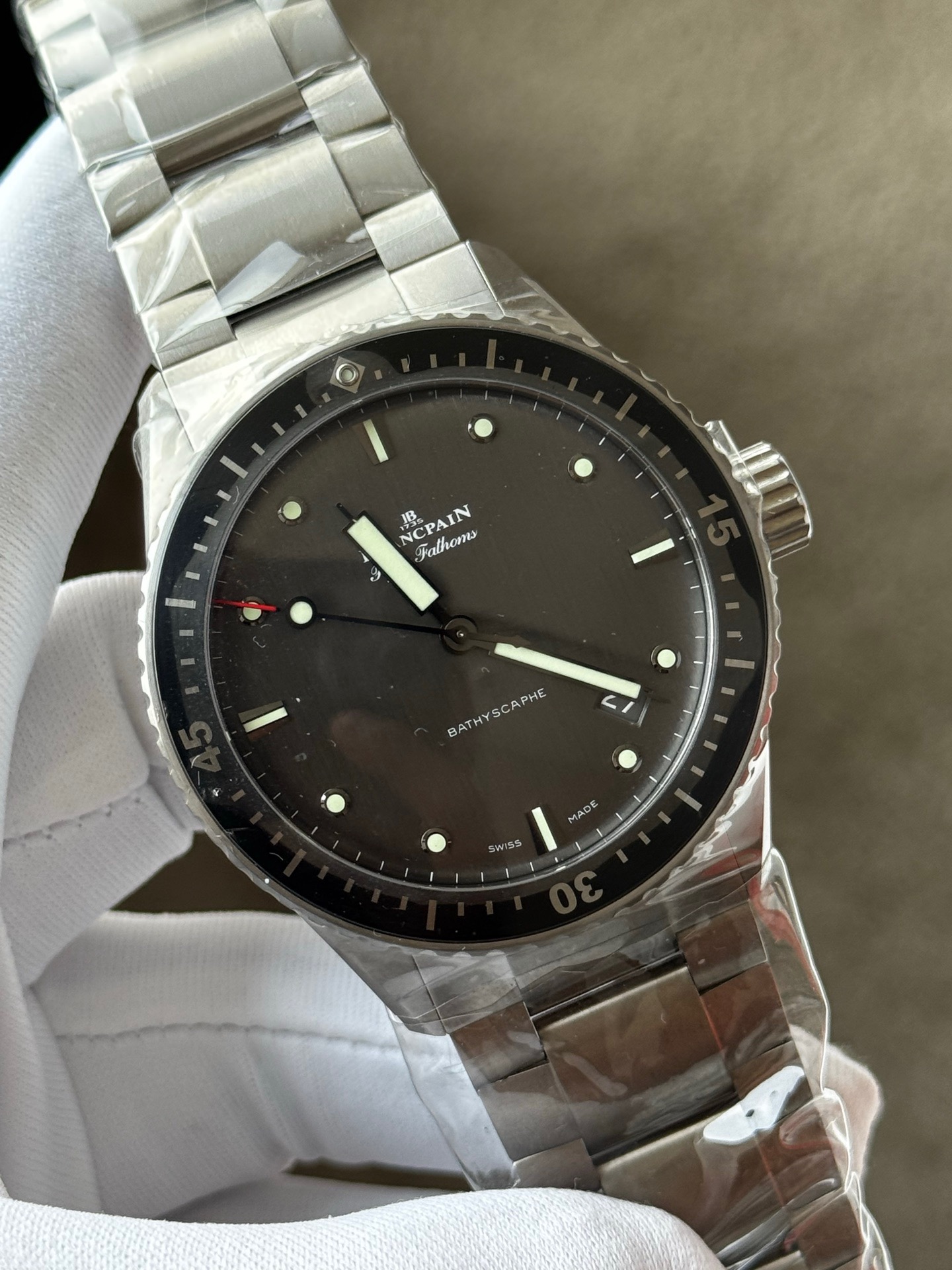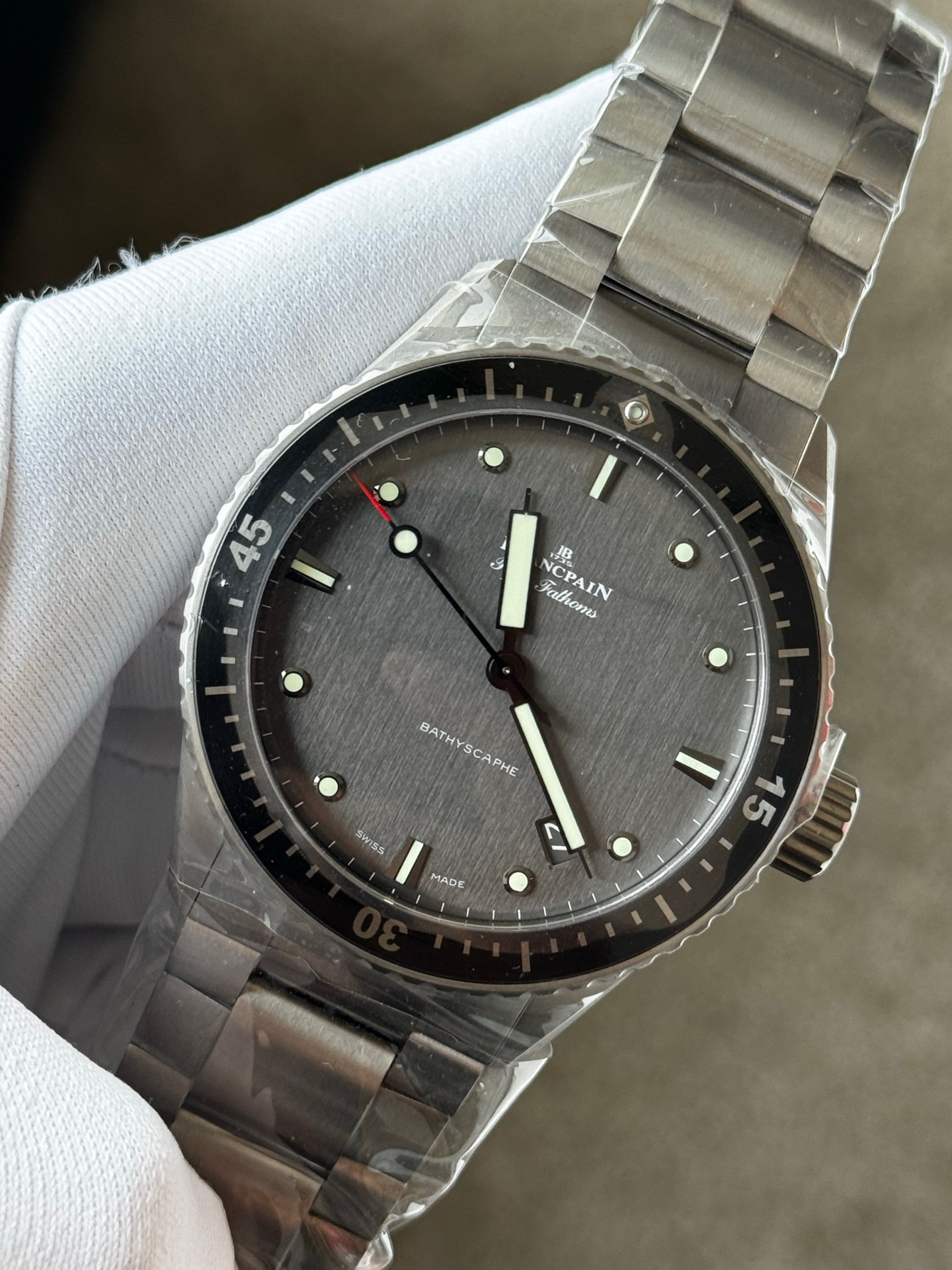 25年未使用宝珀五十噚系列5000-1210-98s男士自动机械腕表 热门款 表径43毫米 灰色表盘 背透机芯 搭配蝴蝶扣 采用钛金属材质打造 日期显示 专柜价122000 现货好价
