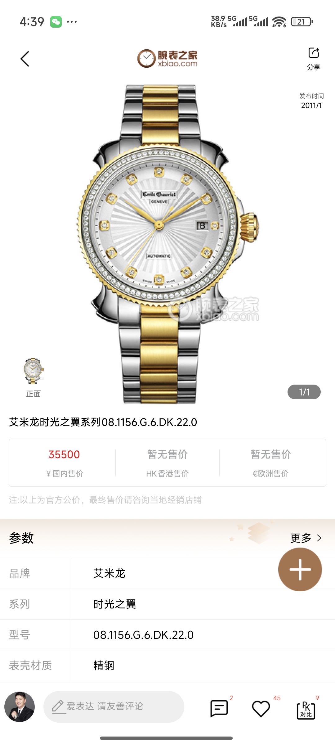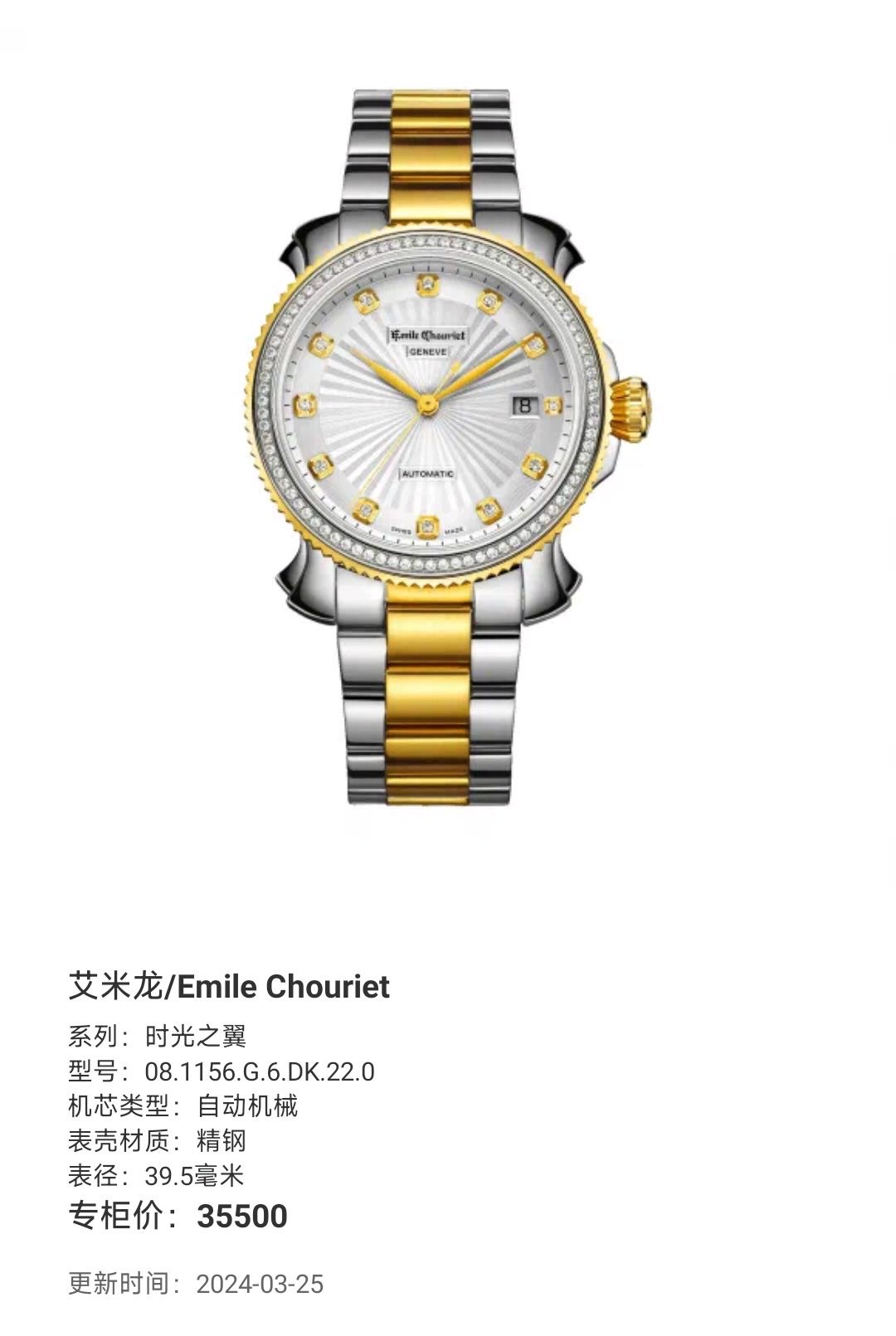 艾米龙/Emile Chouriet 时光之翼 08.1156.G.6.DK.22.0 自动机械 精钢 39.5毫米 专柜价35500元 国行全新未使用26年1月卡
