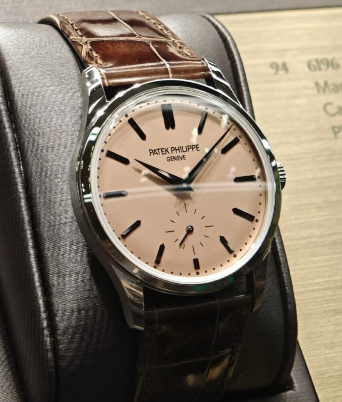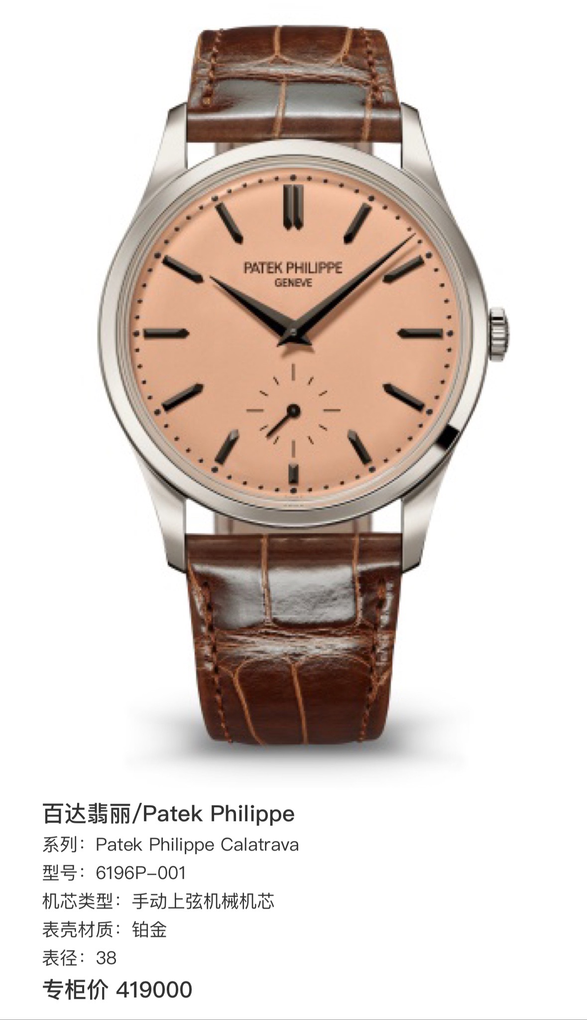 百达翡丽/Patek Philippe Patek Philippe Calatrava 6196P-001三文鱼,手动上弦机械机芯 铂金 38 专柜价419000,25年5月全新全套未使用