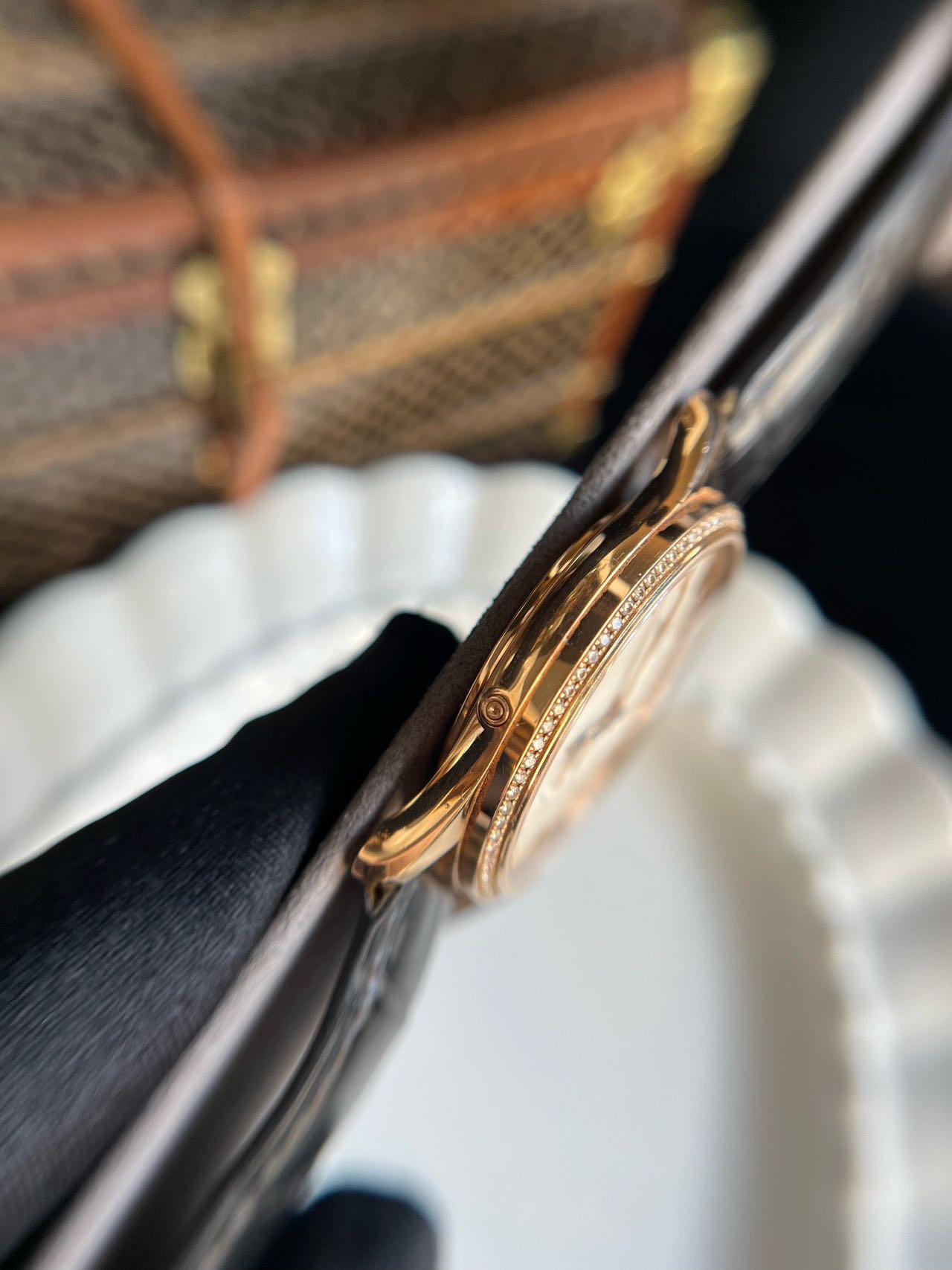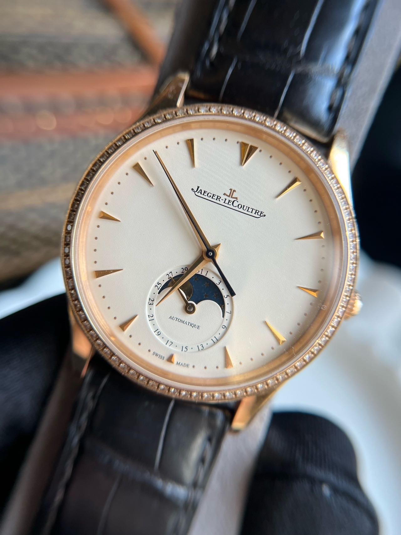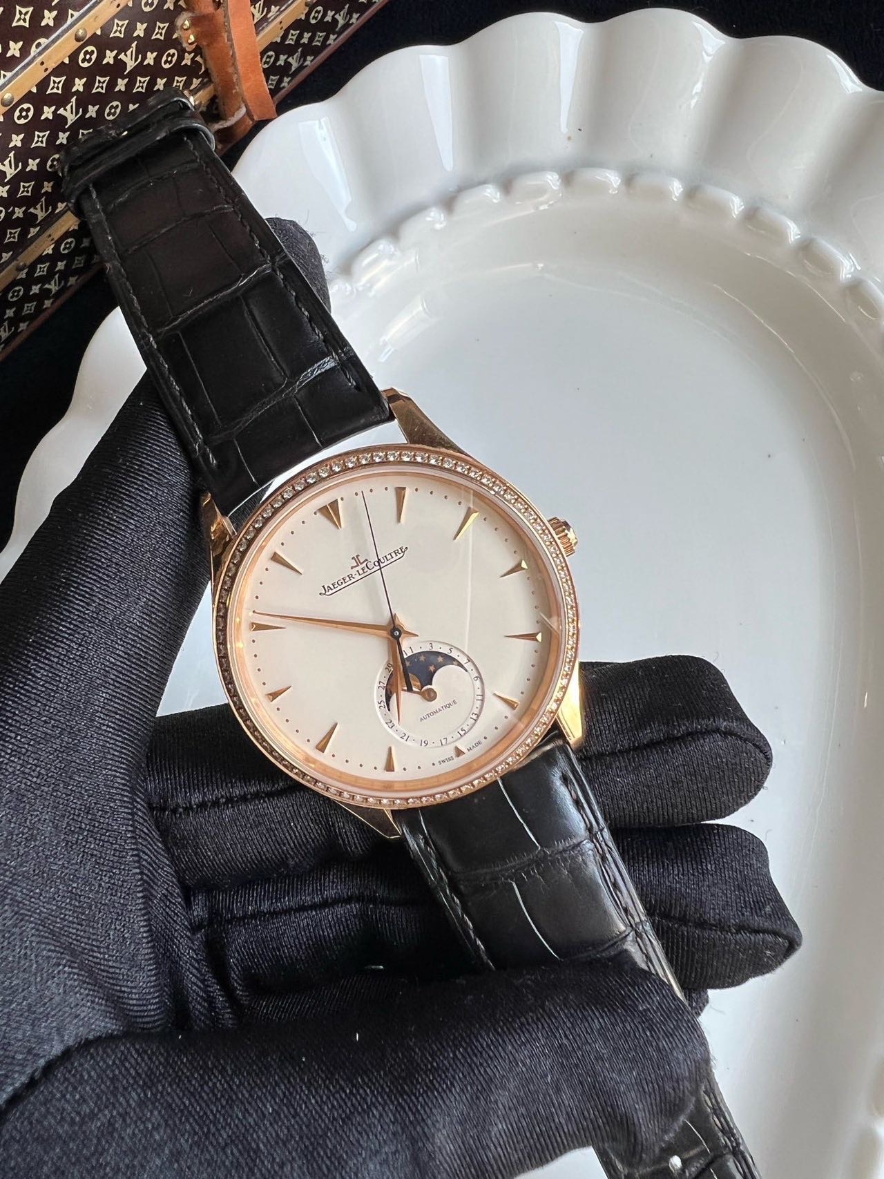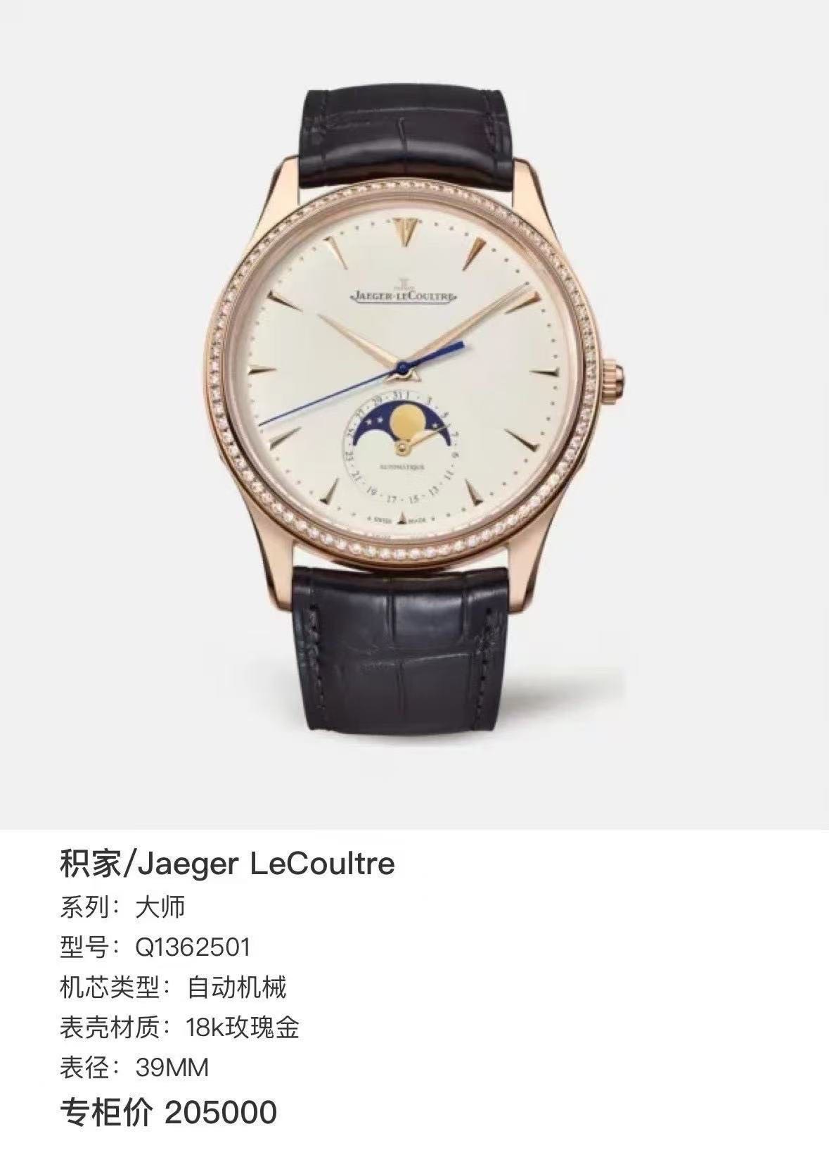 积家/Jaeger LeCoultre 大师 Q1362501 自动机械 18k玫瑰金 39MM 原镶钻 专柜价205000 单表,指针轻微氧化 好价~~