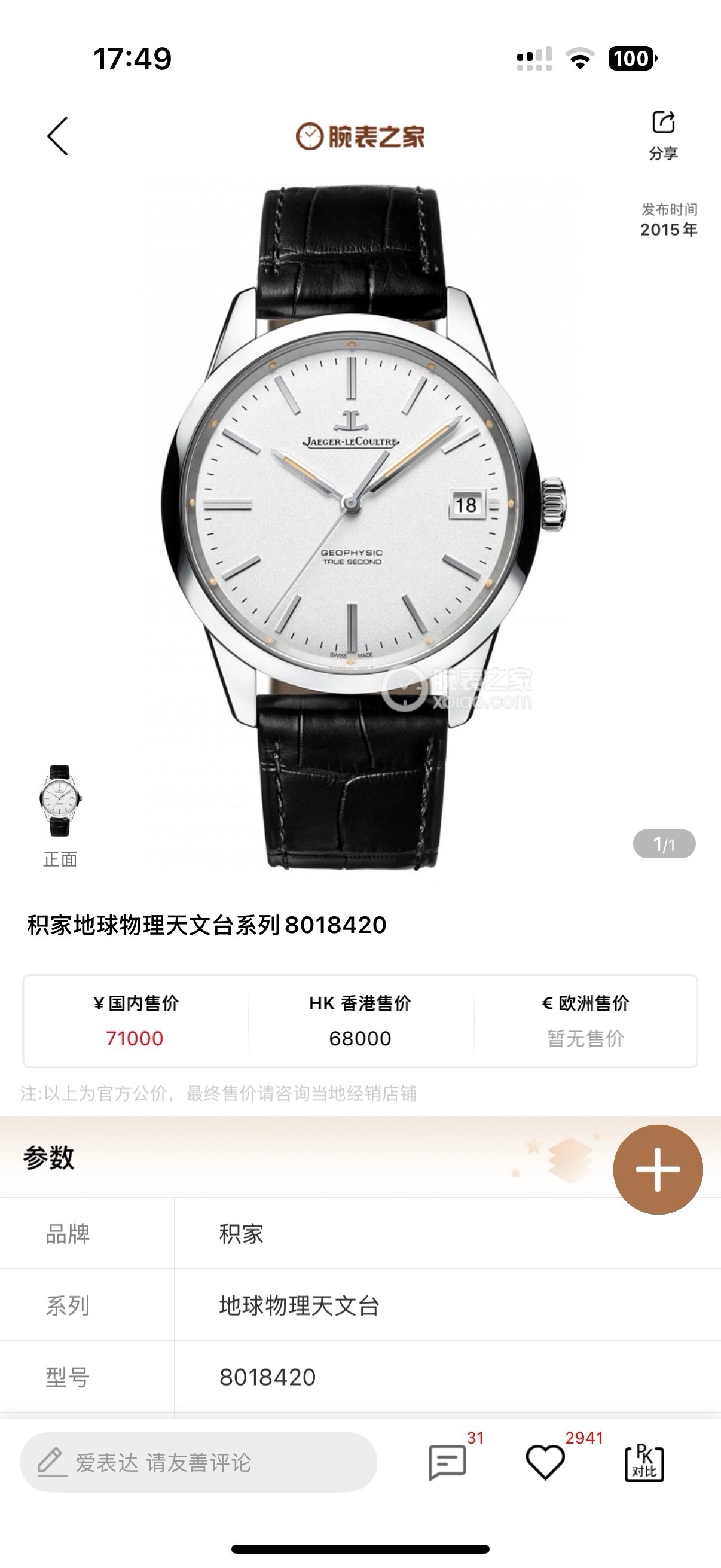 积家/Jaeger LeCoultre 地球物理天文台 8018420 自动机械 精钢 39.6毫米 专柜价71000