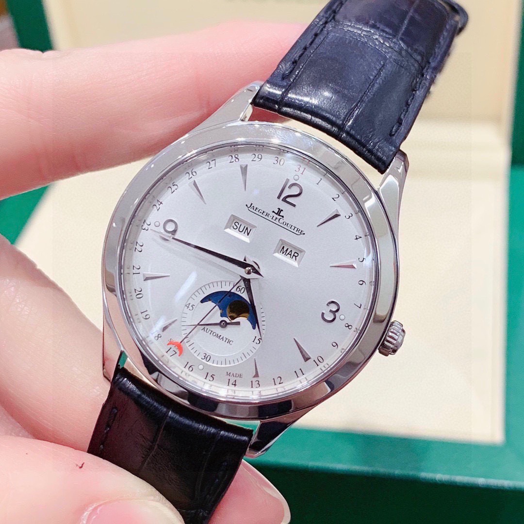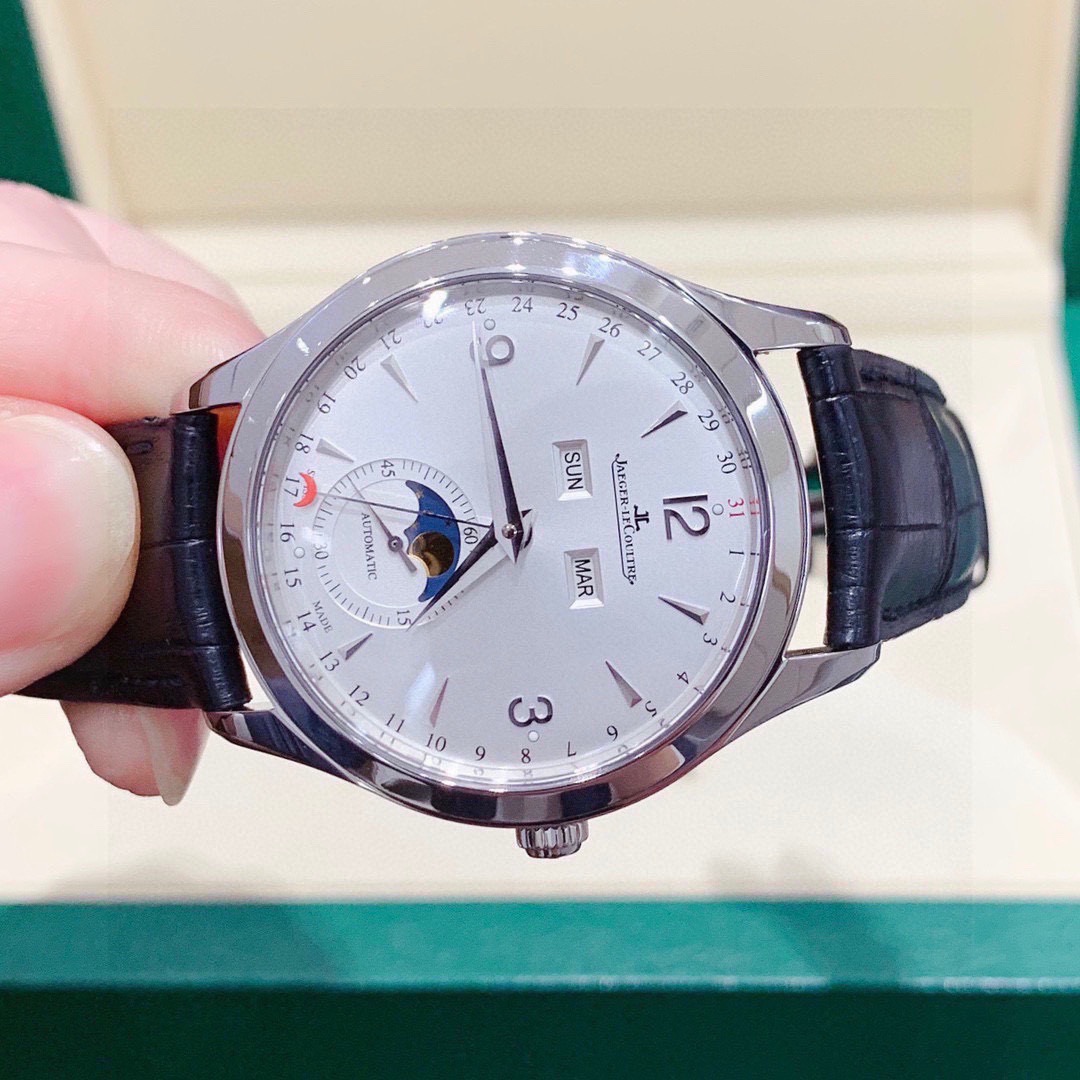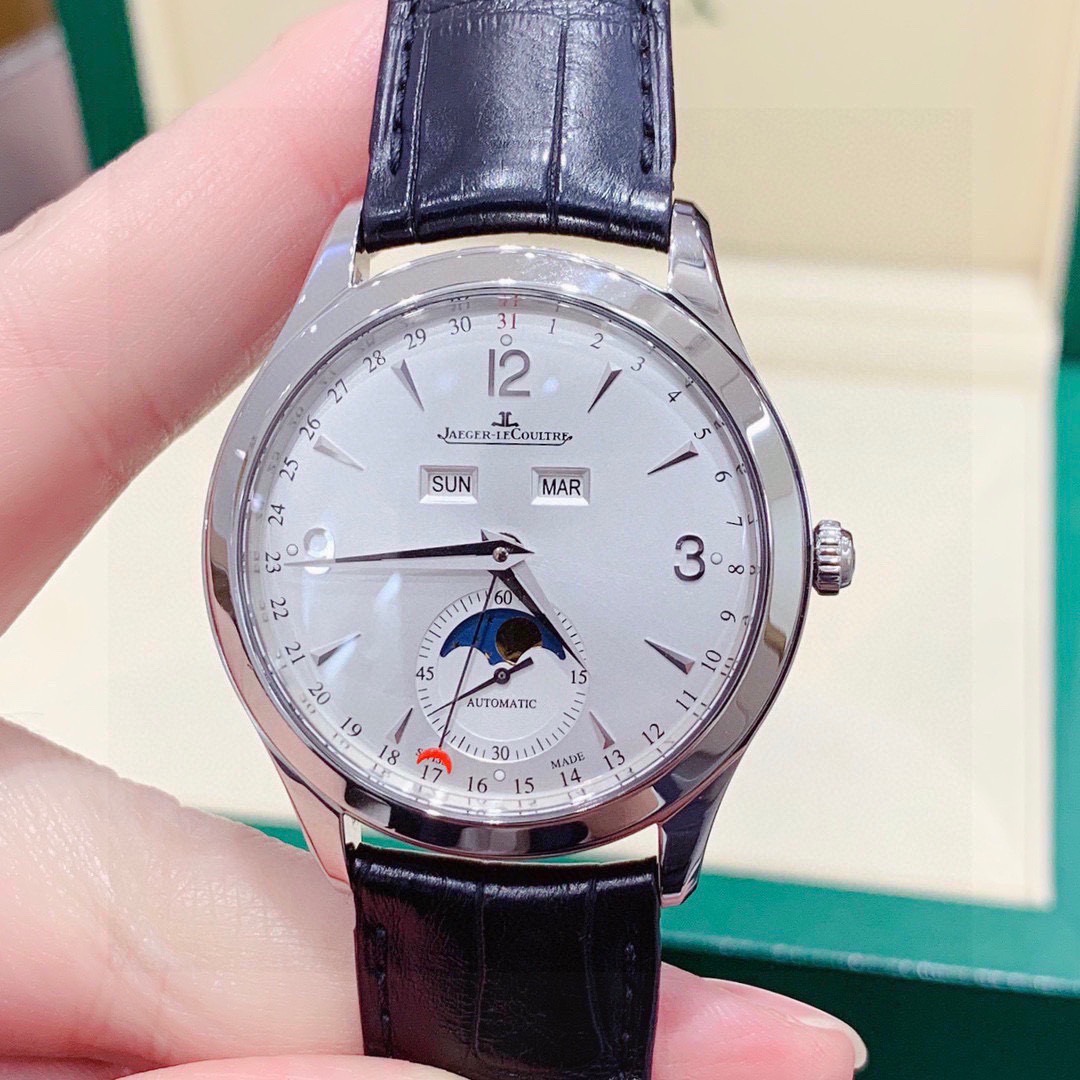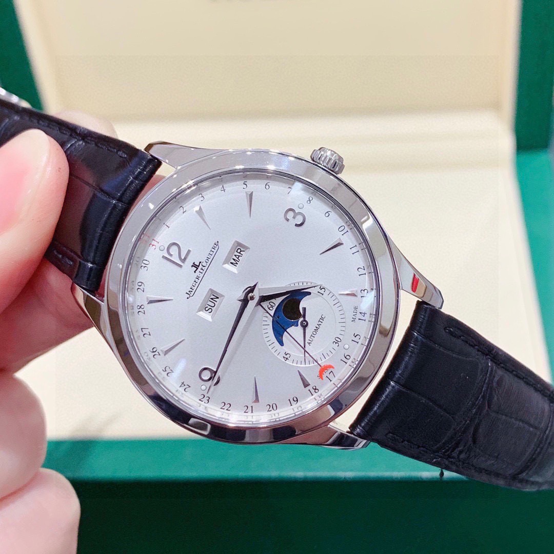 积家 大师系列1558420精钢款男士自动机械腕表 表径:39mm 功能:日期、星期、月份、月相显示 专柜售价:76000 特价