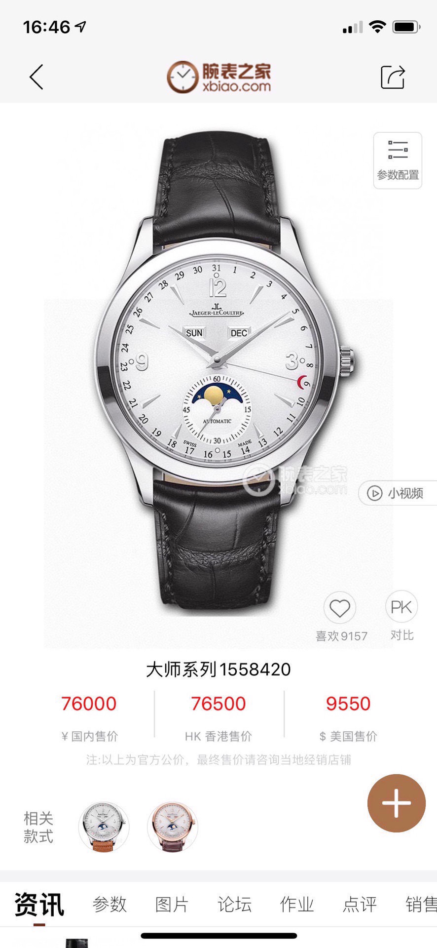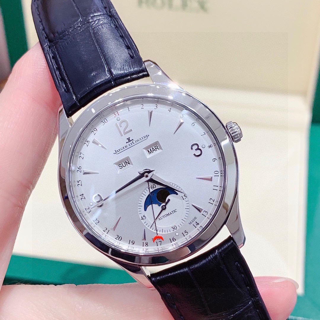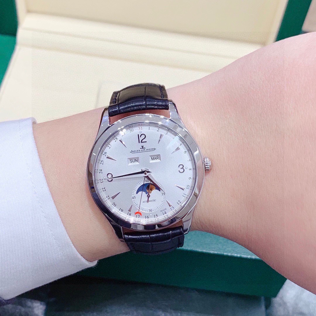 积家 大师系列1558420精钢款男士自动机械腕表 表径:39mm 功能:日期、星期、月份、月相显示 专柜售价:76000 特价