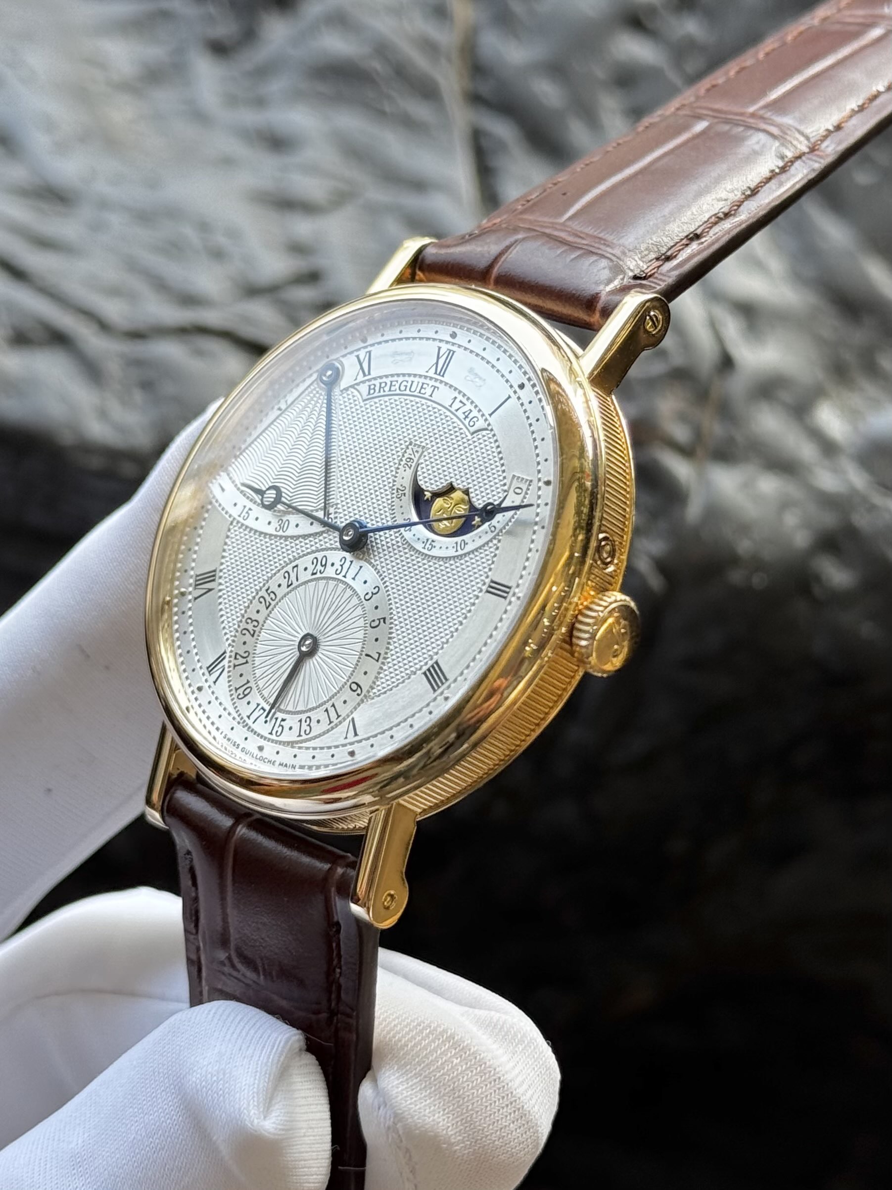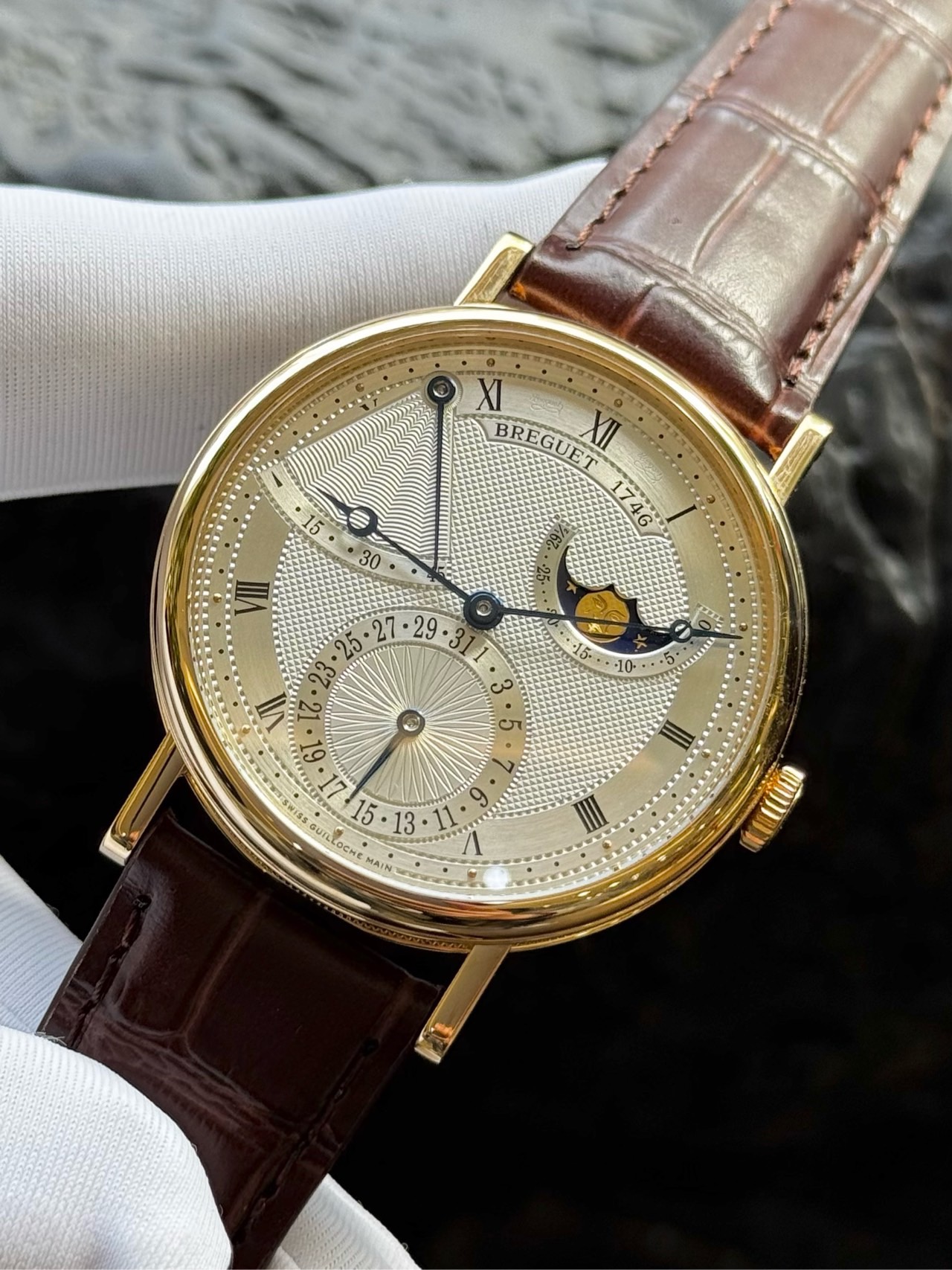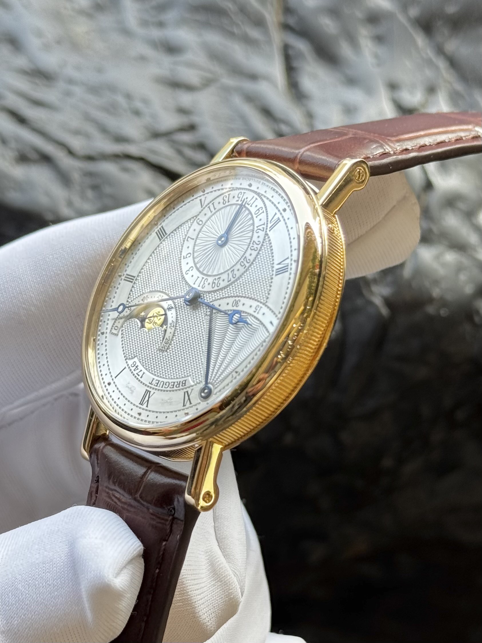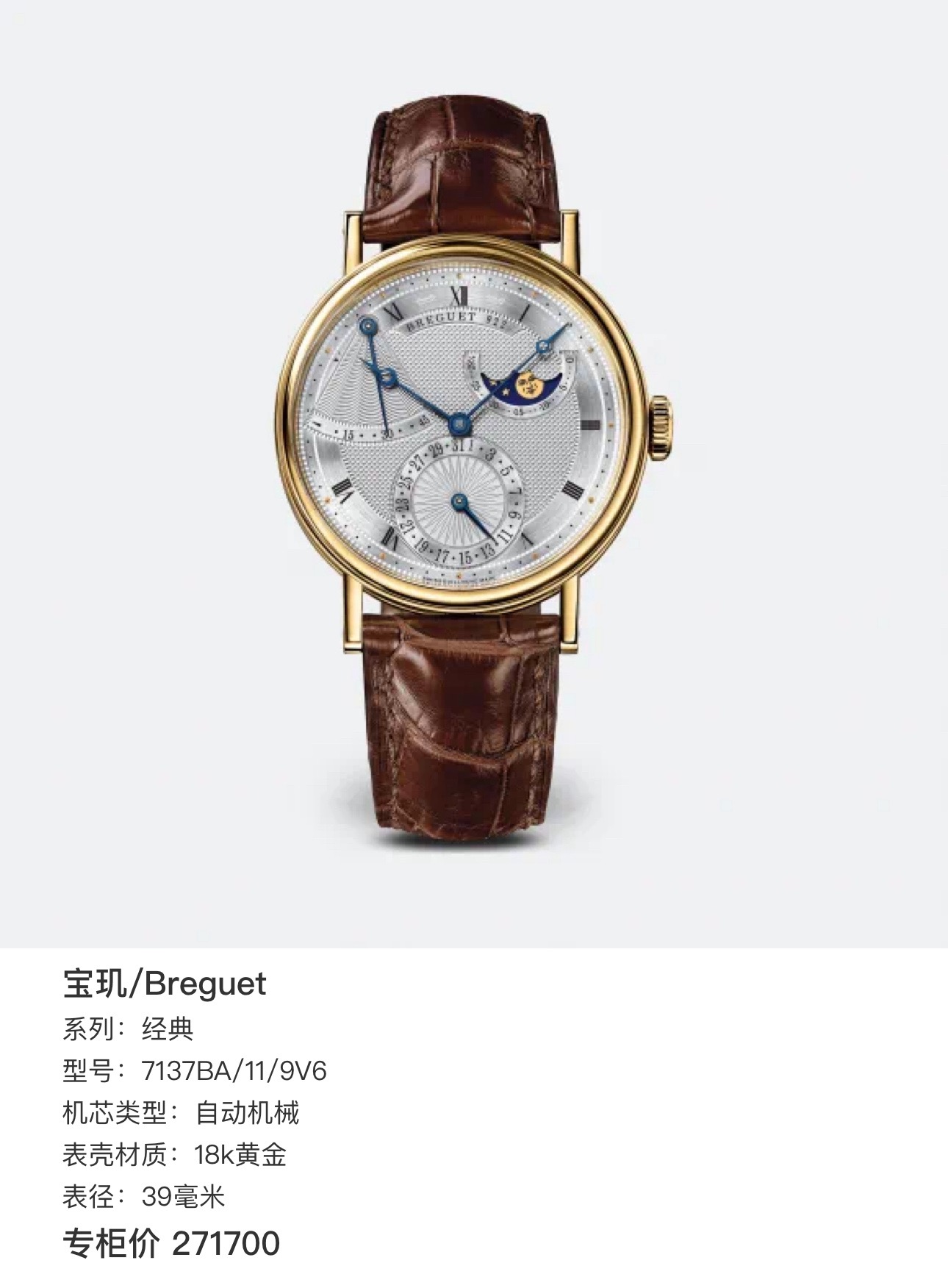 宝玑,经典系列,型号7137BA/11/9V6,自动机械,18k黄金,表径39mm,玑镂纹面盘,钱币纹侧壳,偏心自动陀,动储、月相、日期功能一应俱全,整表重83克,公价27.17万