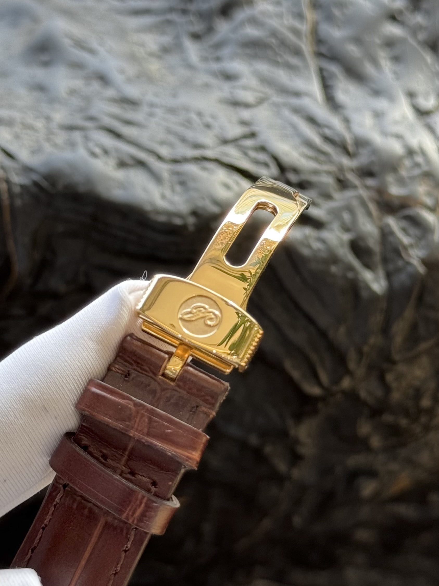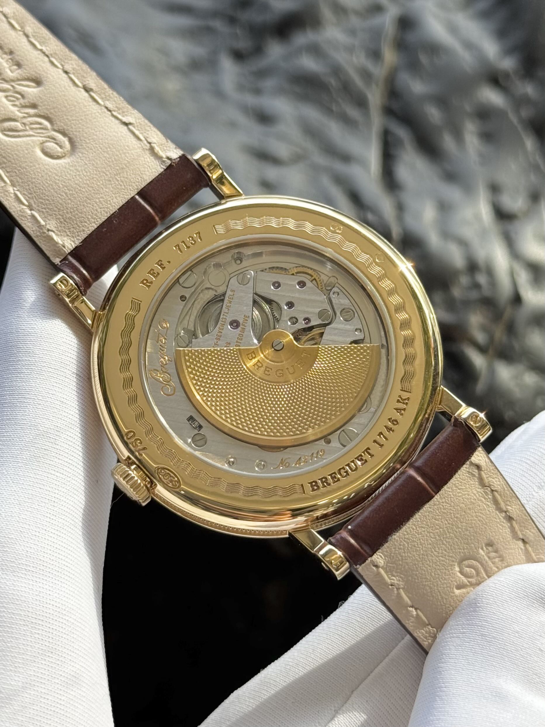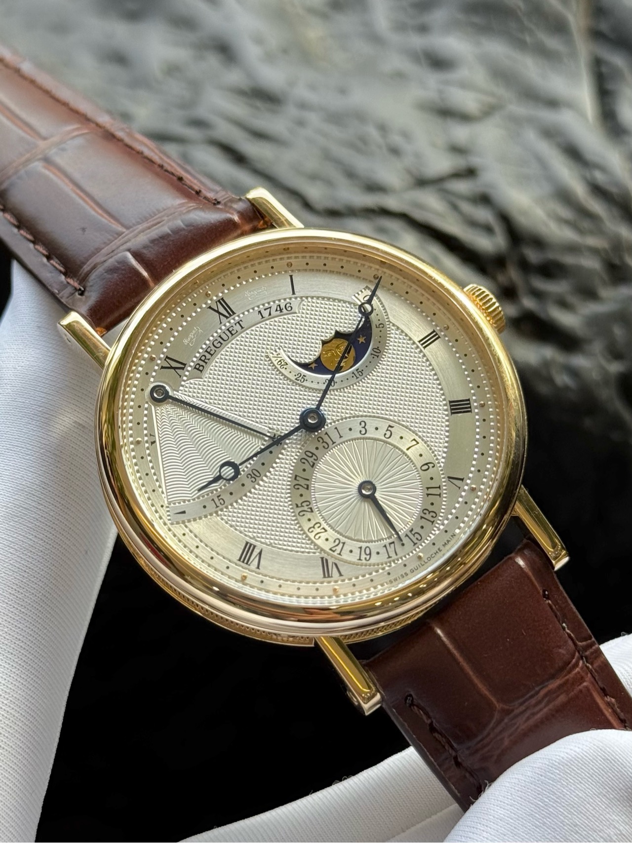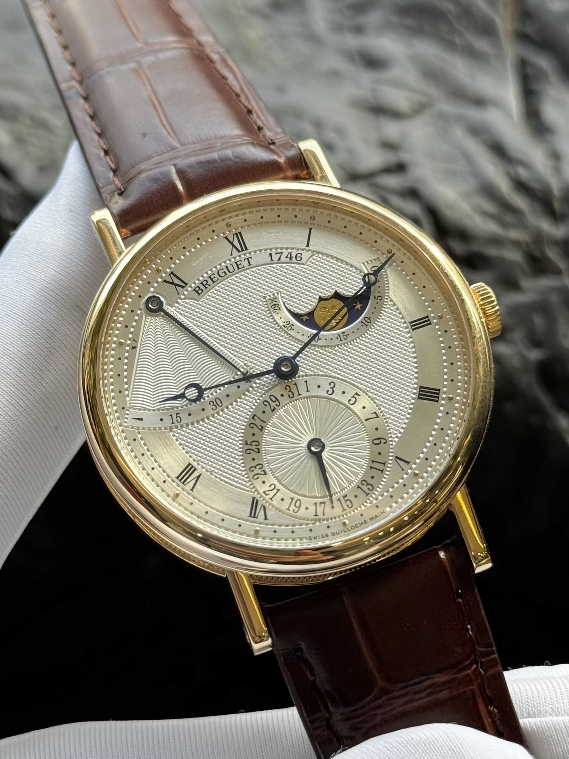 宝玑,经典系列,型号7137BA/11/9V6,自动机械,18k黄金,表径39mm,玑镂纹面盘,钱币纹侧壳,偏心自动陀,动储、月相、日期功能一应俱全,整表重83克,公价27.17万