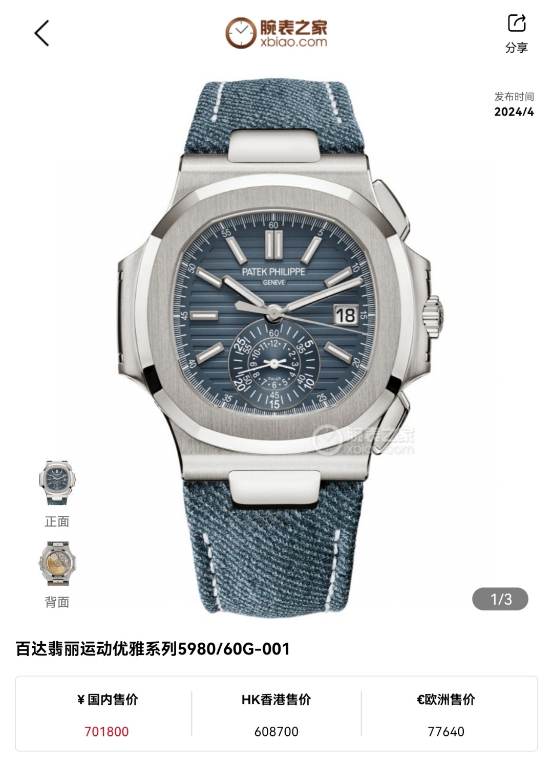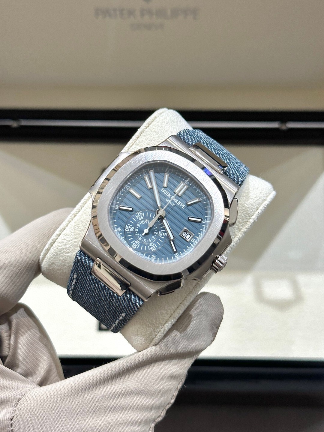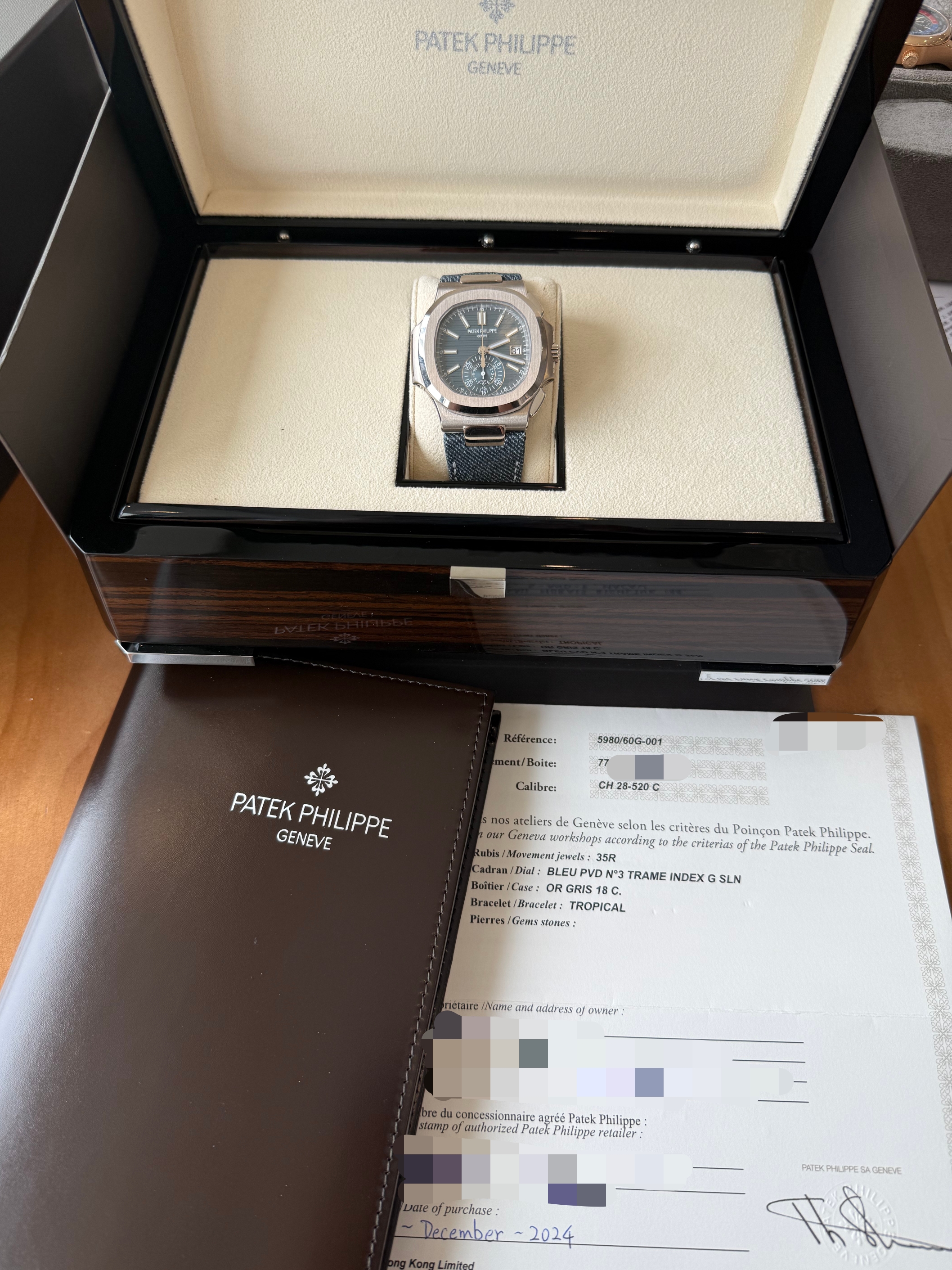 【24年5980g】PATEK PHILIPPE百达翡丽5980/60G-001牛仔布鹦鹉螺,新款鹦鹉螺,牛仔布蓝,18k白金材质,40.5mm表径,2024年12月卡二手全套,好价有