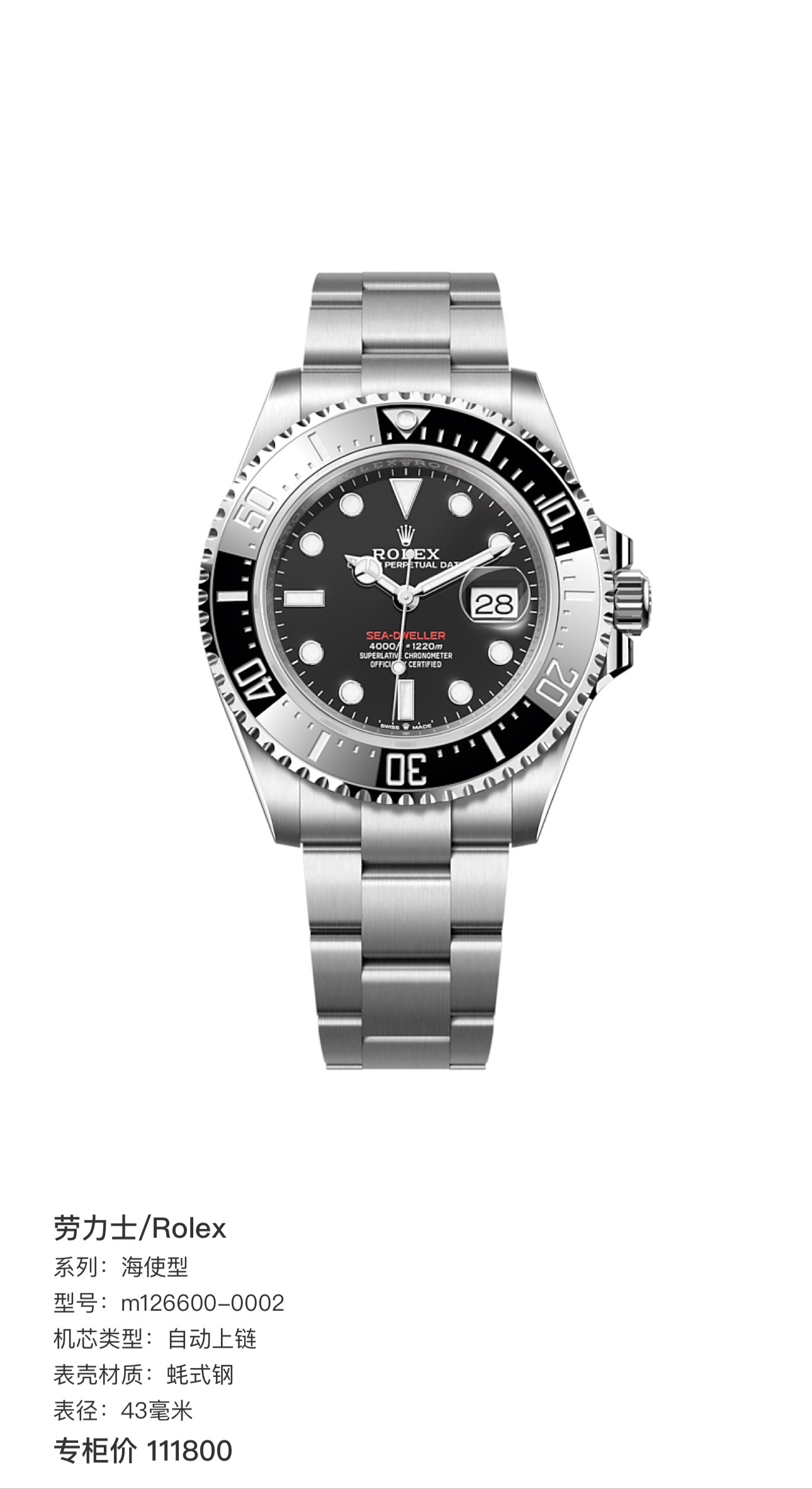 劳力士/Rolex 海使型 m126600-0002 自动上链 蚝式钢 43毫米 专柜价111800