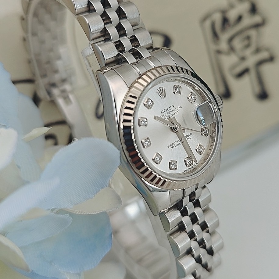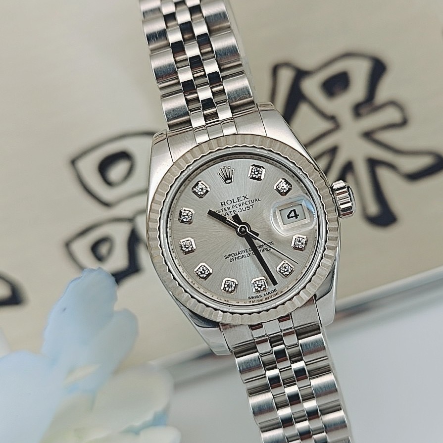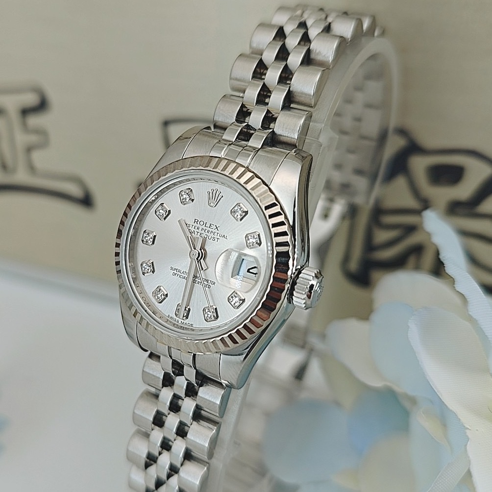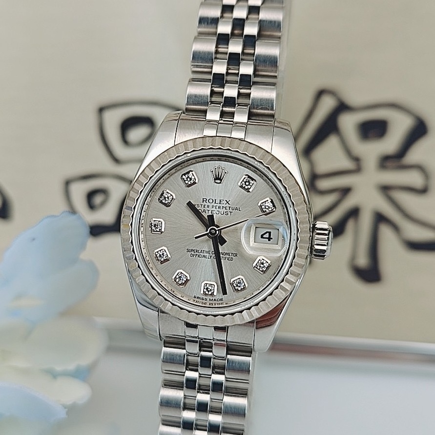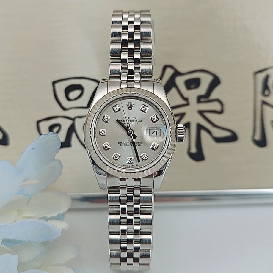 全套劳力士女装日志型系列女表,型号:179174,不锈钢材质外观搭配自动机械机芯、18k白金材质表圈,26mm银色圆形表盘饰有钻石时标和日历显示,折叠表扣,公价75300,现货好价可得