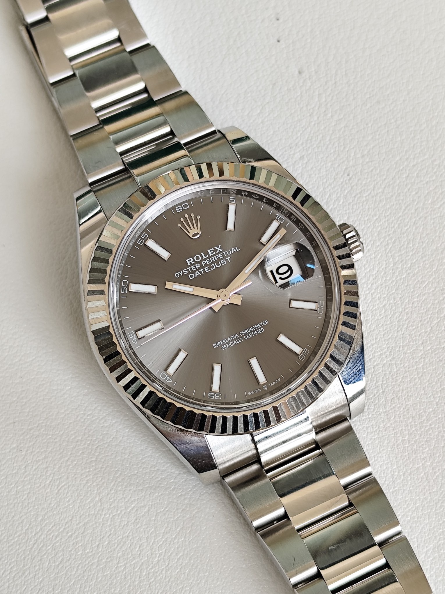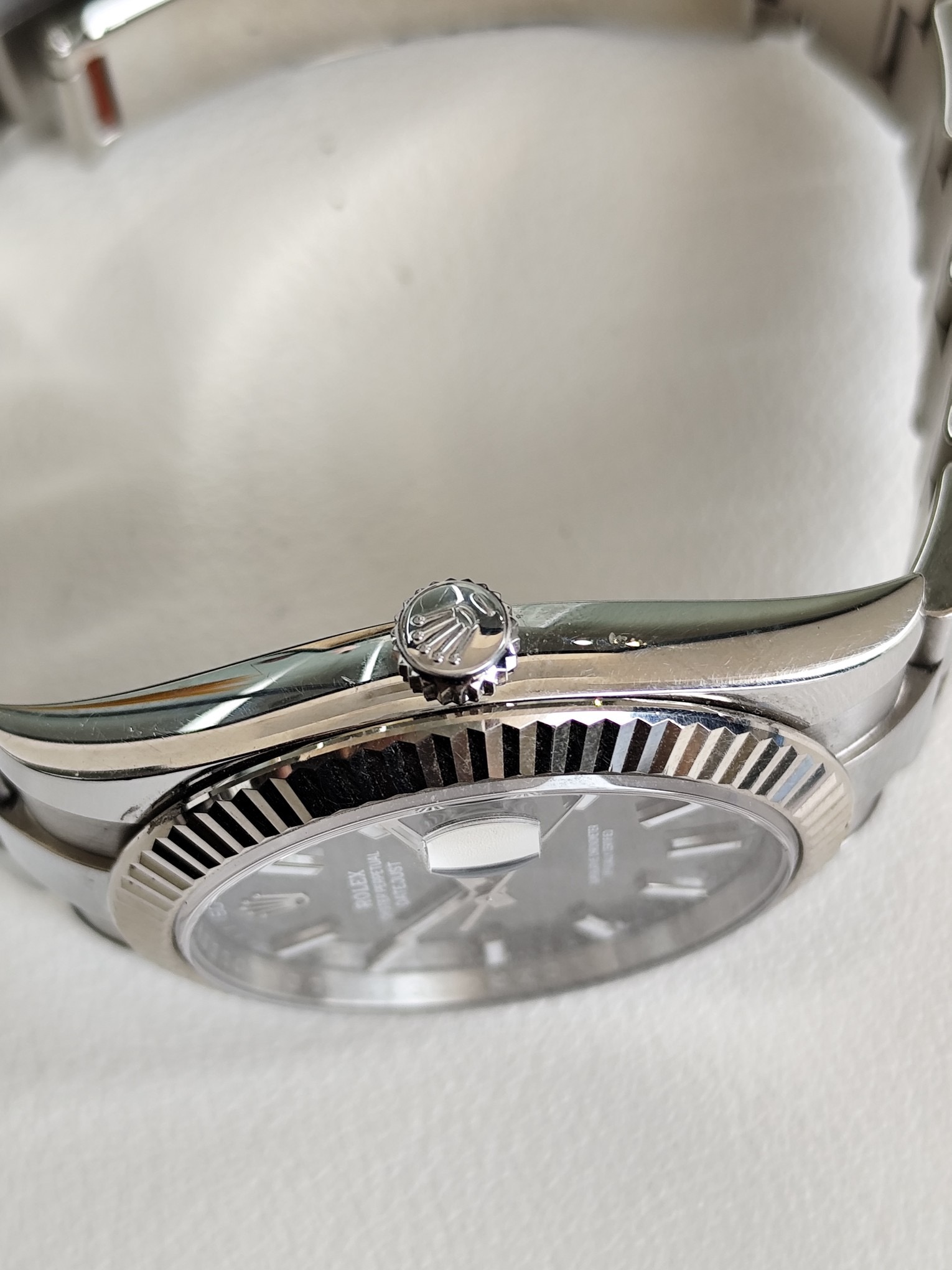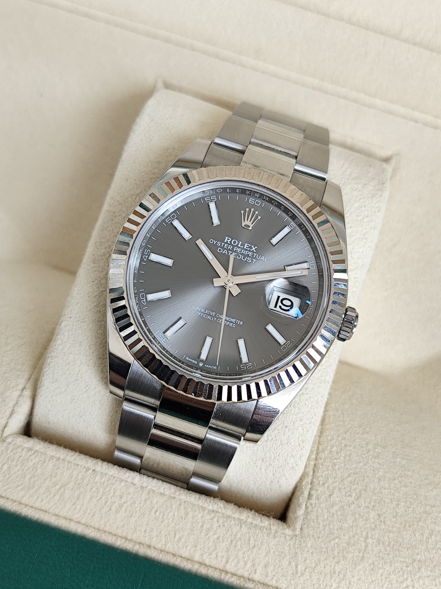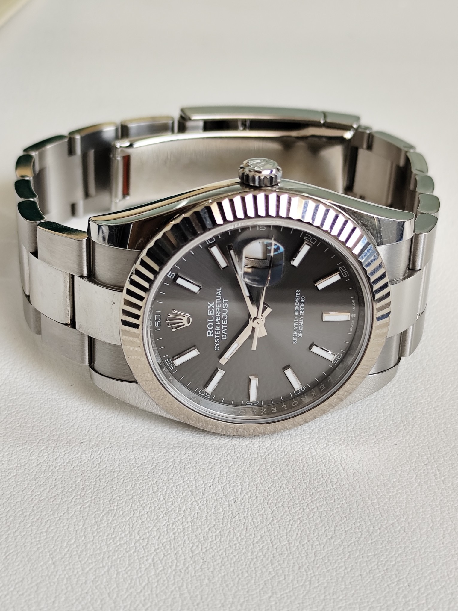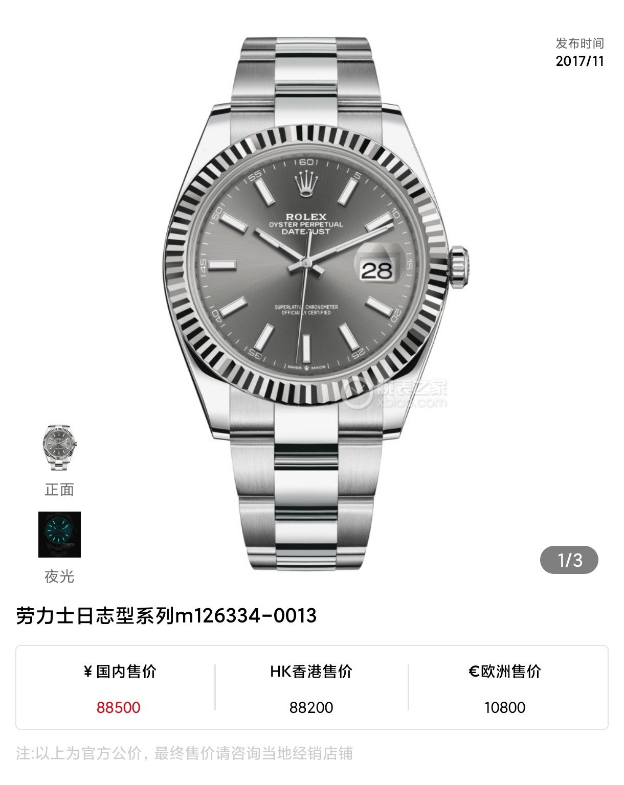 大热门新款灰盘条刻日志,41mm灰色表盘,条形刻度指针,夜光指示,放大镜日历,倒三角坑纹18K白金狗牙圈,搭载自产3235自动上链机芯,超卓天文台认证!