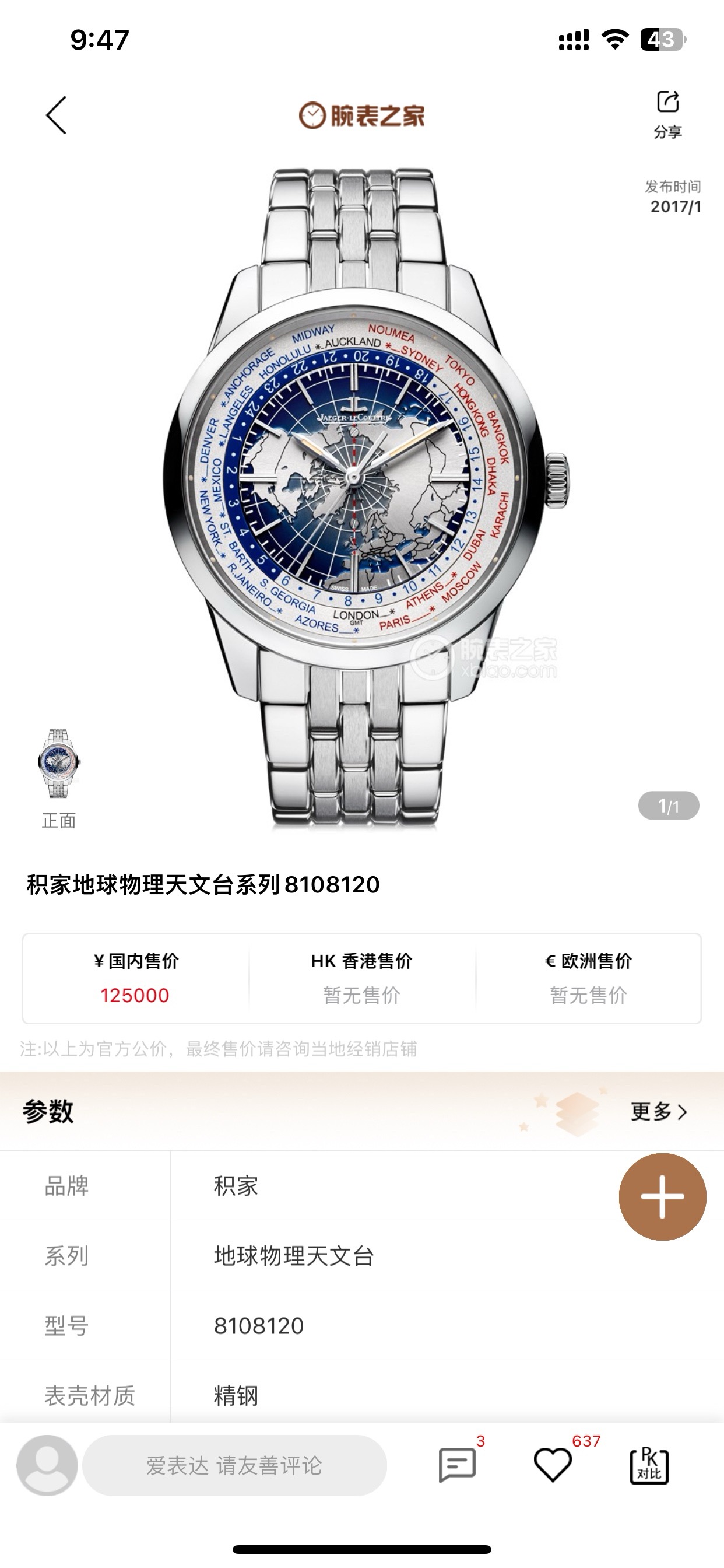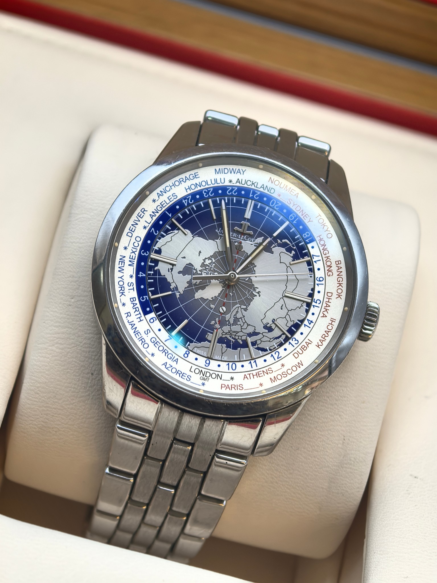 积家地球物理天文台 Q8108120 自动机械男士腕表,独特的跳秒设计 世界时功能 表径:41.6毫米,19年全套带发票,已延保8年至2027年保修,专柜售价:125000元 店内现货好价