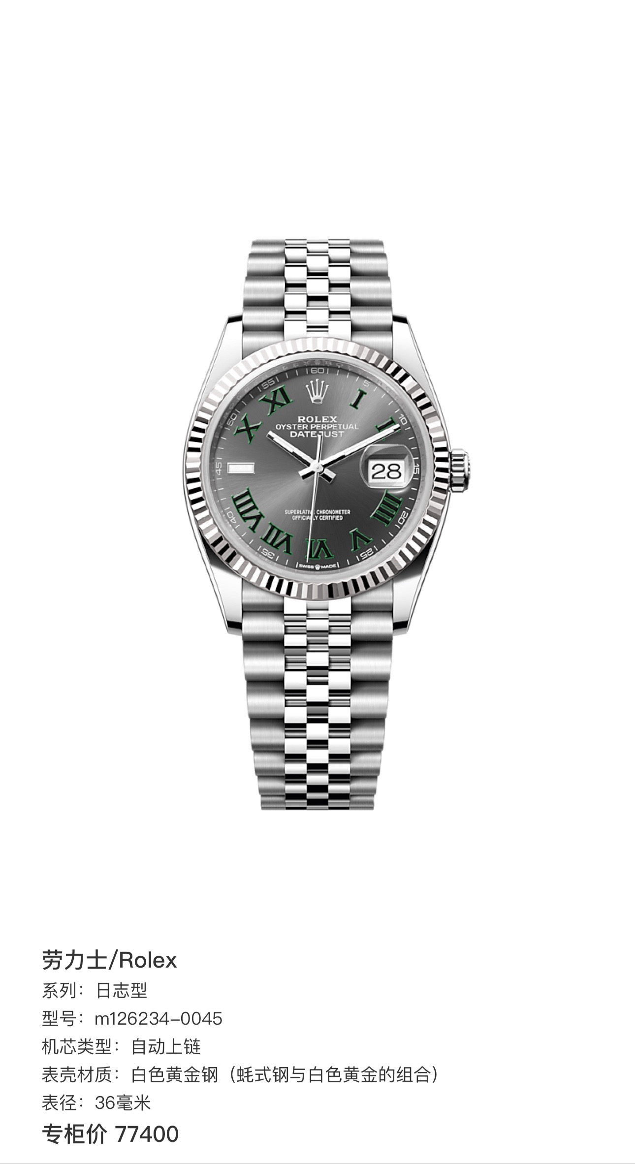 劳力士/Rolex 日志型 m126234-0045 自动上链 白色黄金钢(蚝式钢与白色黄金的组合)36毫米 专柜价77400