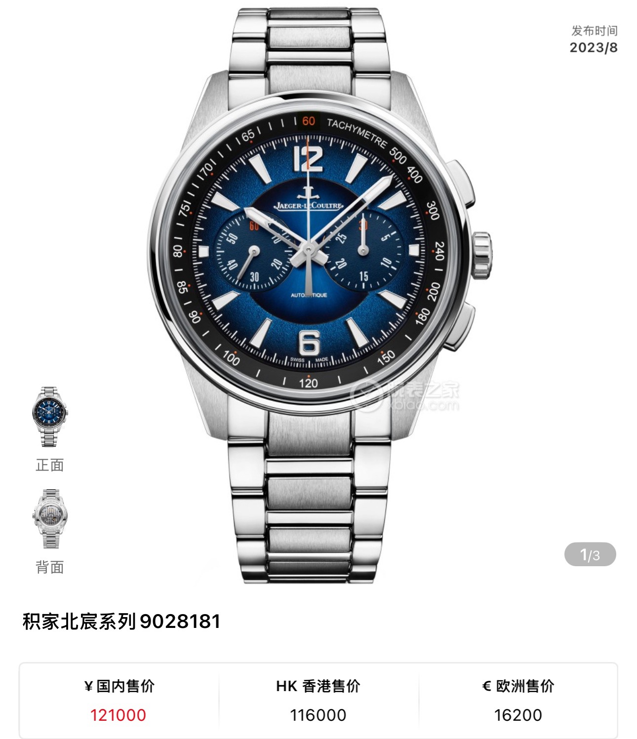 积家北宸系列 Q9028181男士自动机械腕表 新款北辰双表带 表径42毫米 蓝色表盘 背透机芯 背透机芯 搭配折叠扣 采用精钢材质打造 计时显示 专柜价121000