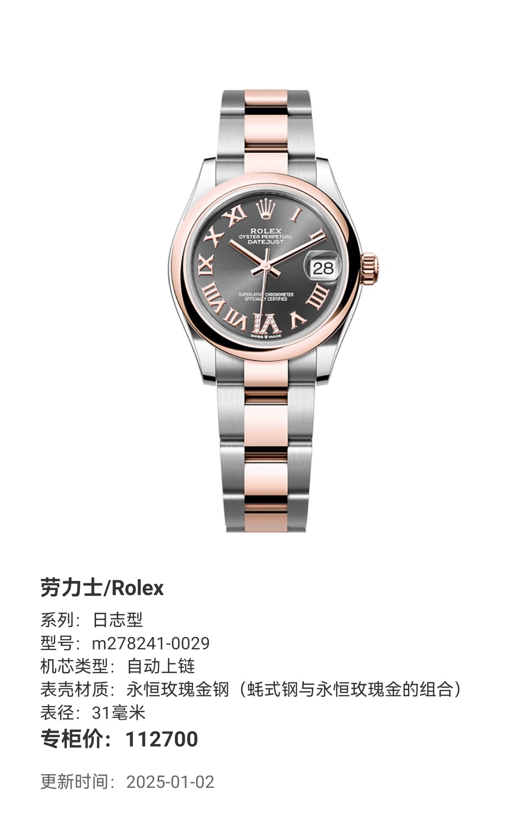 劳力士/Rolex 日志型 m278241-0029 自动上链 永恒玫瑰金钢(蚝式钢与永恒玫瑰金的组合) 31毫米 专柜价112700