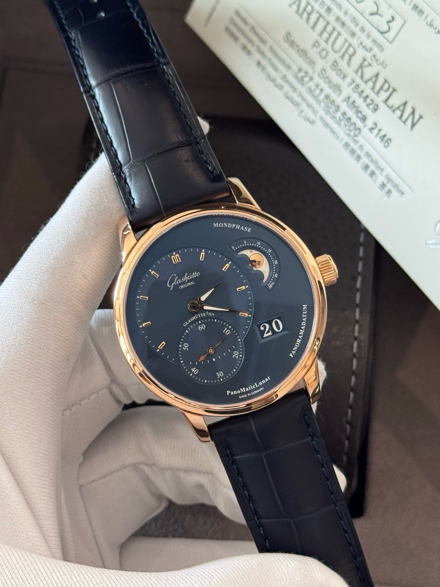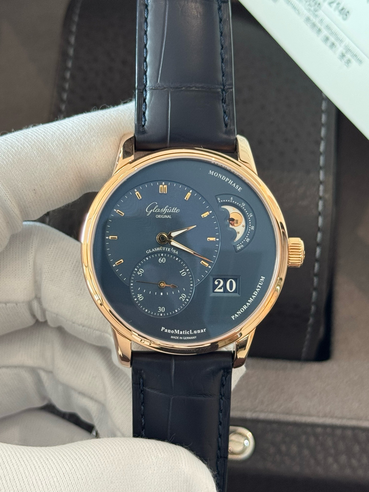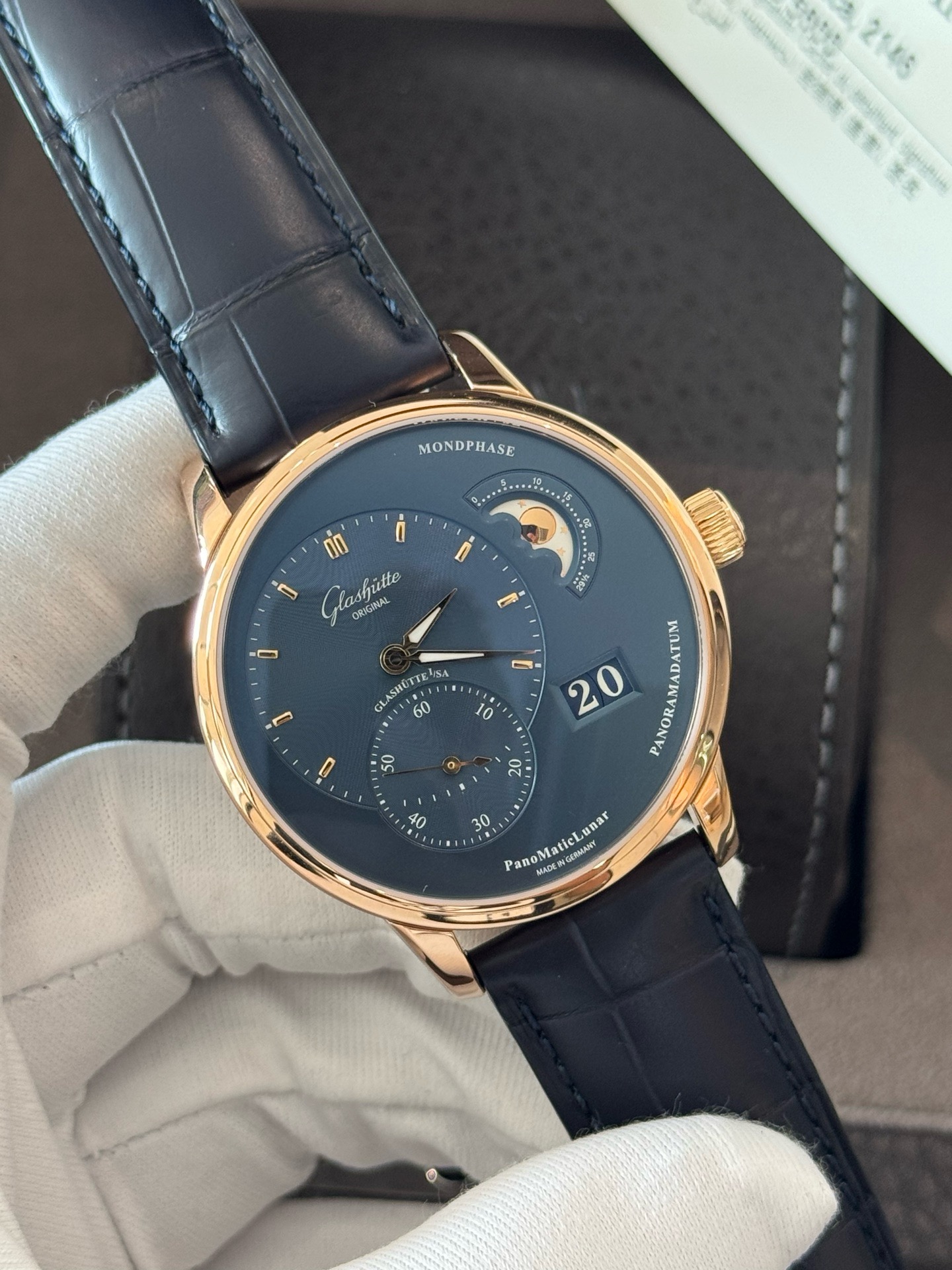 23格拉苏蒂偏心系列1-90-02-11-35-30 男士自动机械腕表 热门款蓝偏心 表径40毫米 动力储备40个小时 蓝色表盘 搭配金折叠扣 采用玫瑰金材质打造 大历日 显示 月相显示 专柜价181000 现货好价