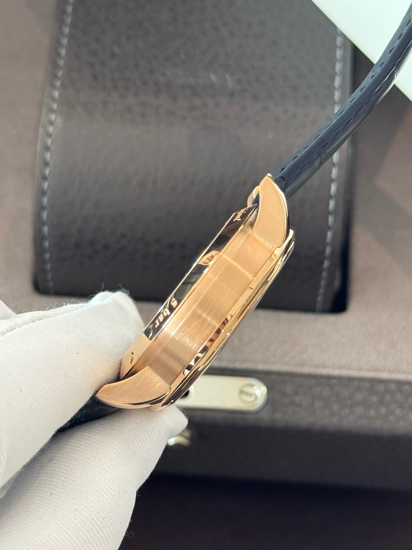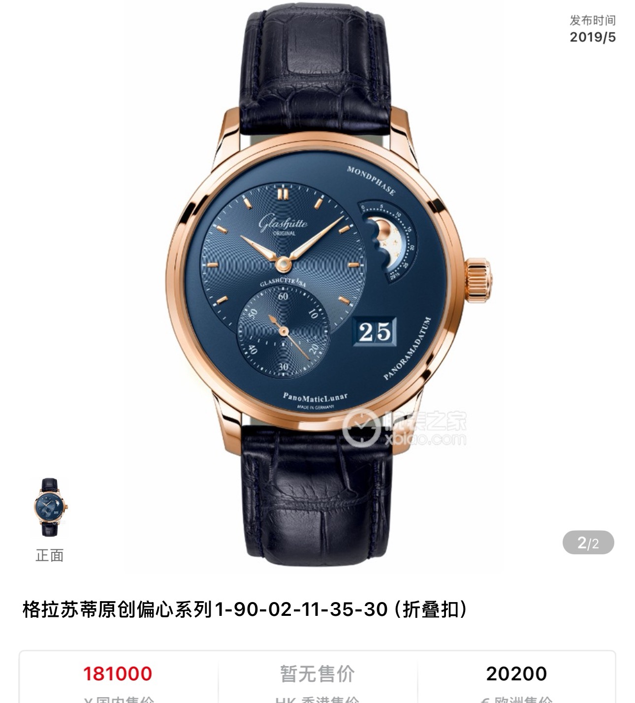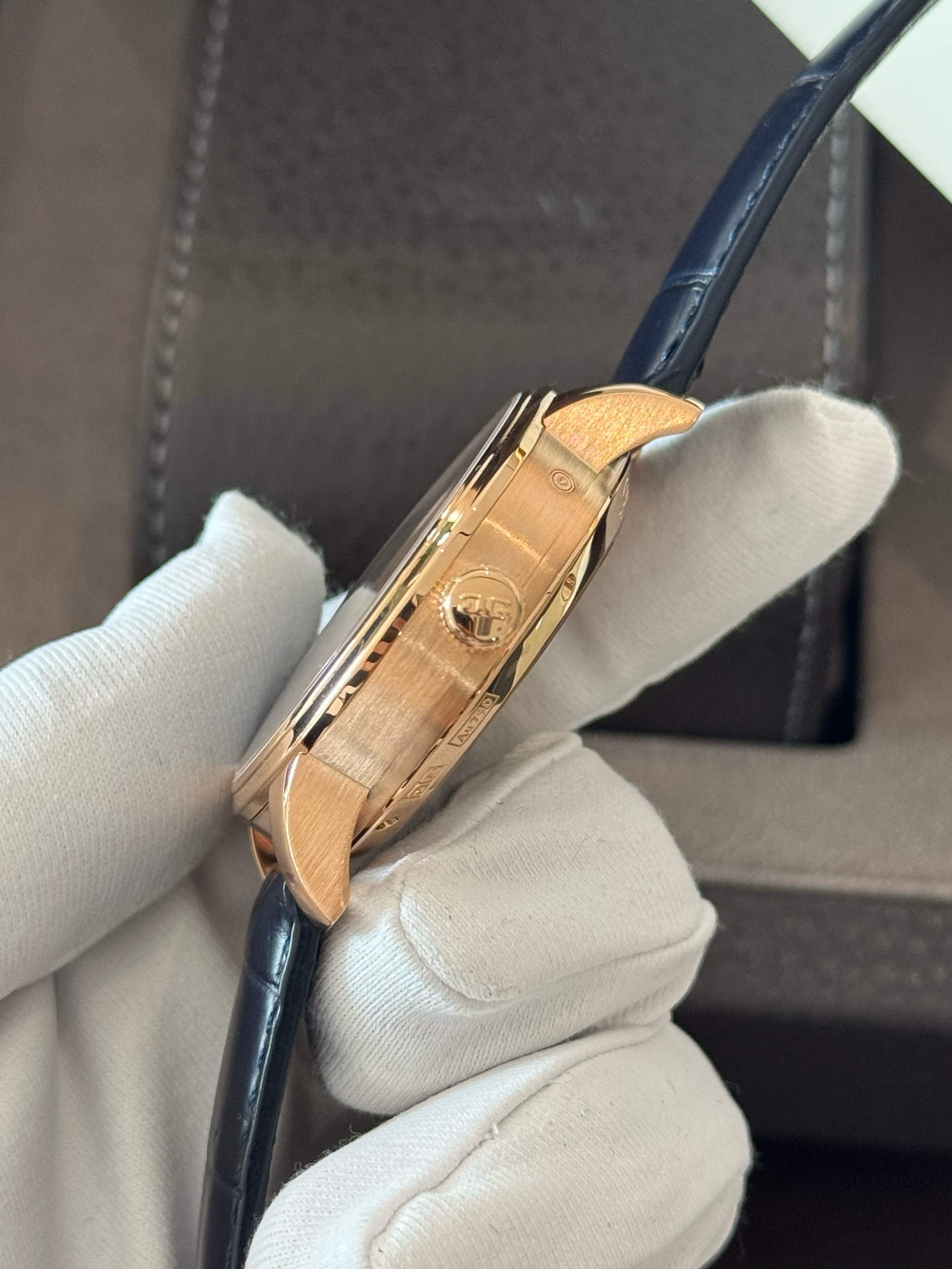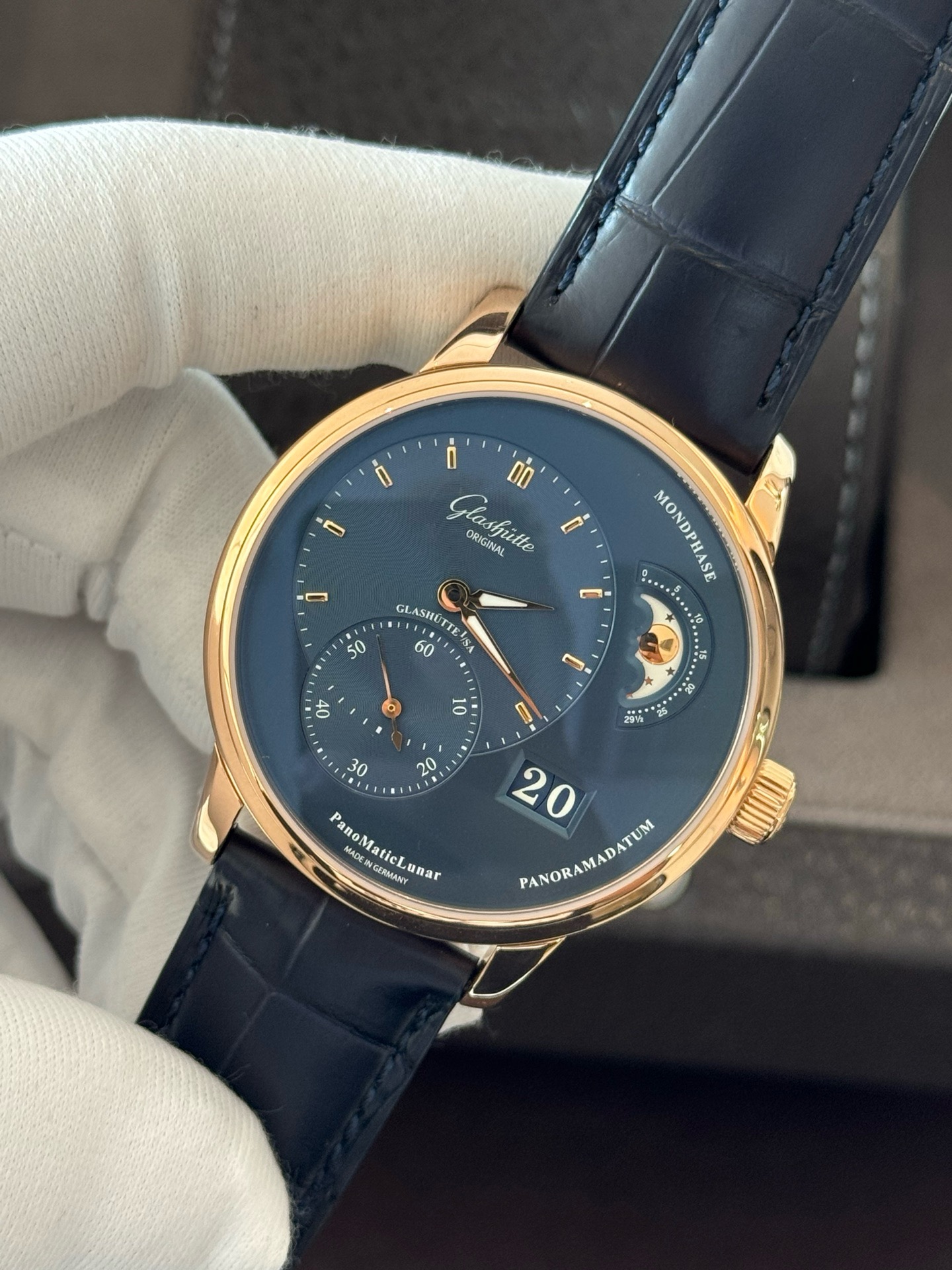 23格拉苏蒂偏心系列1-90-02-11-35-30 男士自动机械腕表 热门款蓝偏心 表径40毫米 动力储备40个小时 蓝色表盘 搭配金折叠扣 采用玫瑰金材质打造 大历日 显示 月相显示 专柜价181000 现货好价