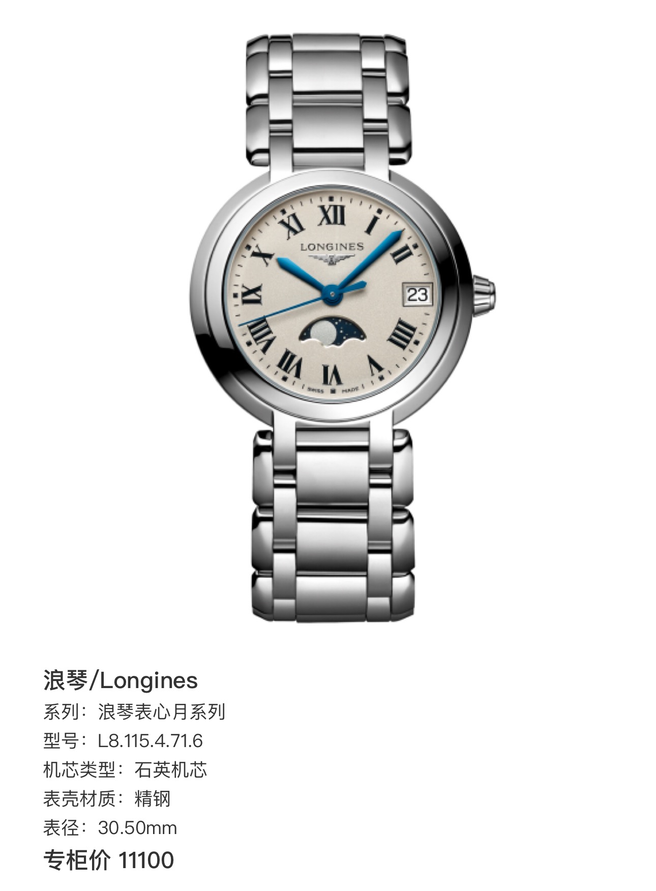 浪琴 心月系列 L8.115.4.71.6 石英机芯 精钢 30.50mm 专柜价11100,25年全套,好价