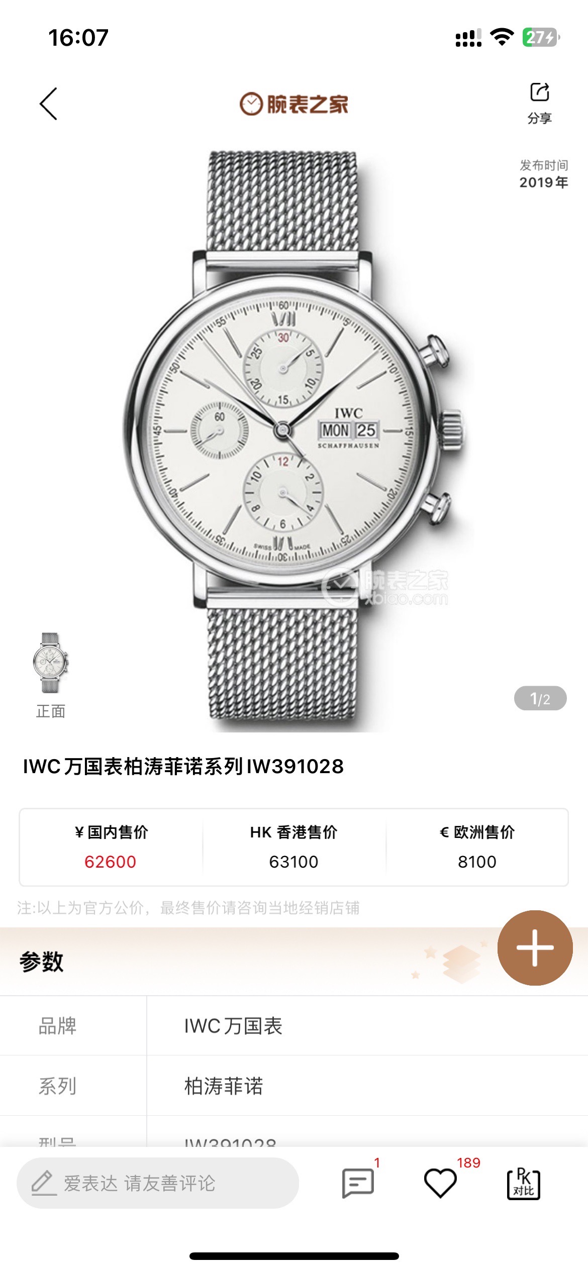 万国柏涛菲诺系列IW391028,自动机械,精钢材质,表径42mm,专柜价62600, 全套未使用品 现货