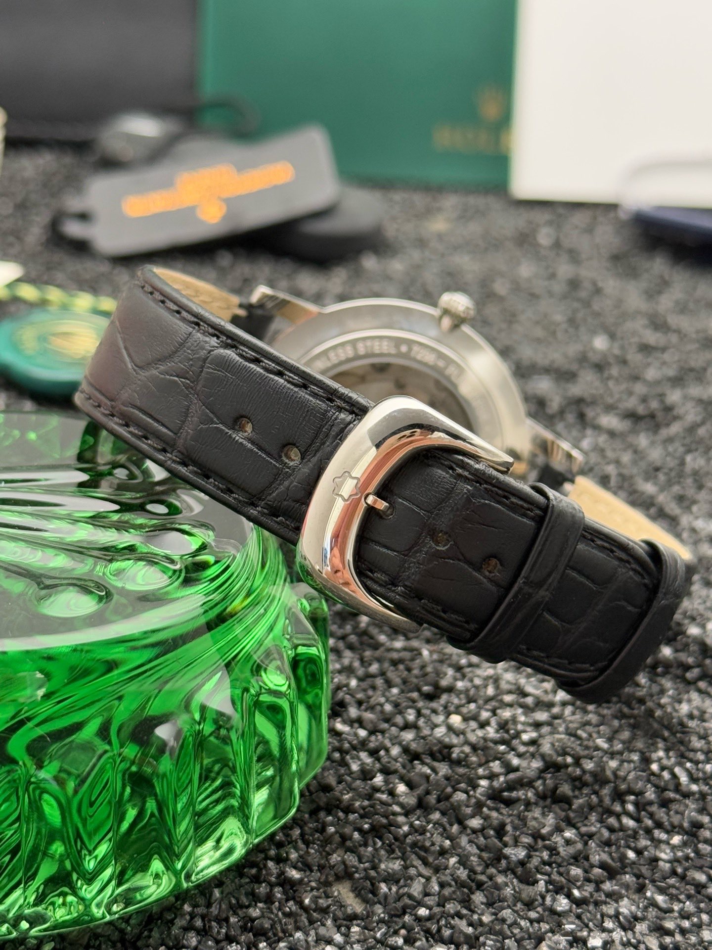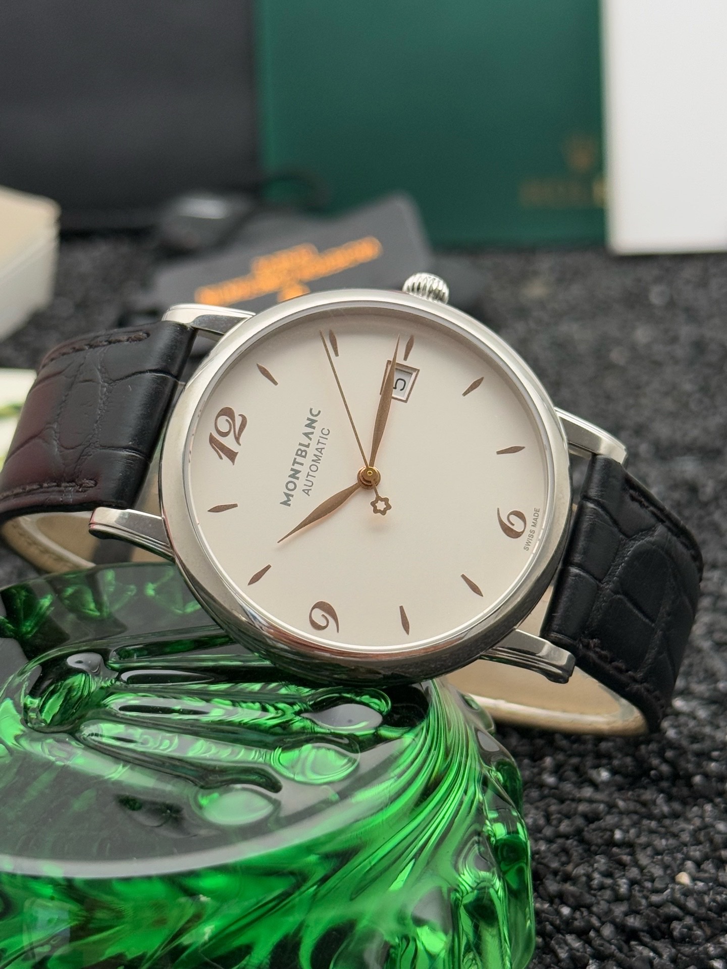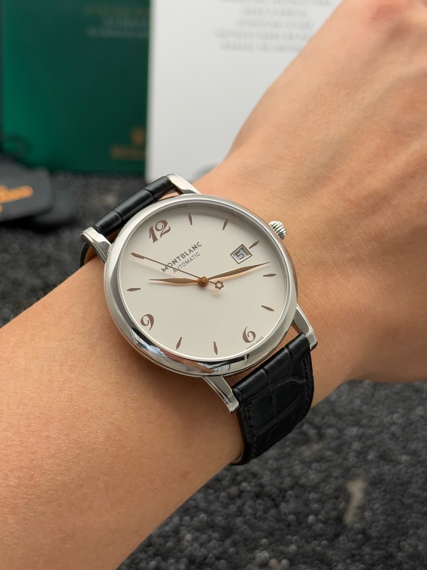 万宝龙 明星经典 未使用99新全套附件【有存放痕迹】 表径39MM 儒雅气质男士的首选 金针与金时标把单调白面承托到极致美感 就是一个“雅” 男士自动机械 专柜价25600元 现货好价8xxx元