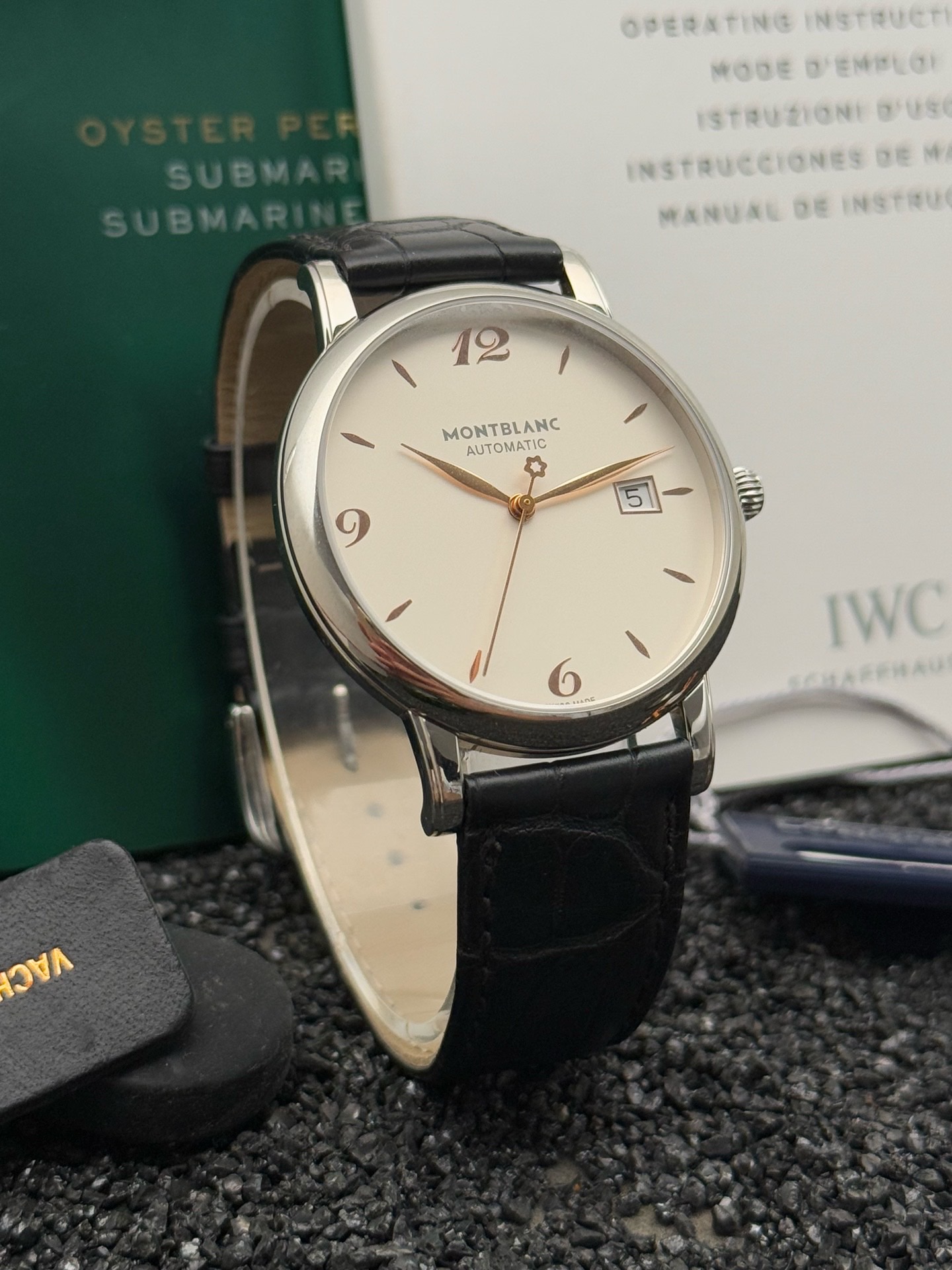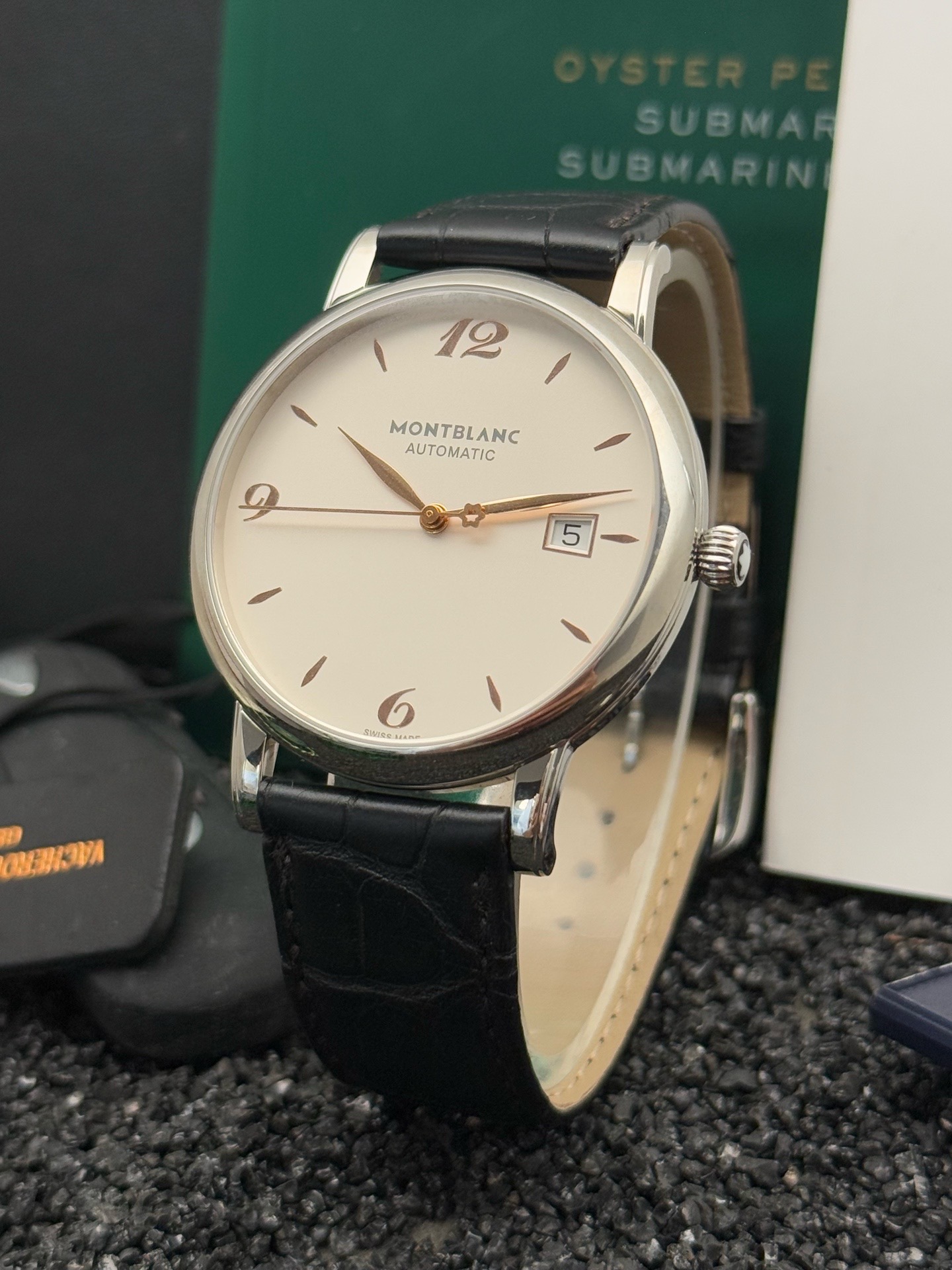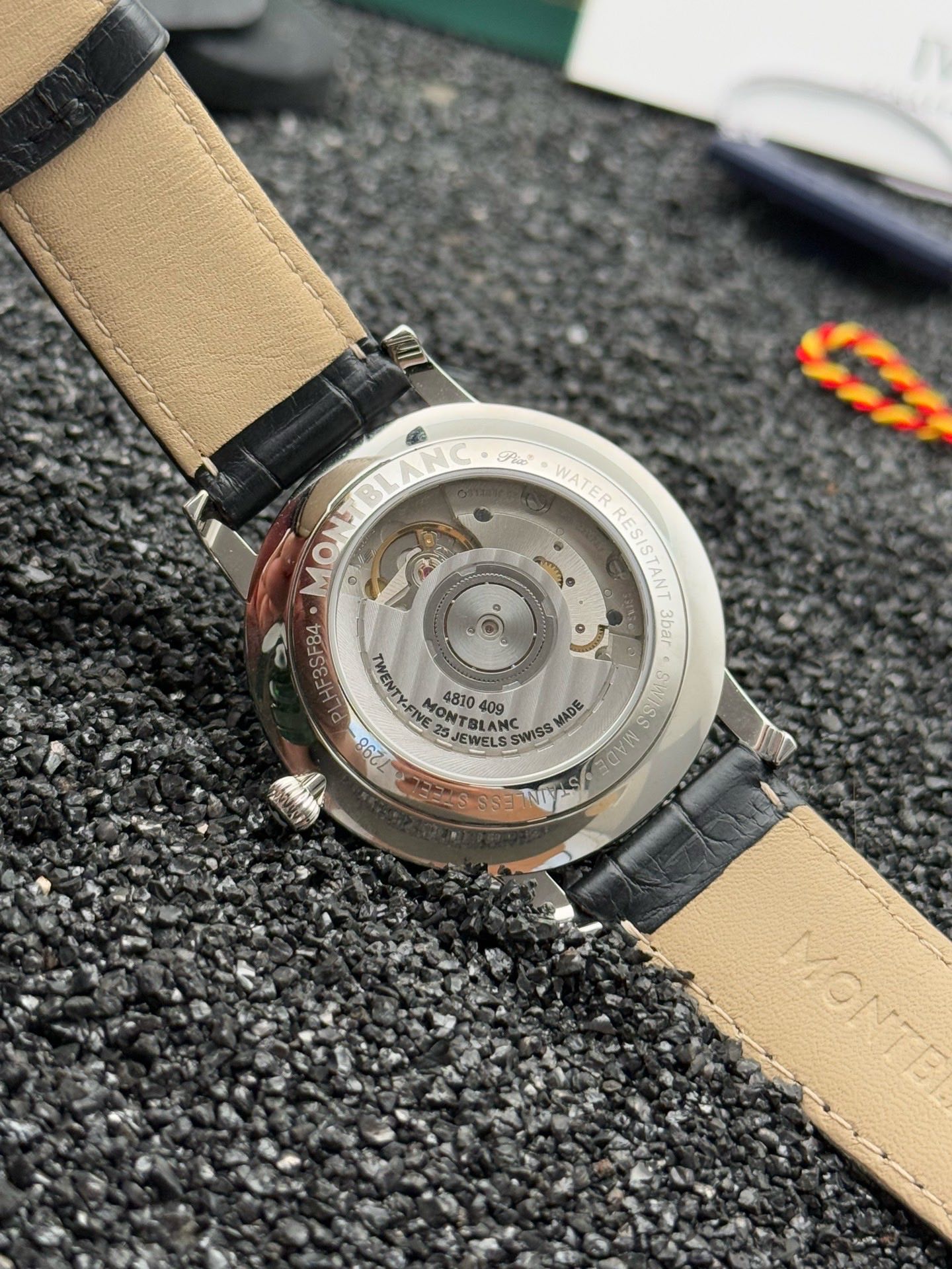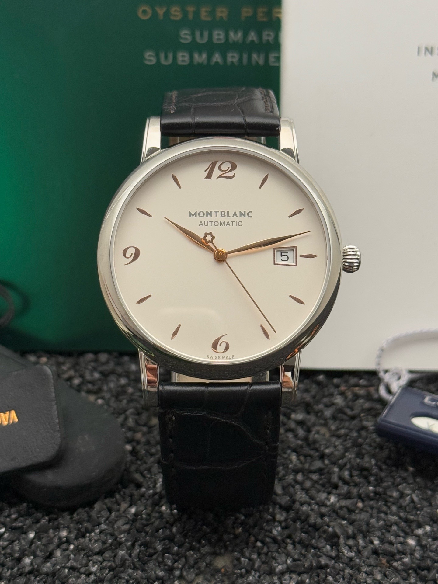 万宝龙 明星经典 未使用99新全套附件【有存放痕迹】 表径39MM 儒雅气质男士的首选 金针与金时标把单调白面承托到极致美感 就是一个“雅” 男士自动机械 专柜价25600元 现货好价8xxx元