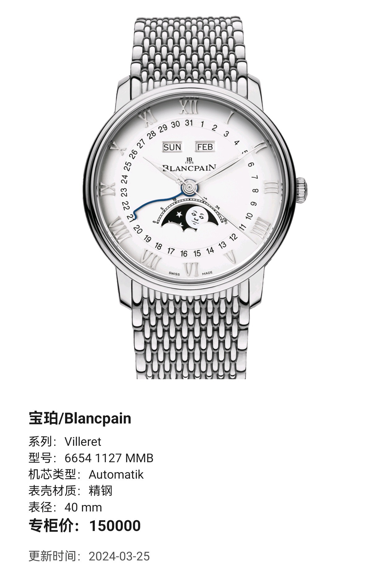 宝珀/经典系列 6654-1127-MMB Automatik 精钢材质 表径40 mm 背透设计 专柜价150000 现货好价