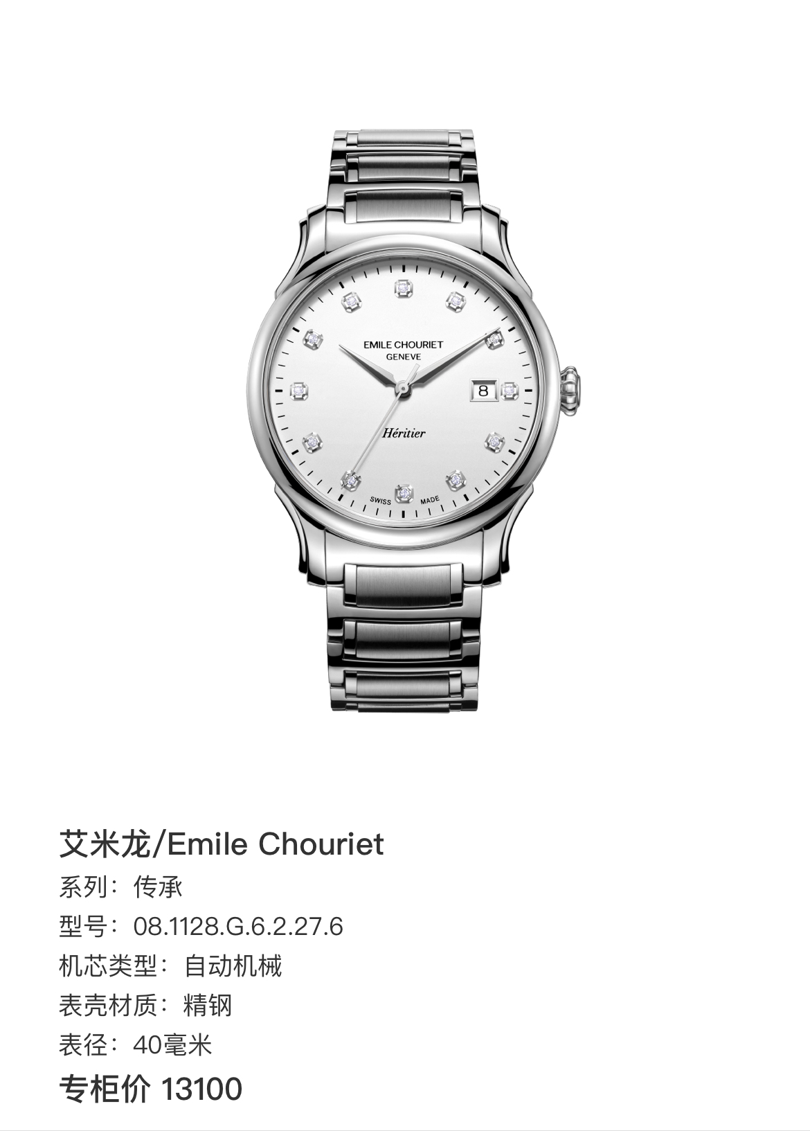 艾米龙/Emile Chouriet 传承 08.1128.G.6.2.27.6 自动机械 精钢 40毫米 专柜价13100~