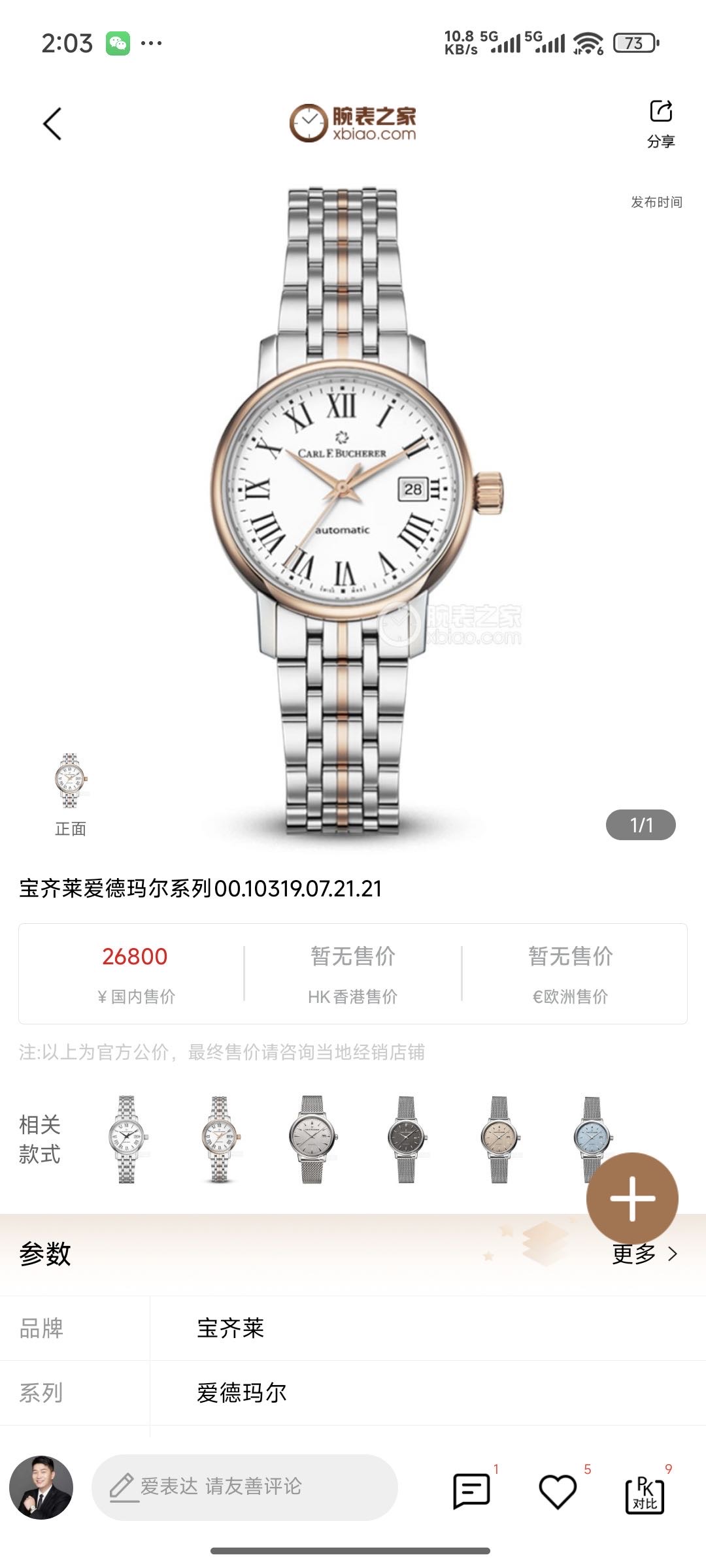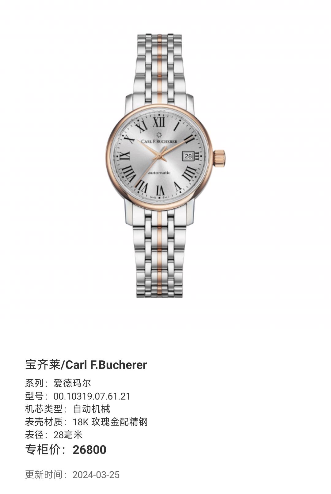 宝齐莱/Carl F.Bucherer 爱德玛尔 00.10319.07.61.21 自动机械 18K 玫瑰金配精钢 28毫米 专柜价26800元 国行全新未使用品