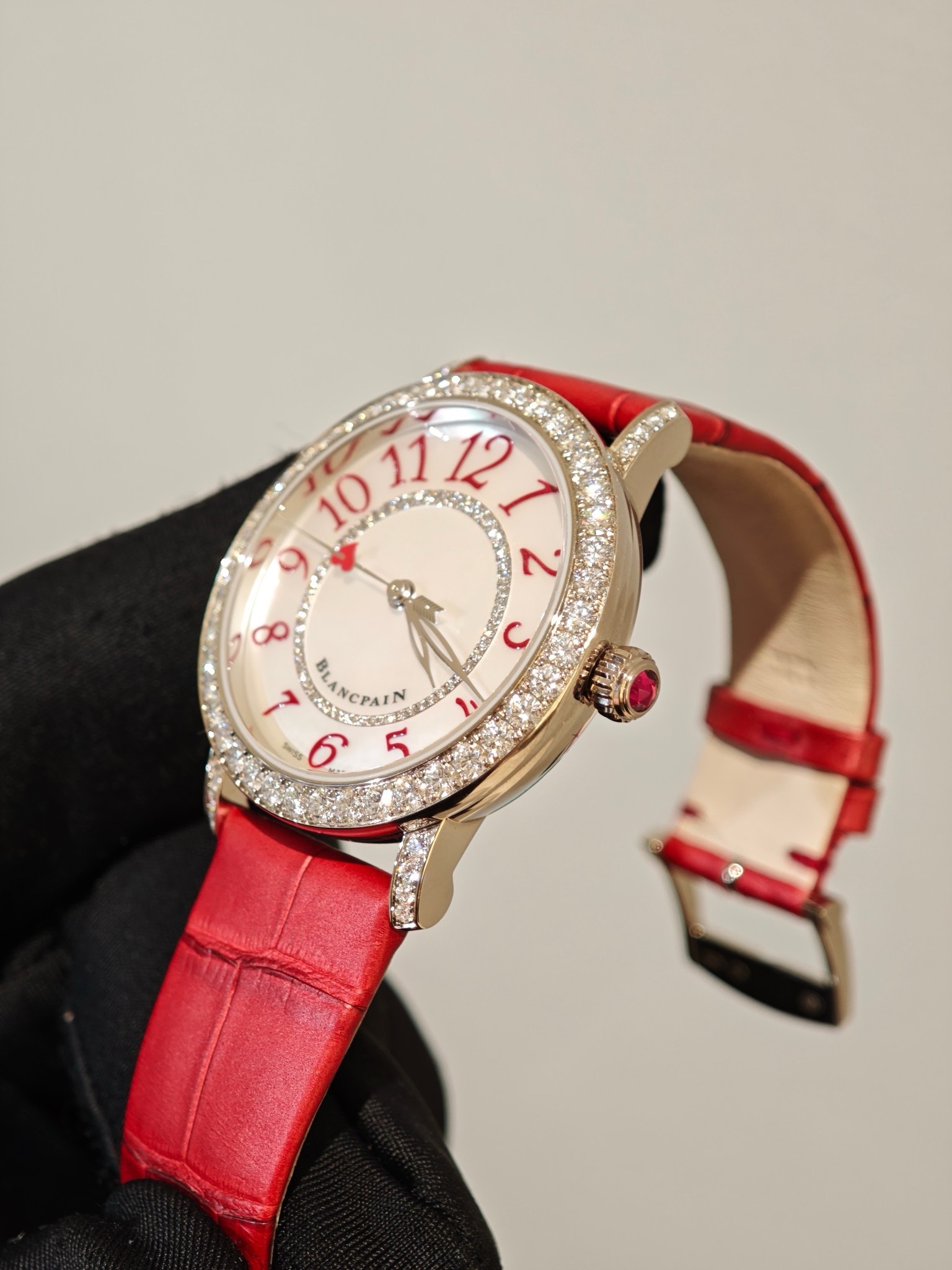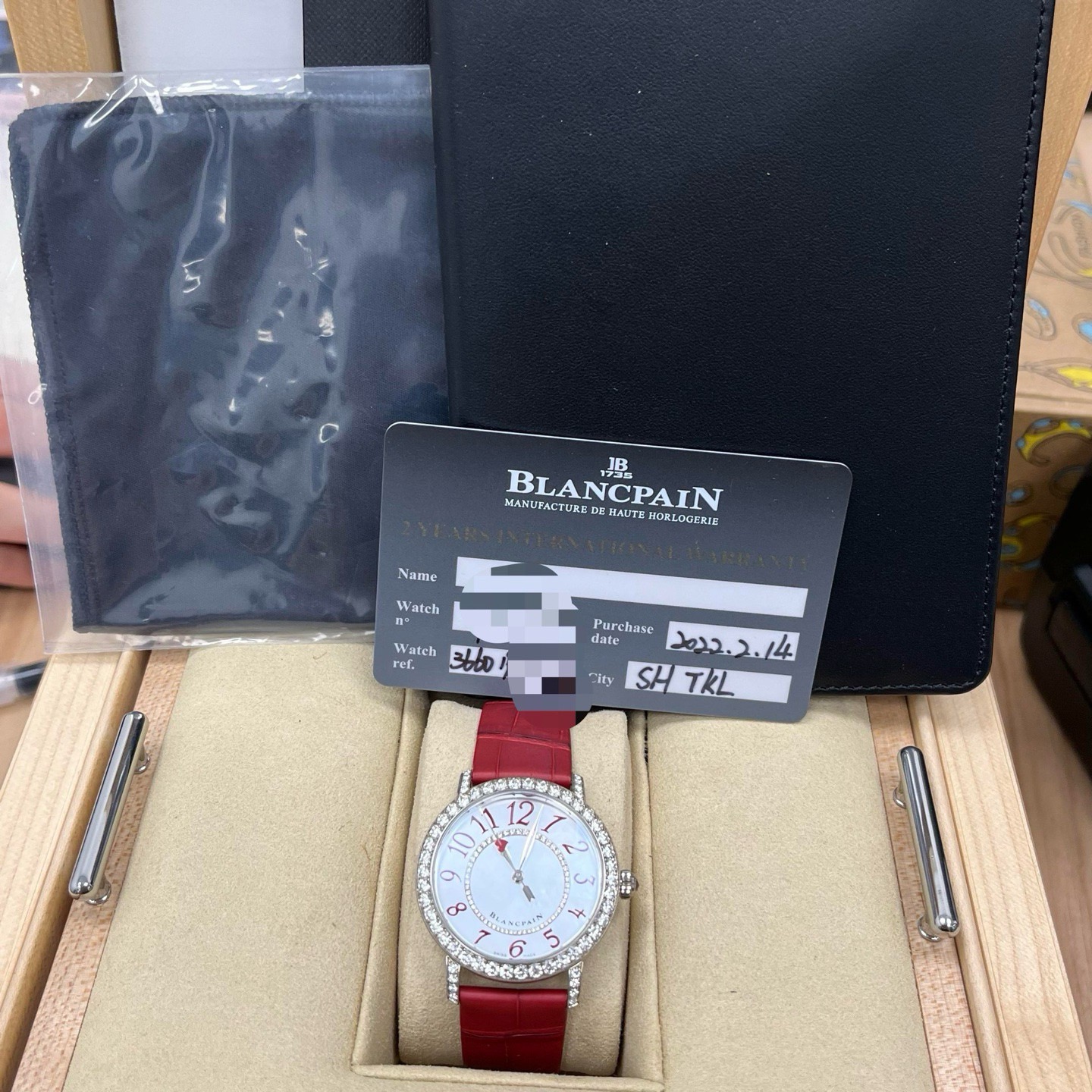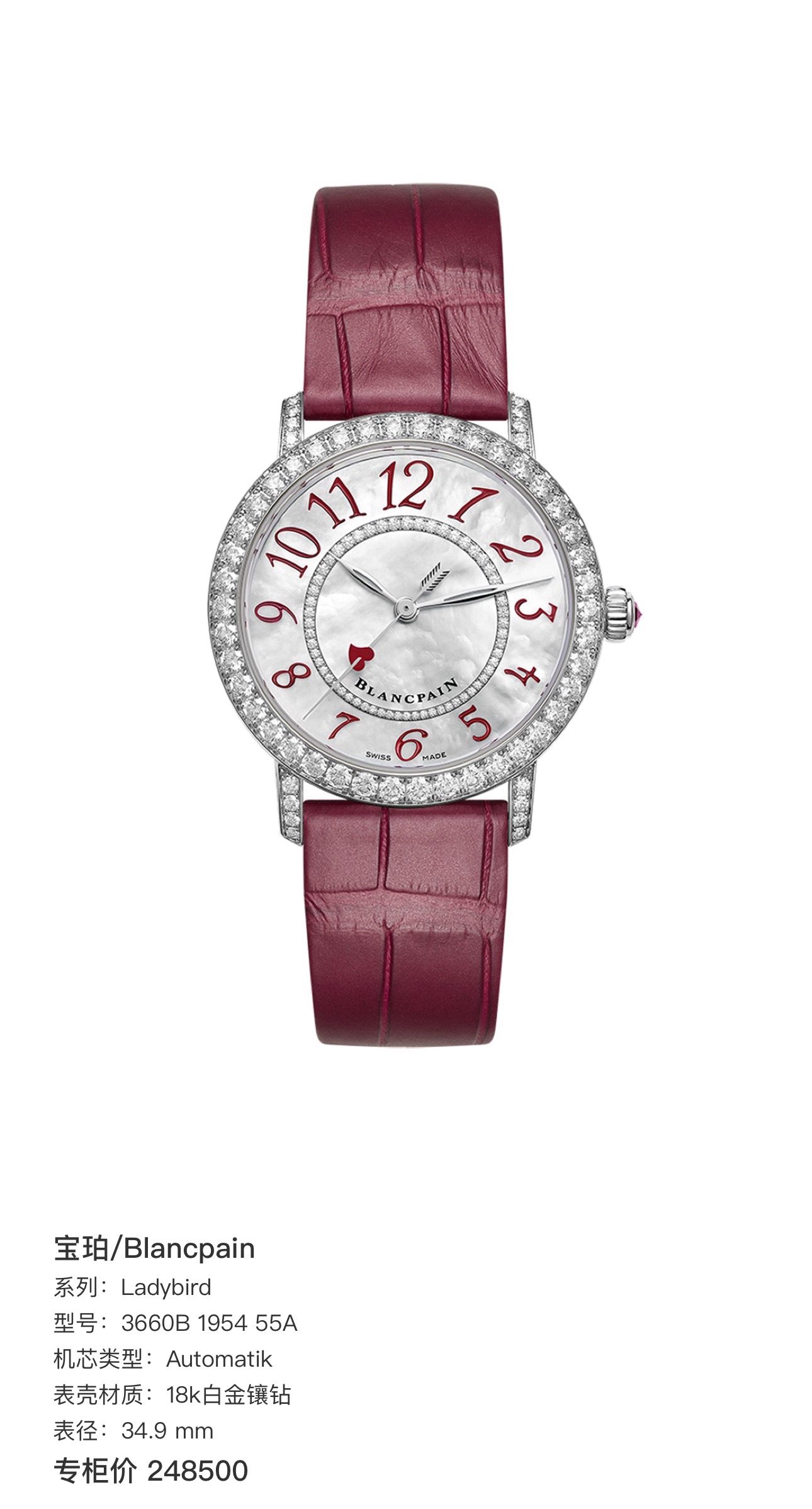 宝珀 系列:女装系列 型号:3660B-1954-55A 材质:18K白金 镜面:蓝宝石玻璃 表盖:透底 表扣:折叠扣 表径:34.9mm 机芯类型:自动机械机芯 成色新 附件:22年盒证 公价:248500