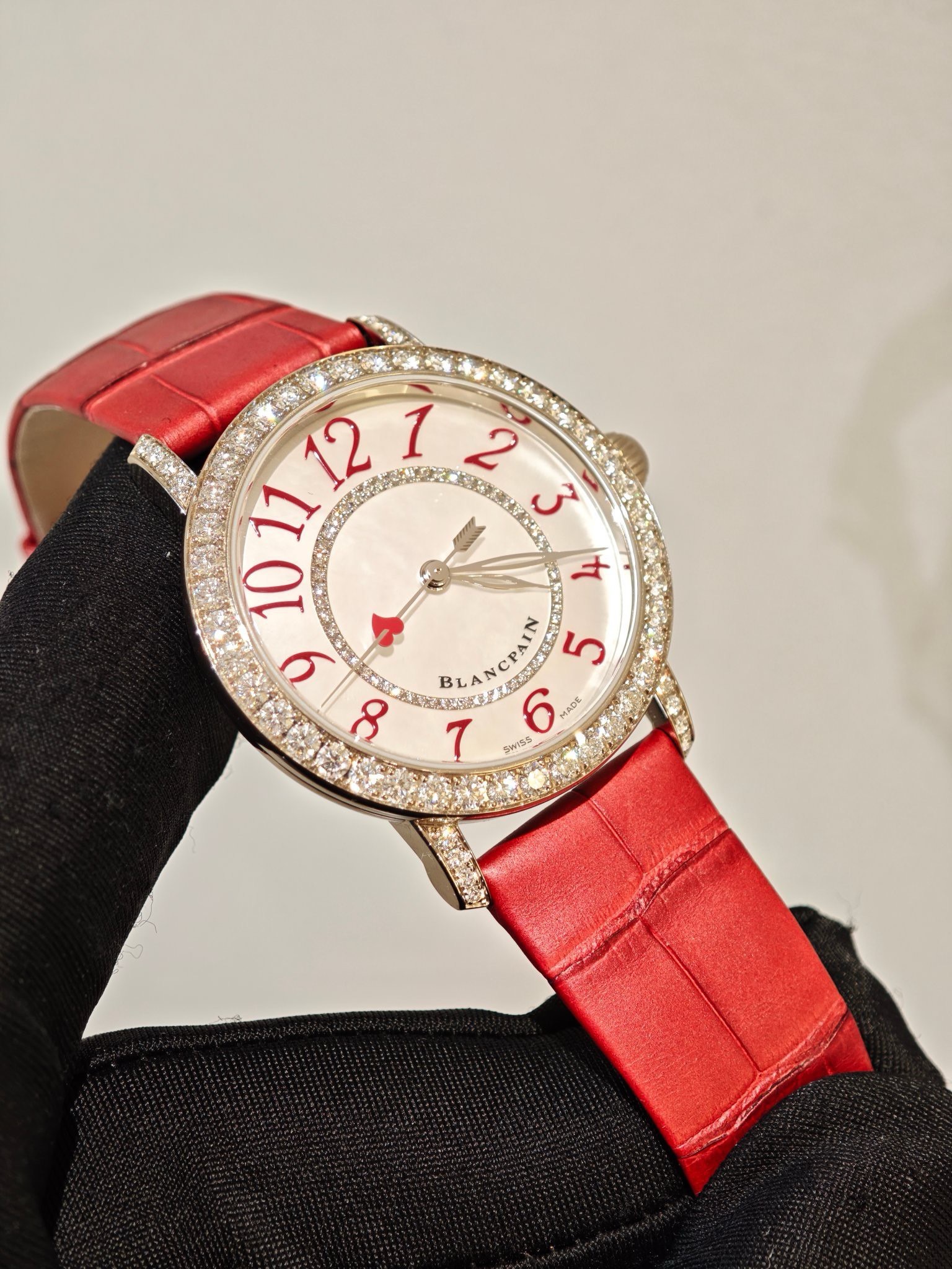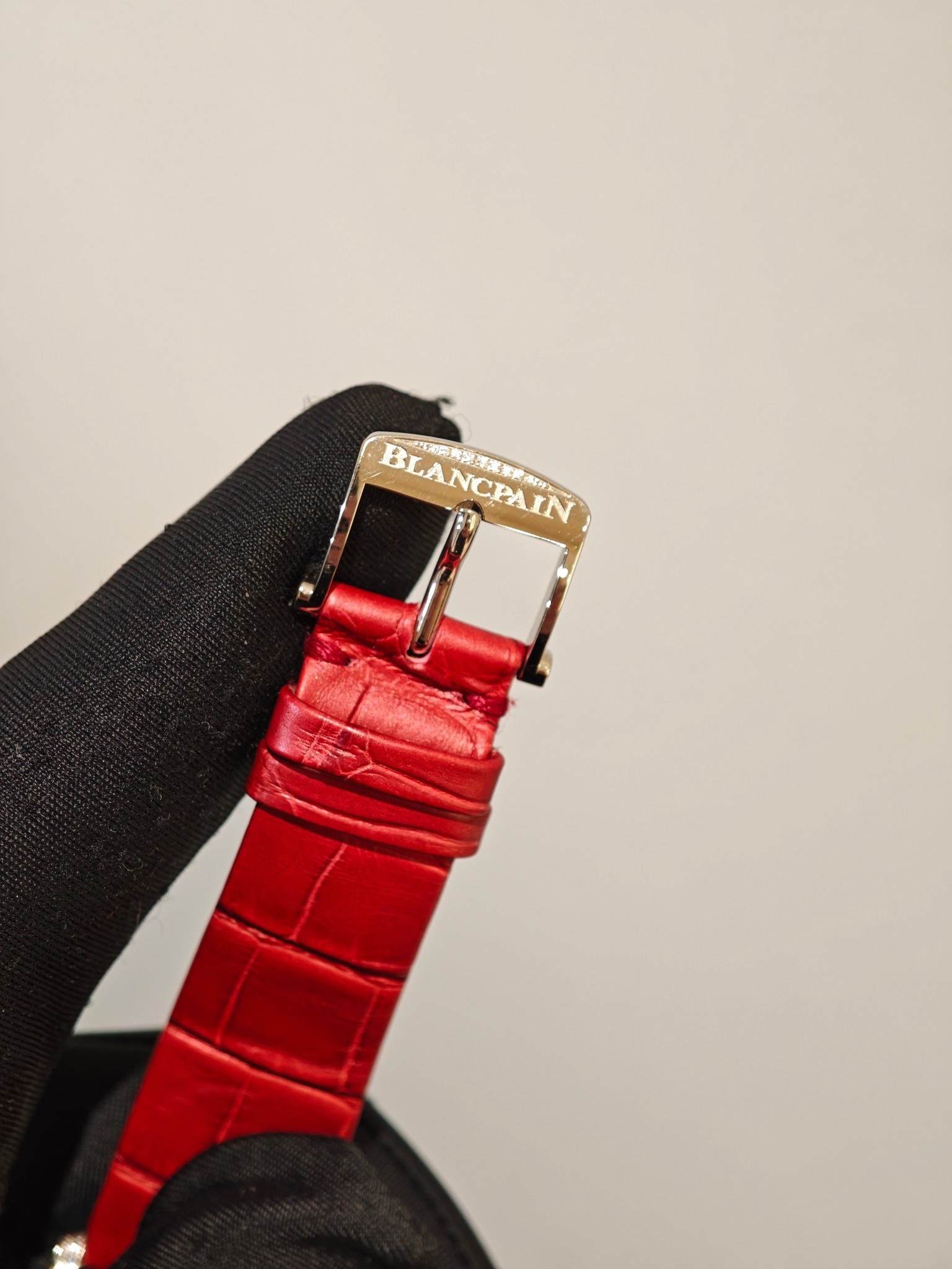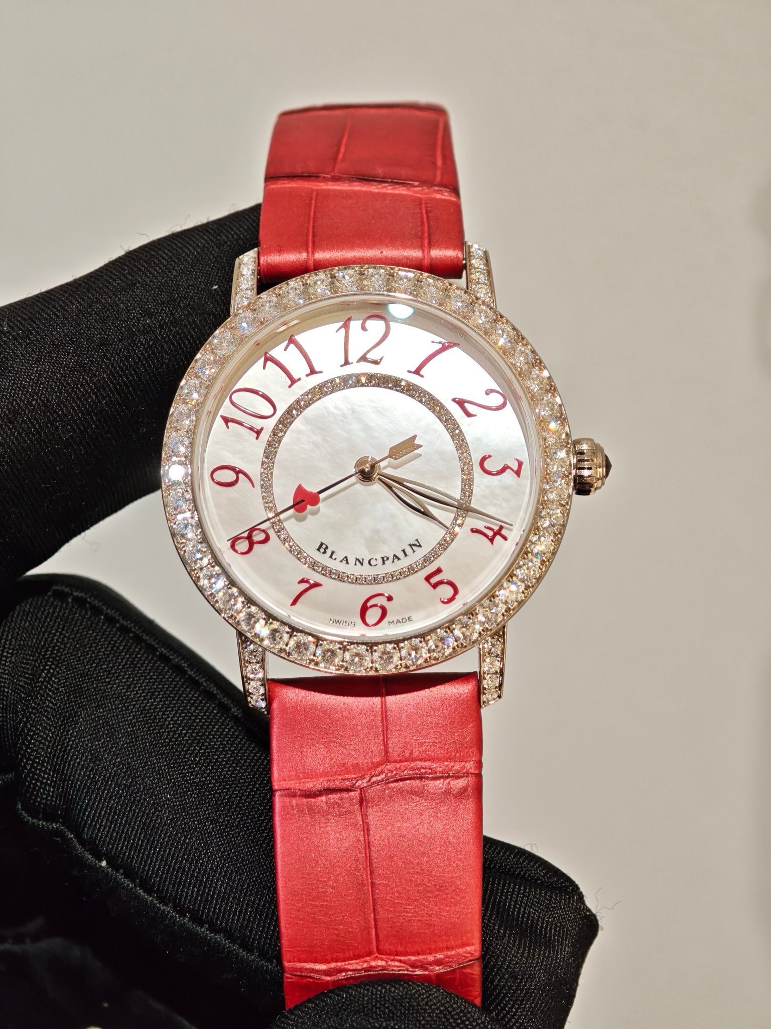 宝珀 系列:女装系列 型号:3660B-1954-55A 材质:18K白金 镜面:蓝宝石玻璃 表盖:透底 表扣:折叠扣 表径:34.9mm 机芯类型:自动机械机芯 成色新 附件:22年盒证 公价:248500