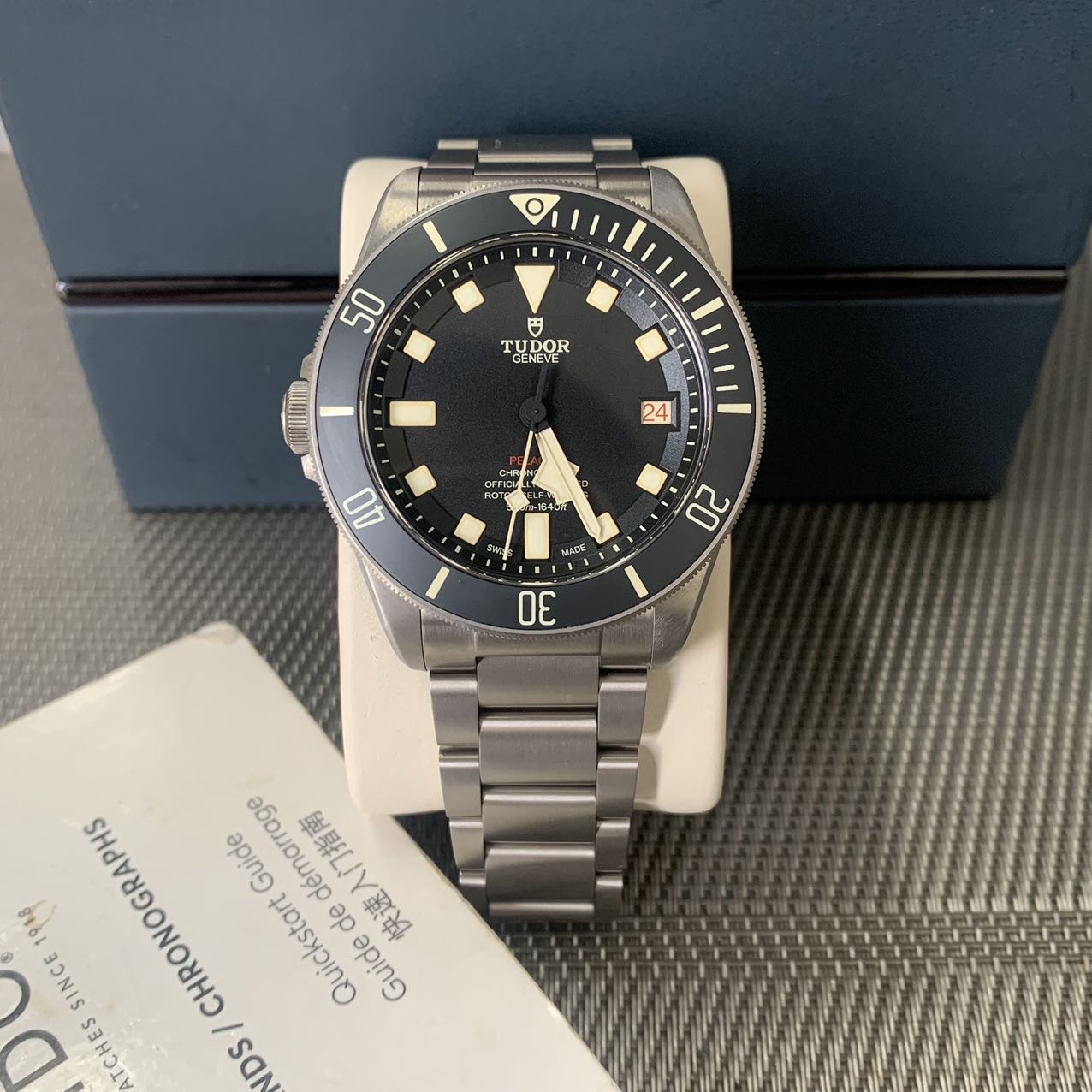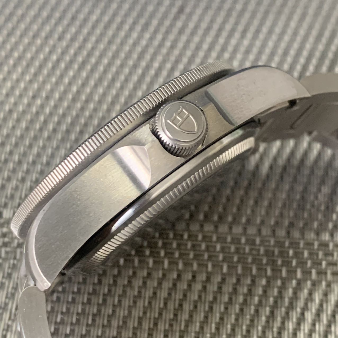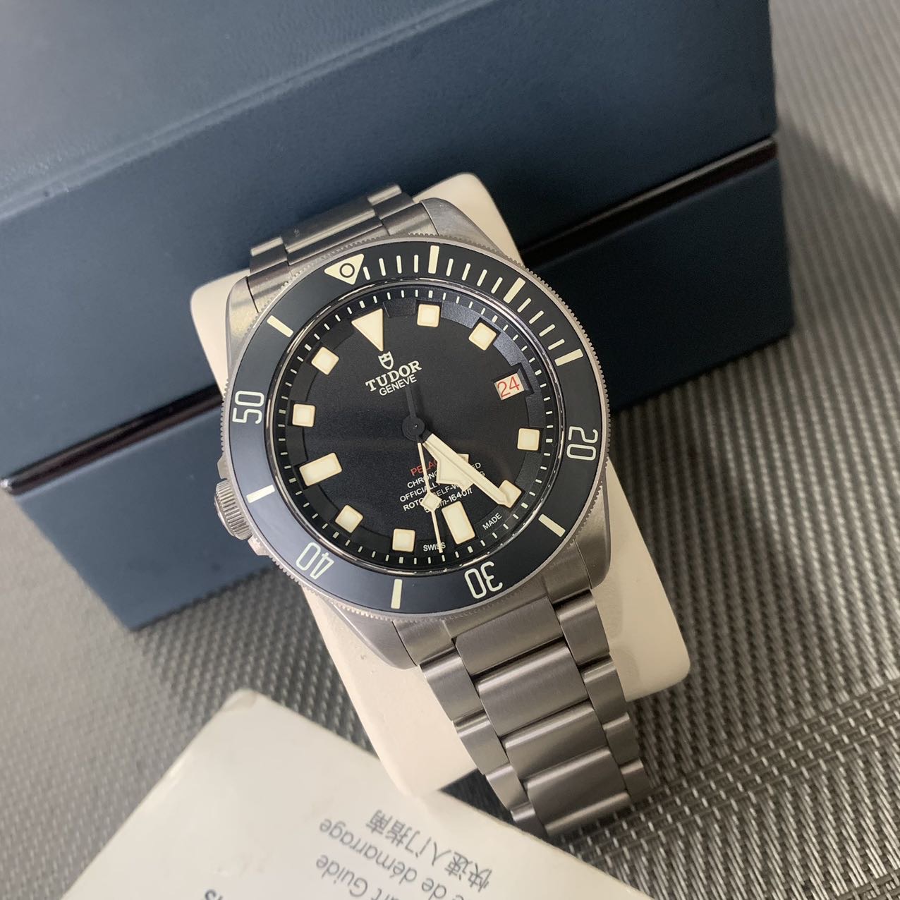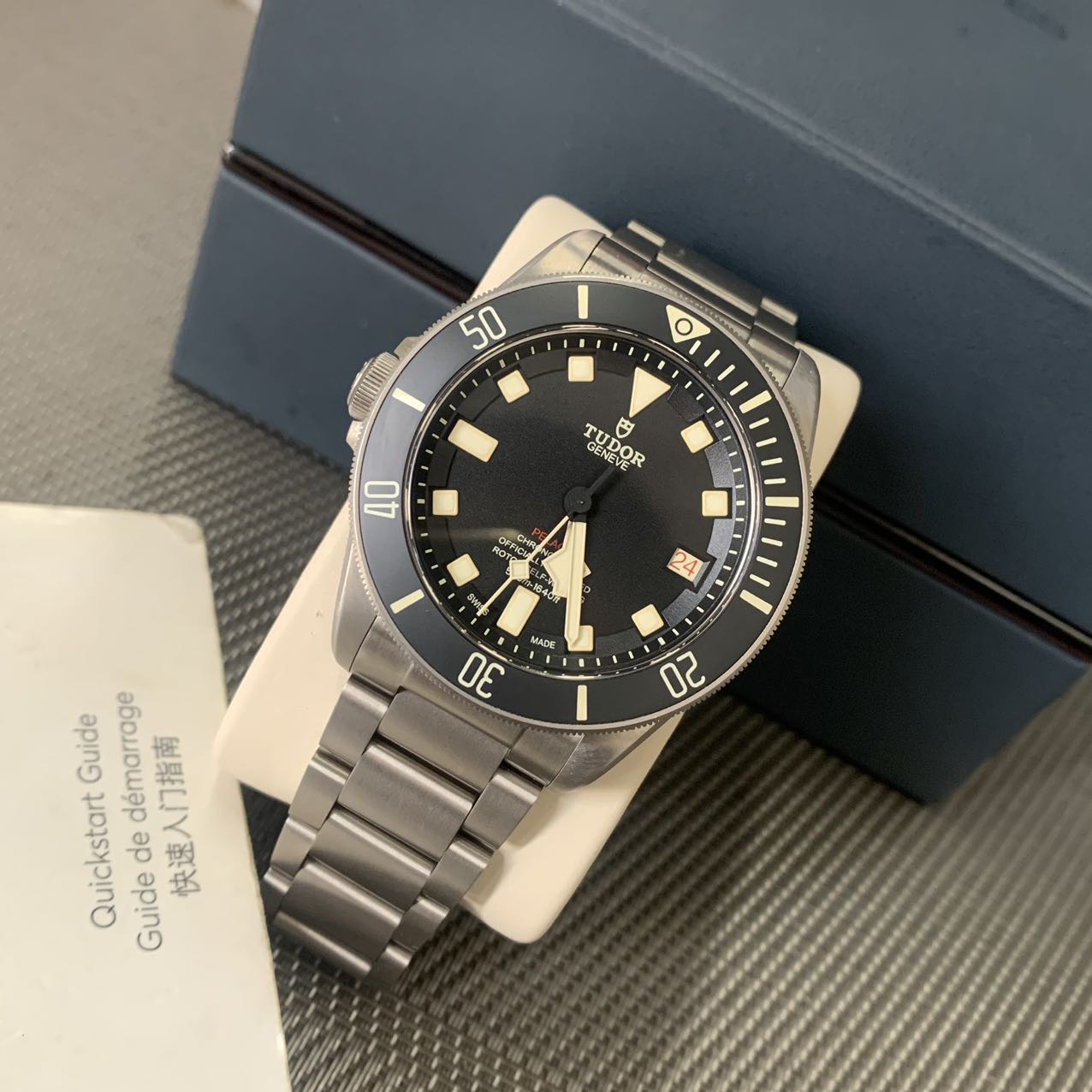 帝舵领潜型LHD 25610TN “左撇子”机械男表,公价3.98万,表径42mm,防水深度500m,全套附件齐全(2021年购买),钛合金材质表壳,哑光黑陶瓷材质表圈,米色夜光指针刻度,搭载新款MT5612-LHD机芯,独有左侧把头设计,惯性微调平衡摆轮、微调螺丝。