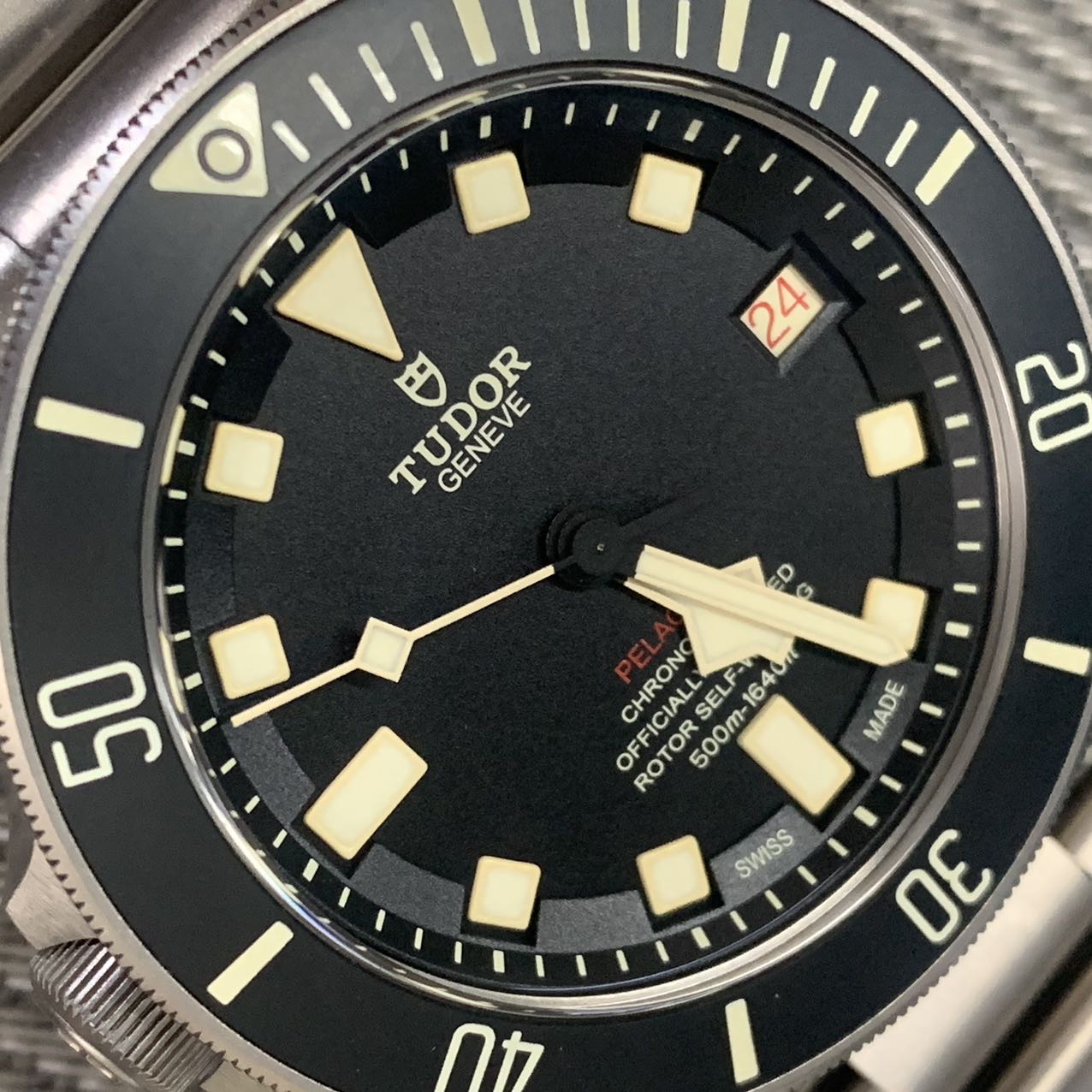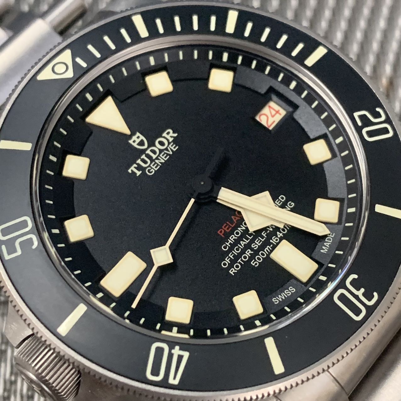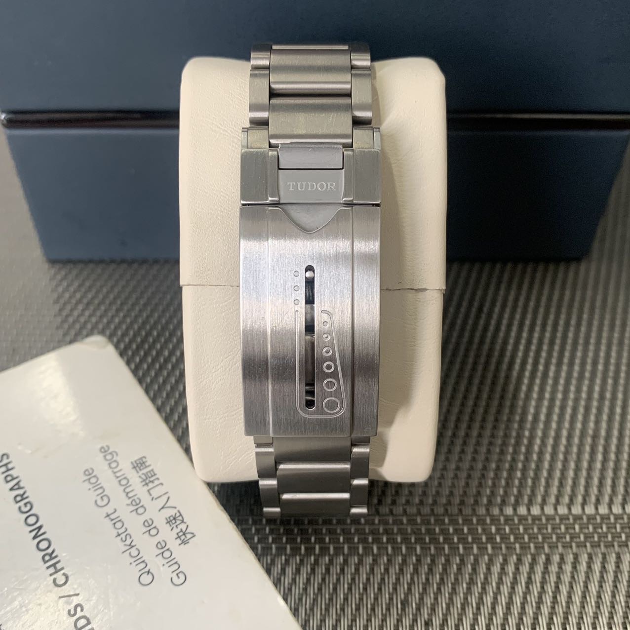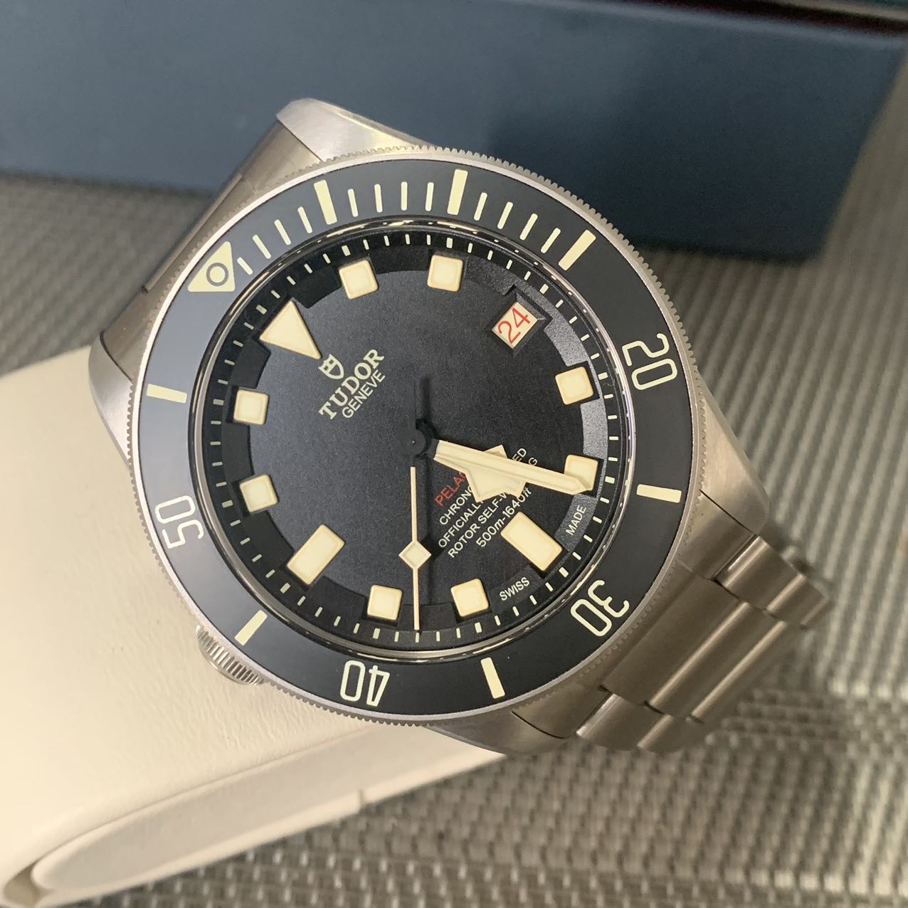 帝舵领潜型LHD 25610TN “左撇子”机械男表,公价3.98万,表径42mm,防水深度500m,全套附件齐全(2021年购买),钛合金材质表壳,哑光黑陶瓷材质表圈,米色夜光指针刻度,搭载新款MT5612-LHD机芯,独有左侧把头设计,惯性微调平衡摆轮、微调螺丝。