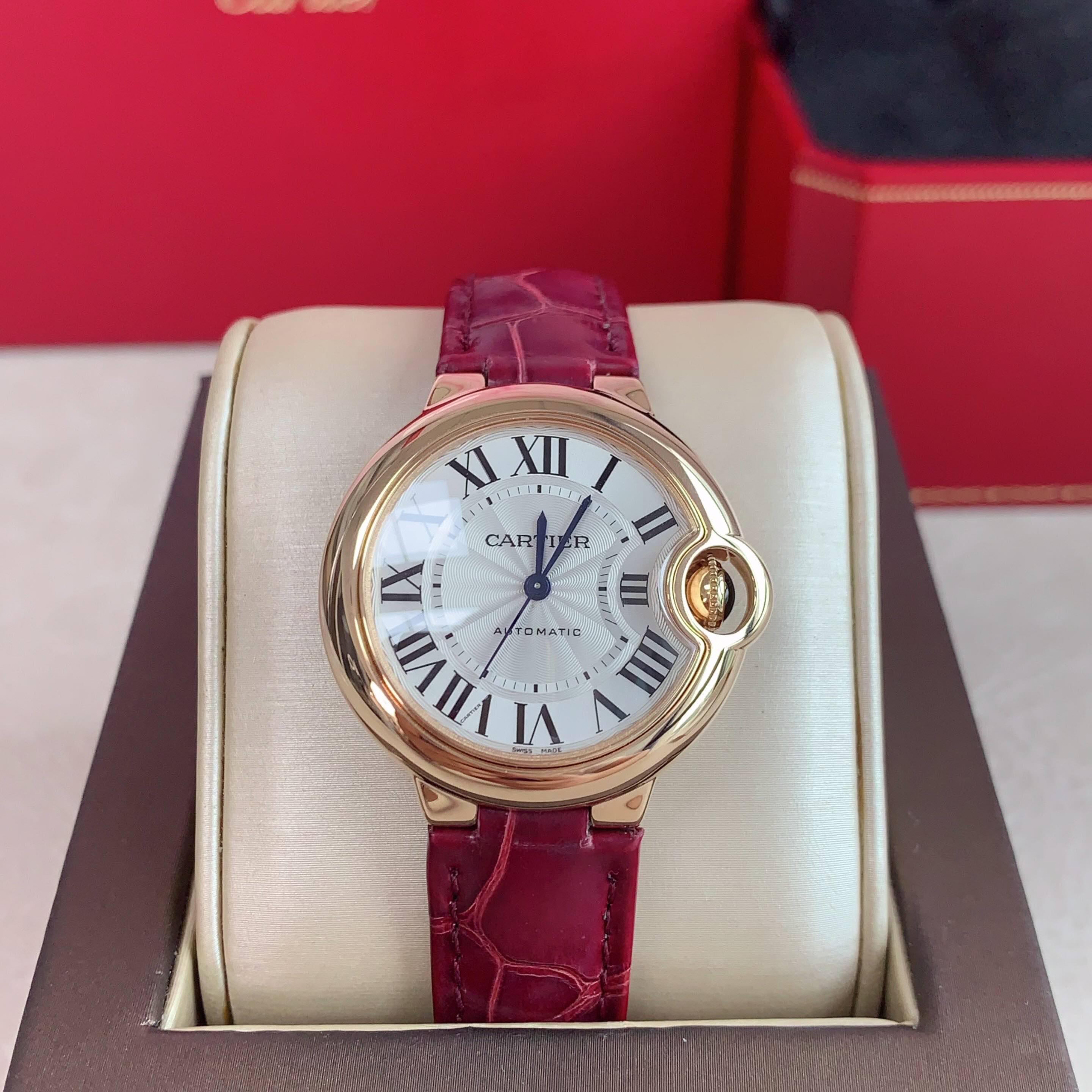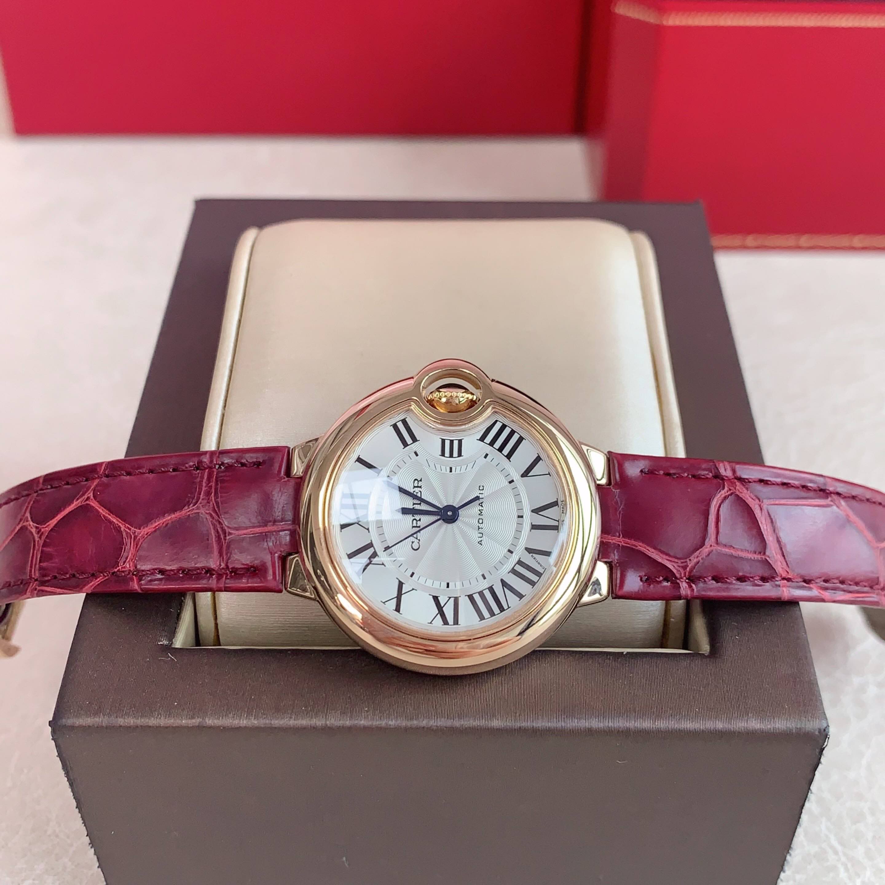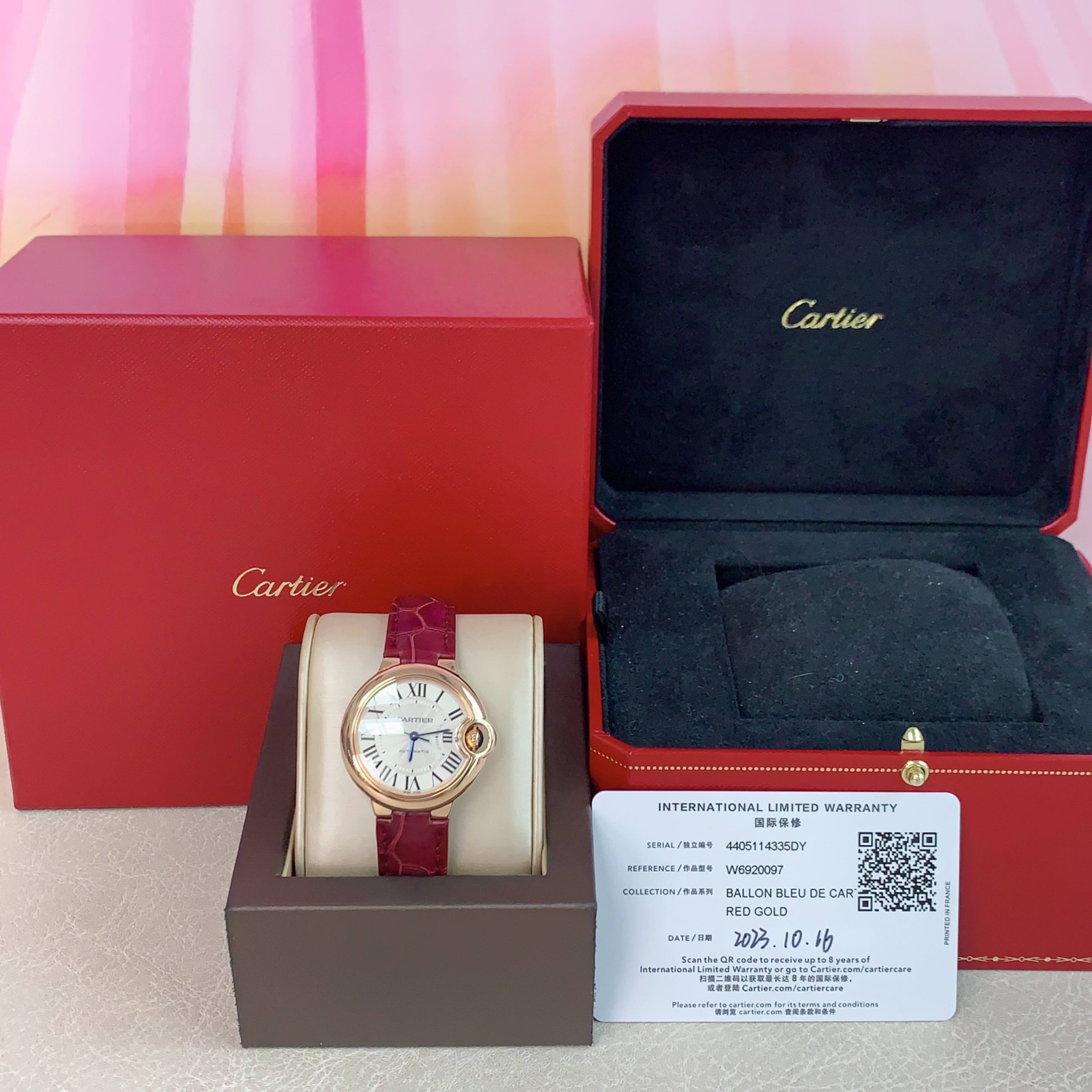卡地亚蓝气球W6920097,自动机械机芯,表径:33mm,表壳厚度:10.16mm,玫瑰金表壳,凹槽式表冠,镶嵌一颗凸圆形蓝宝石,镀银珠光扭索雕纹漆面表盘,12枚罗马数字时标,剑形蓝钢指针,蓝宝石水晶镜面,鳄鱼皮表带,75玫瑰金针扣式表扣。已延保,柜柜价107000~
