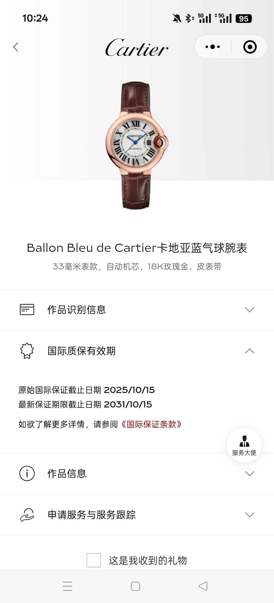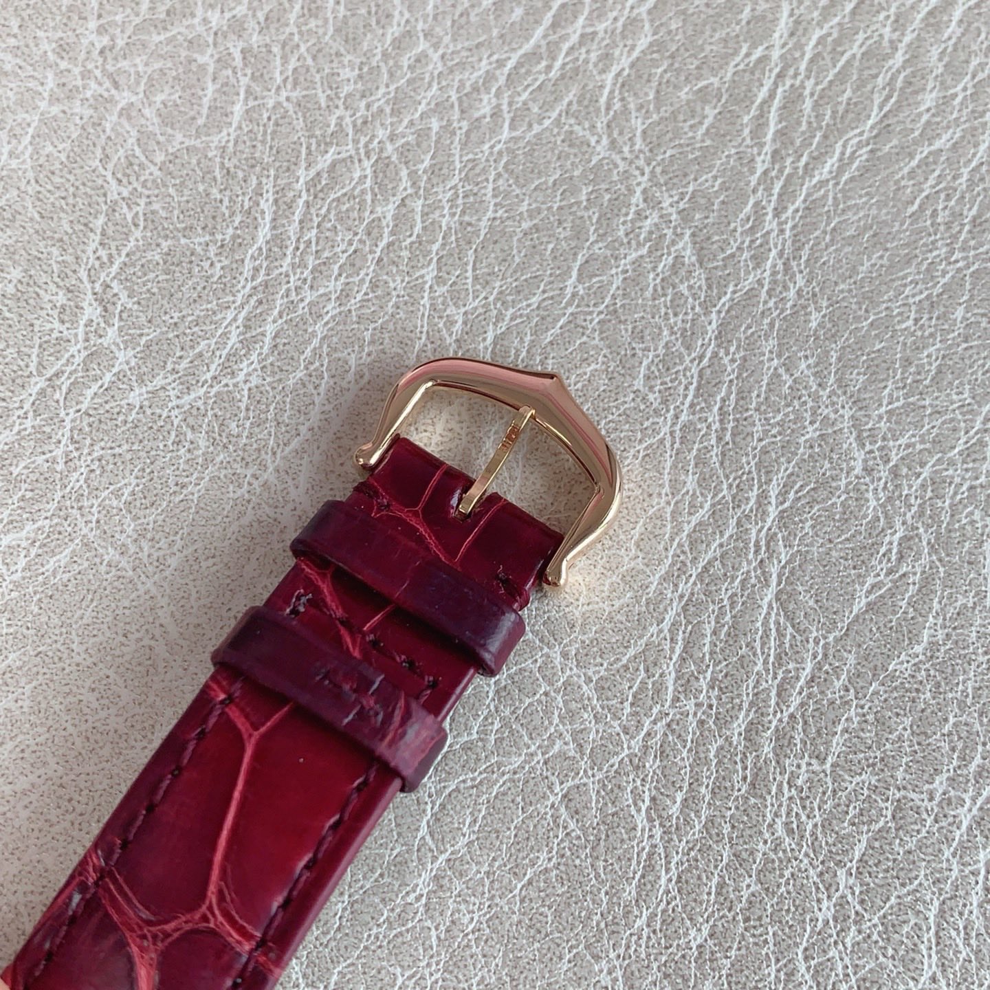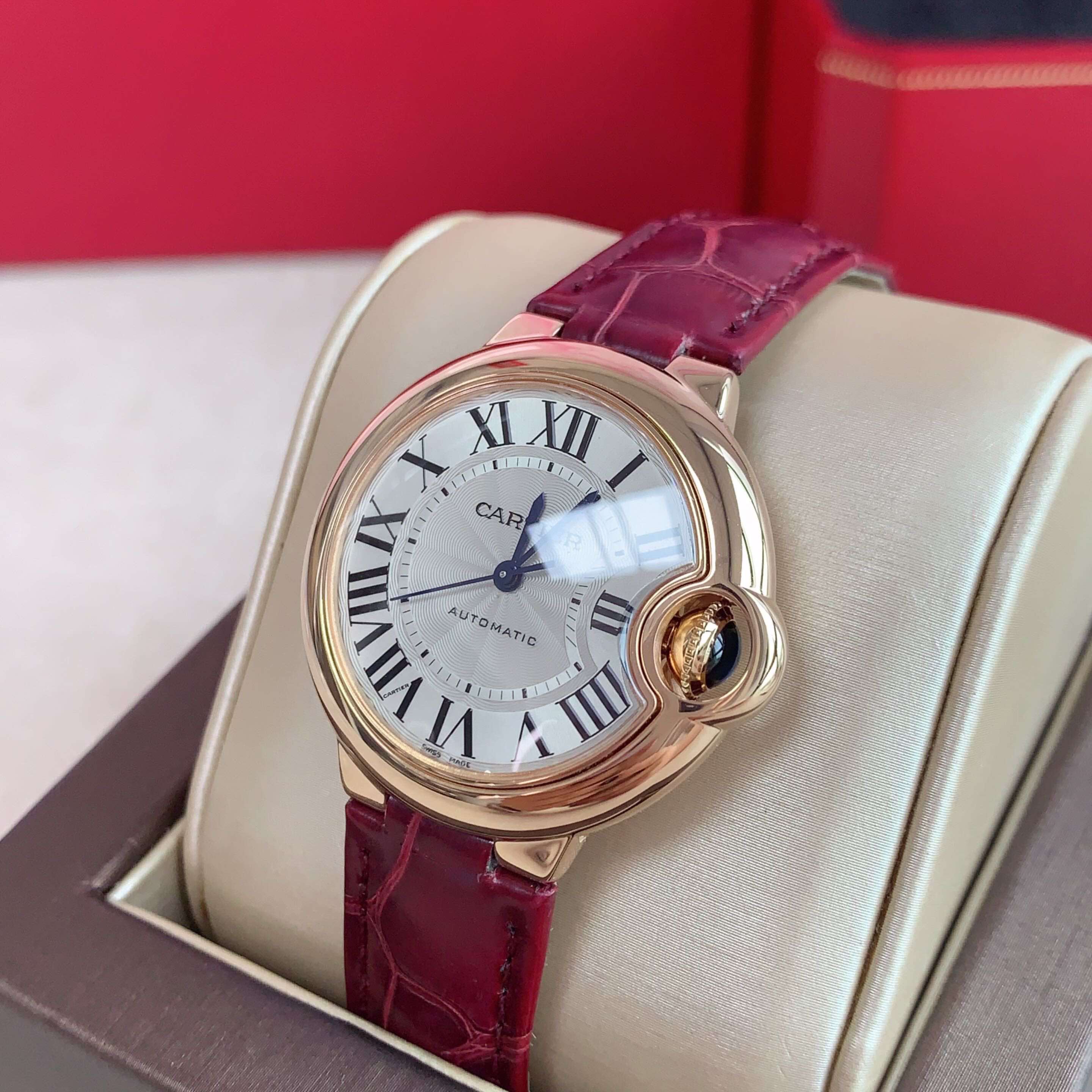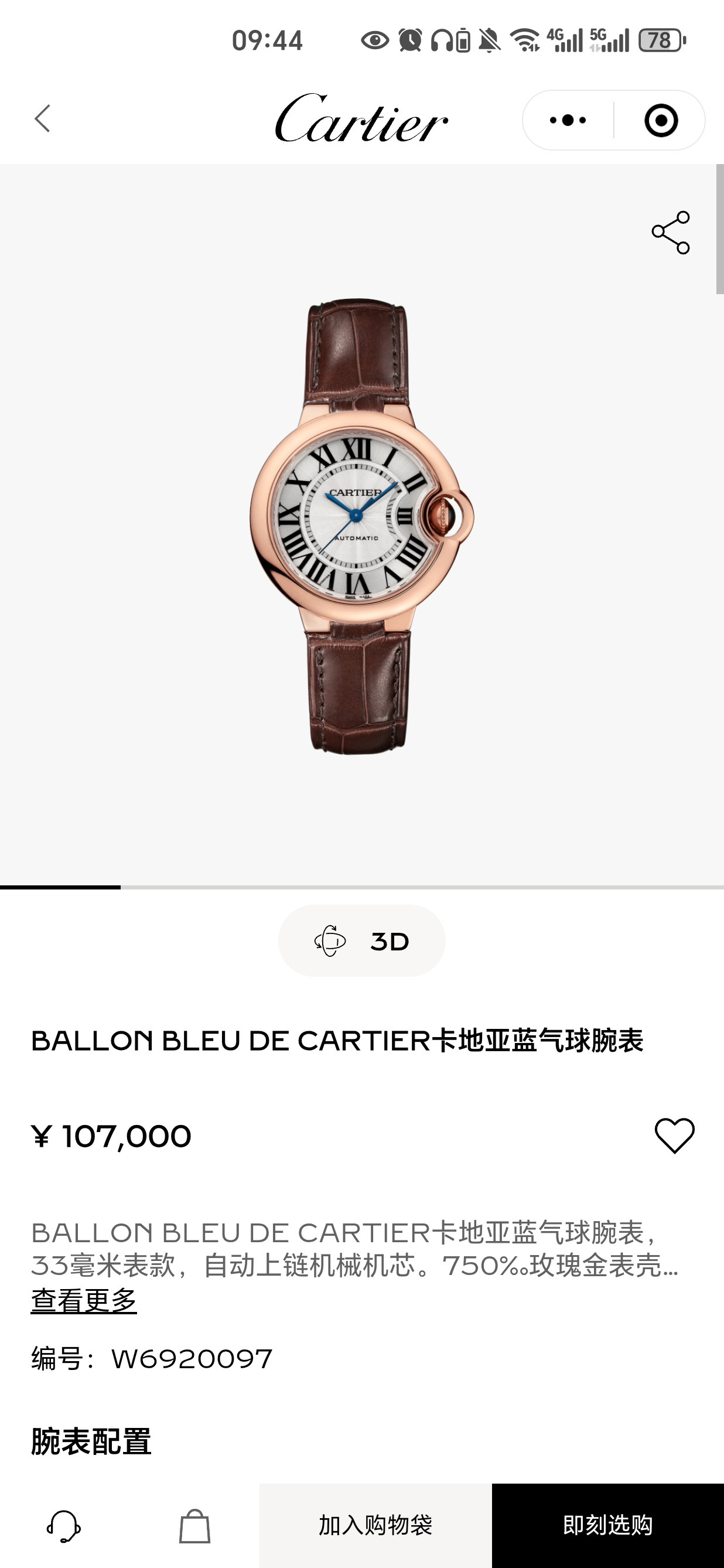 卡地亚蓝气球W6920097,自动机械机芯,表径:33mm,表壳厚度:10.16mm,玫瑰金表壳,凹槽式表冠,镶嵌一颗凸圆形蓝宝石,镀银珠光扭索雕纹漆面表盘,12枚罗马数字时标,剑形蓝钢指针,蓝宝石水晶镜面,鳄鱼皮表带,75玫瑰金针扣式表扣。已延保,柜柜价107000~